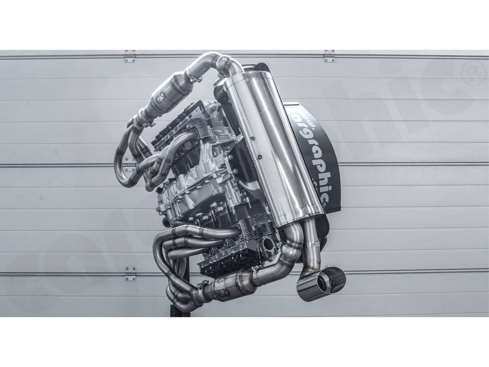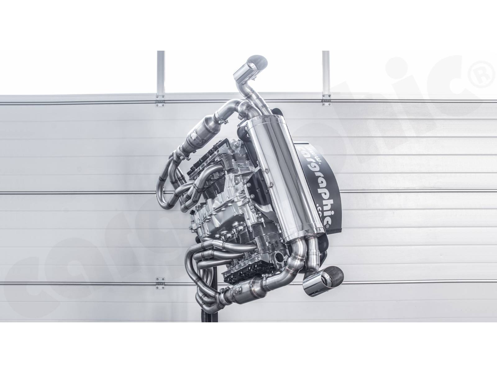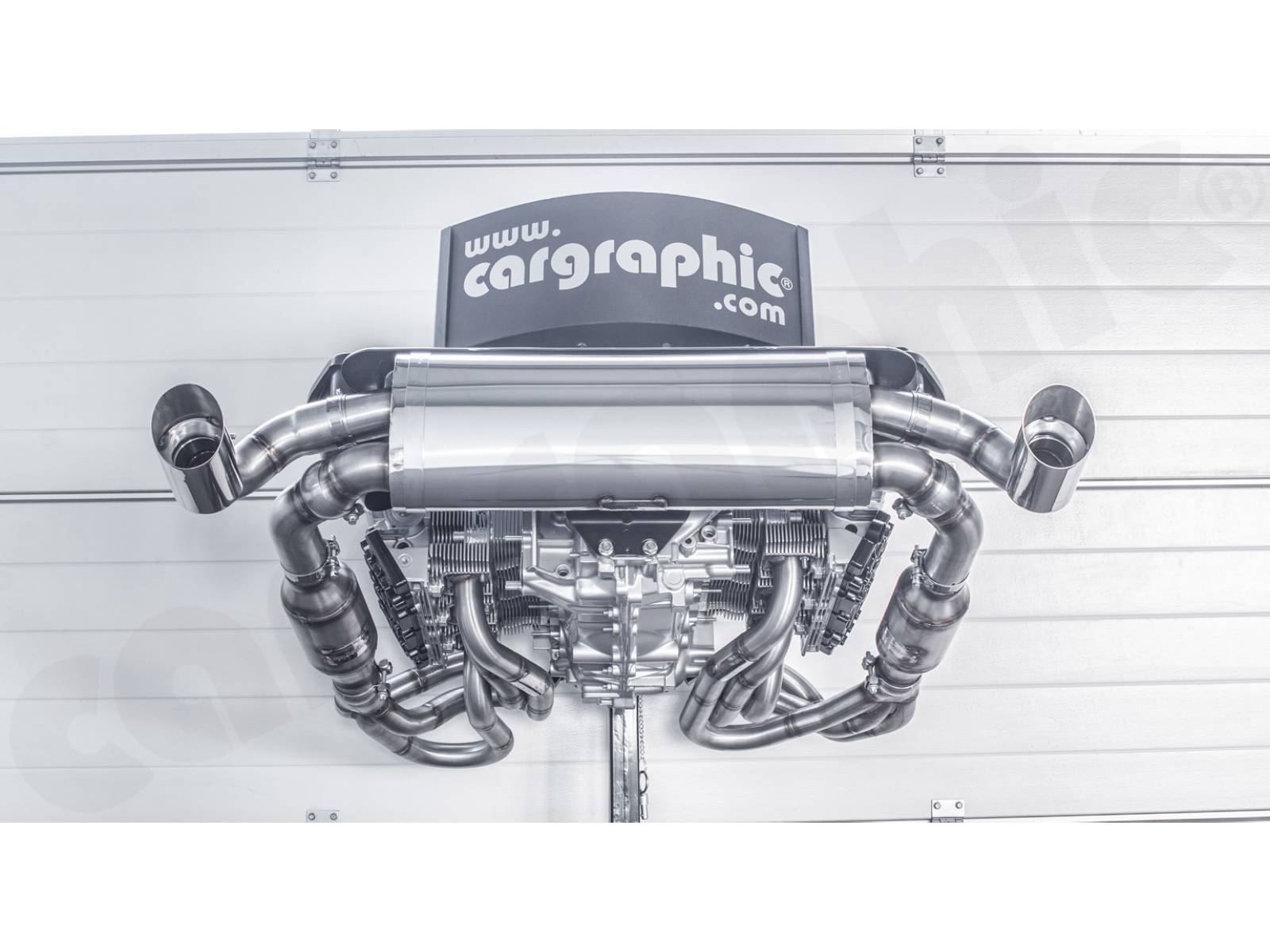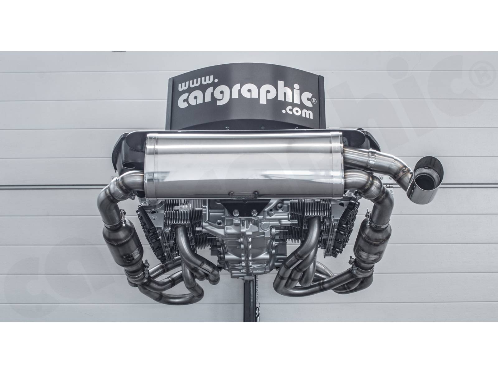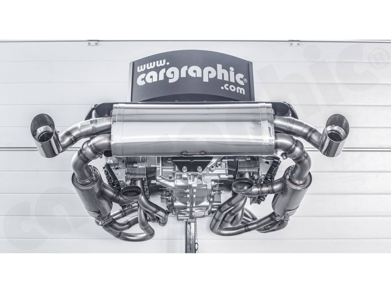 Sistema di scarico sportivo CARGRAPHIC GT con collettori ID45 GT, con/senza catalizzatori da 200 cpsi, con riscaldamento e silenziatore posteriore AQ a doppio flusso con uscita terminale sinistra e destra.