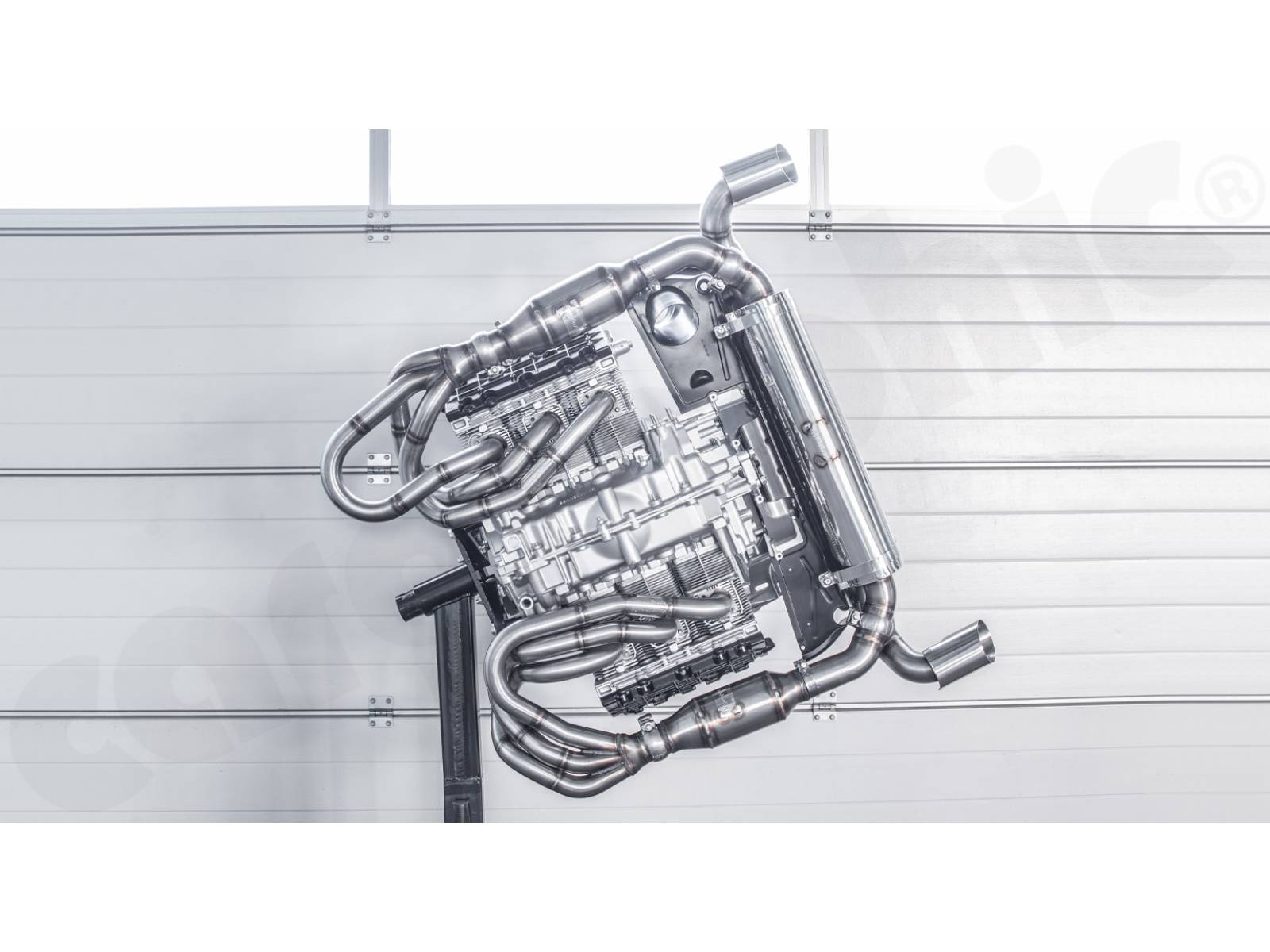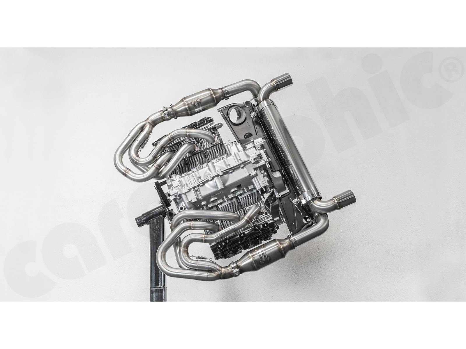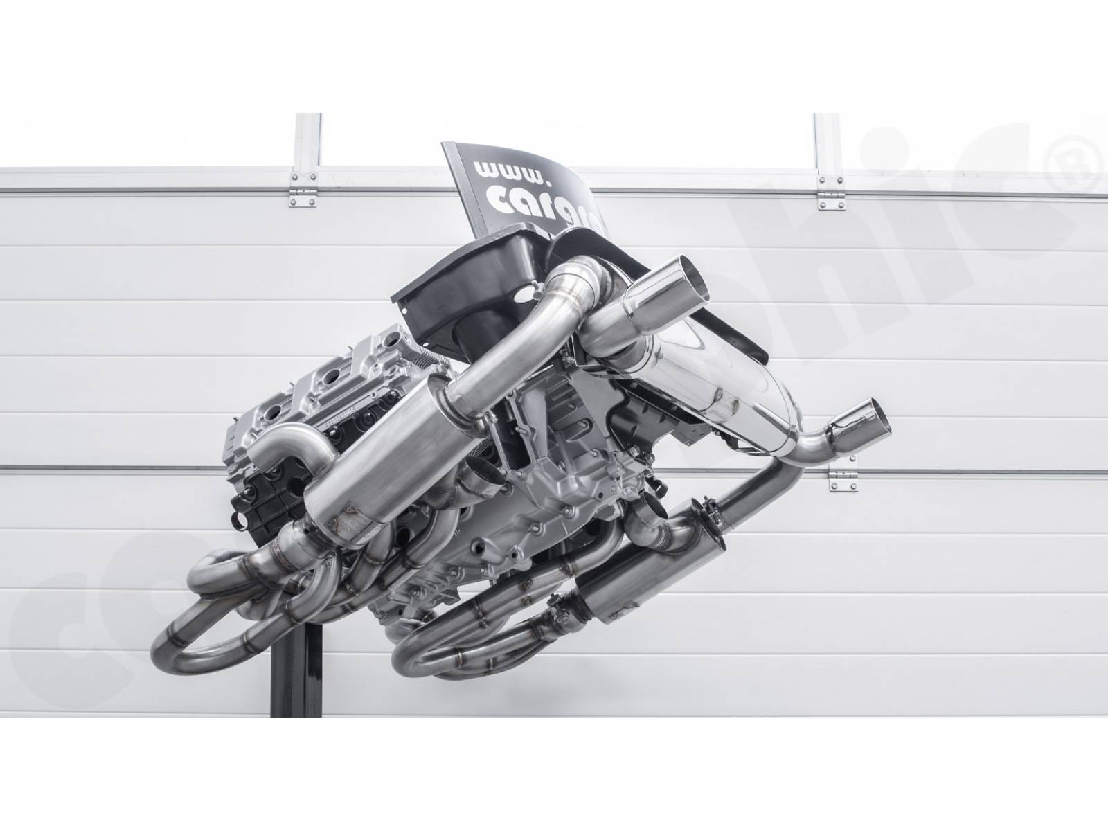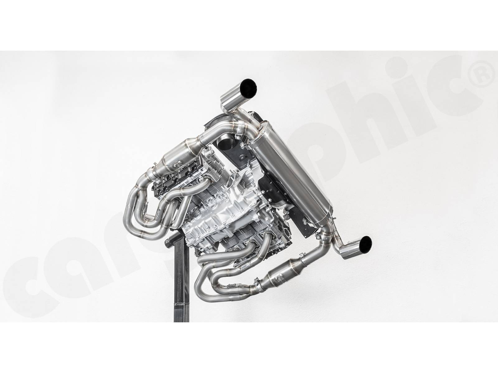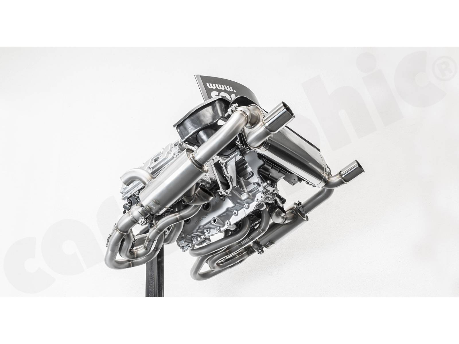 Sistema di scarico sportivo CARGRAPHIC GT con collettori ID45 GT, con/senza catalizzatori da 200 cpsi, con riscaldamento e silenziatore posteriore AQ a doppio flusso con uscita terminale sinistra e destra.