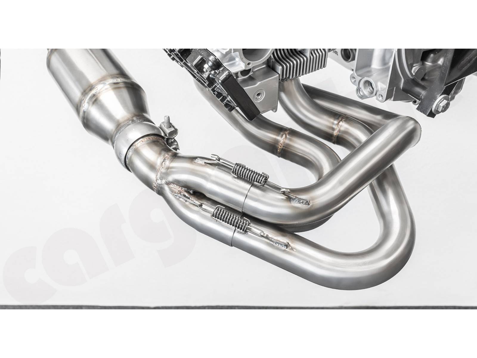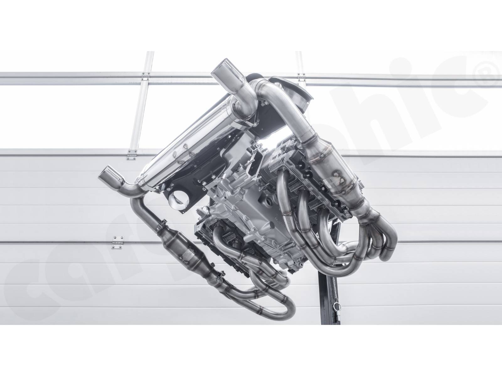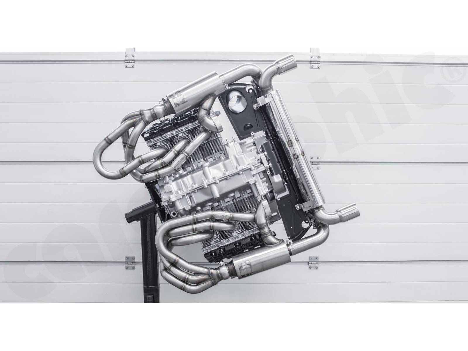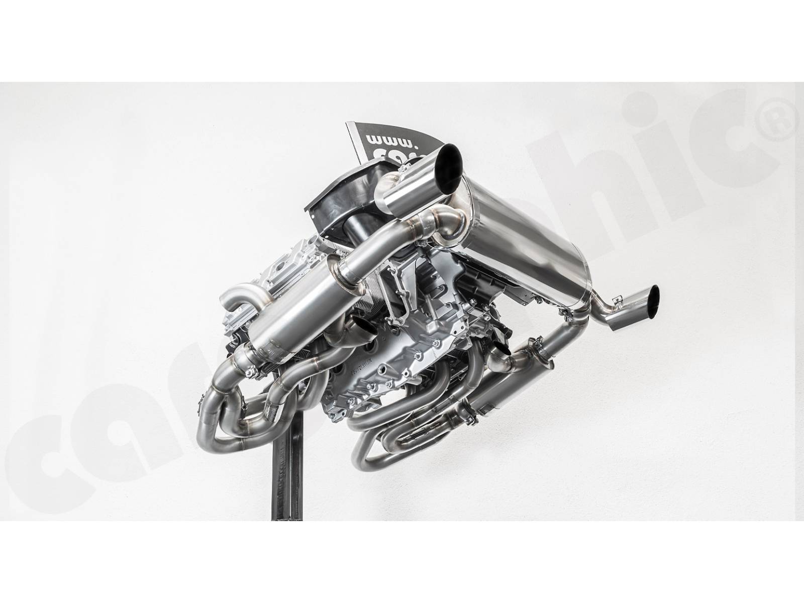 Sistema di scarico sportivo CARGRAPHIC GT con collettori ID45 GT, con/senza catalizzatori da 200 cpsi, con riscaldamento e silenziatore posteriore AQ a doppio flusso con uscita terminale sinistra e destra.