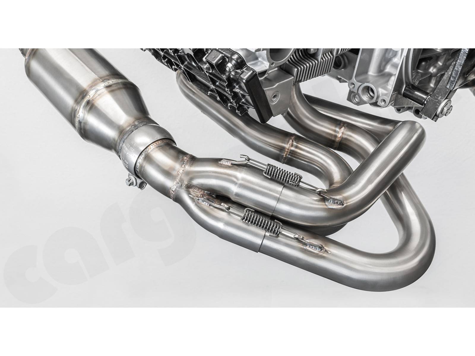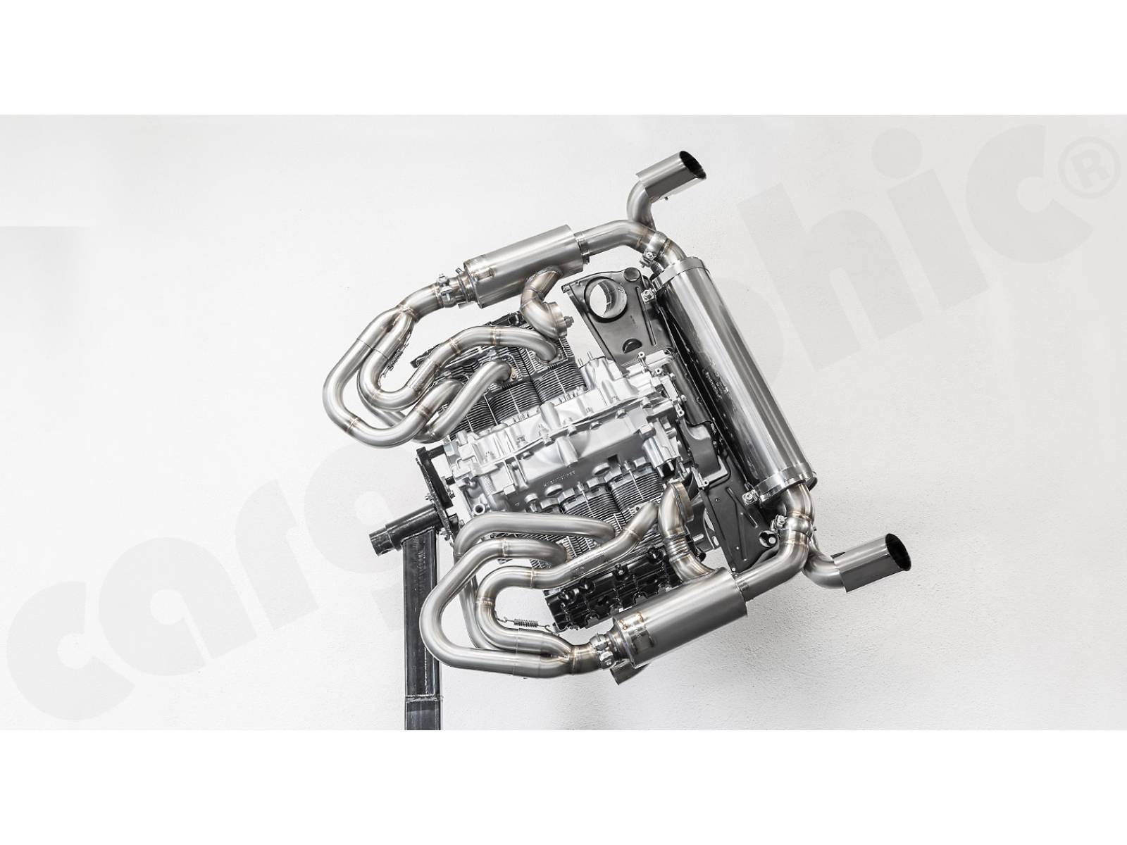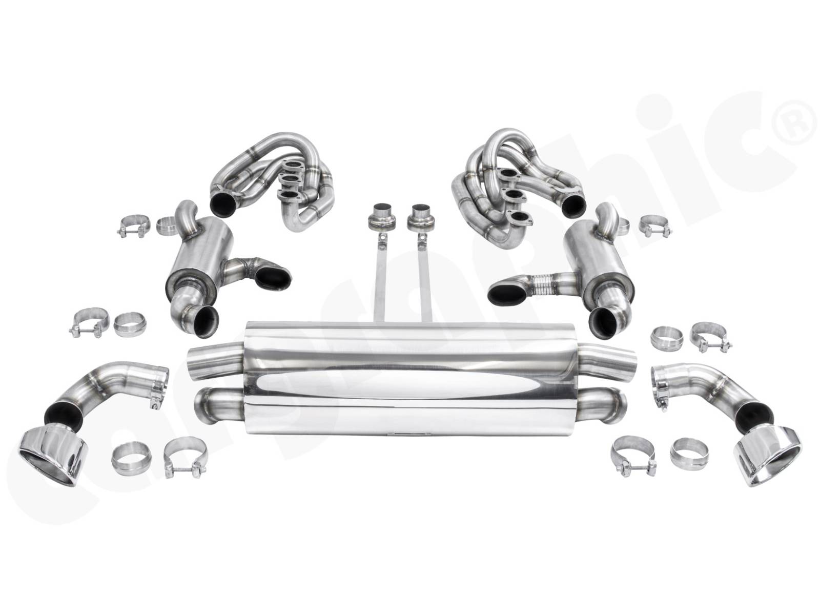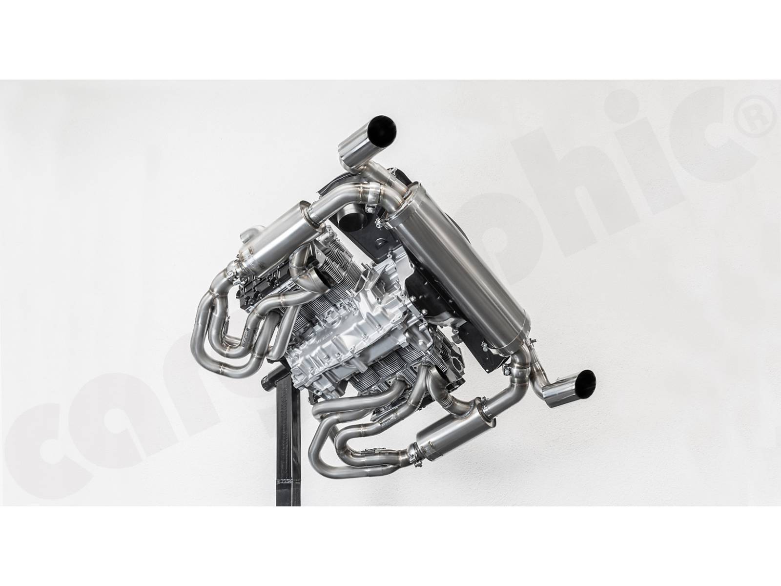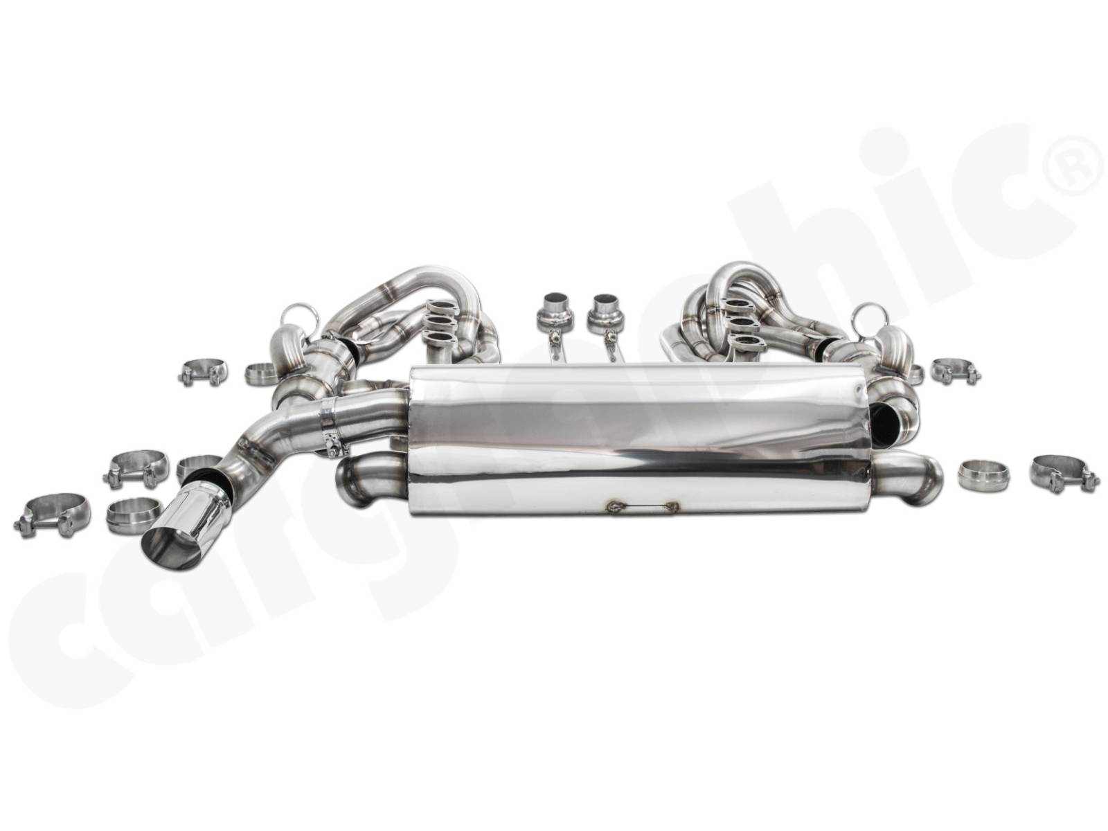 Sistema di scarico sportivo CARGRAPHIC GT con collettori ID45 GT, con/senza catalizzatori da 200 cpsi, con riscaldamento e silenziatore posteriore AQ a doppio flusso con uscita terminale sinistra e destra.