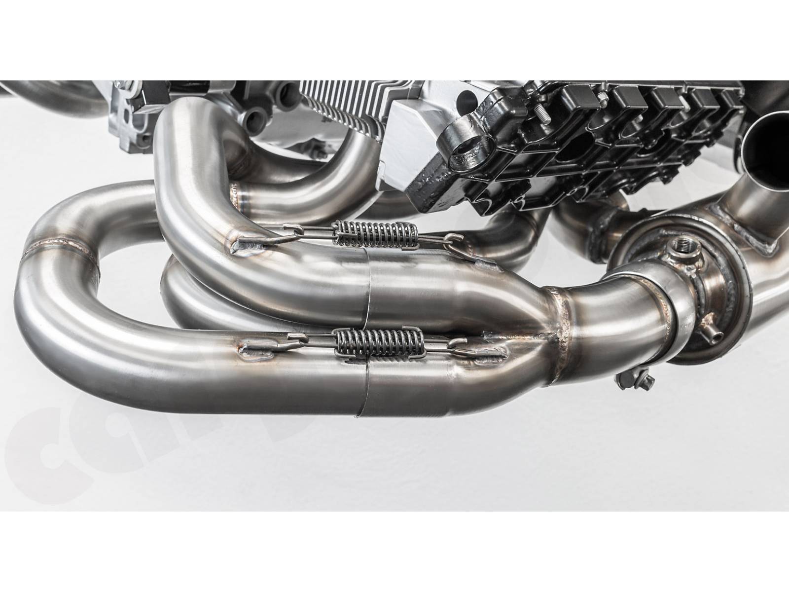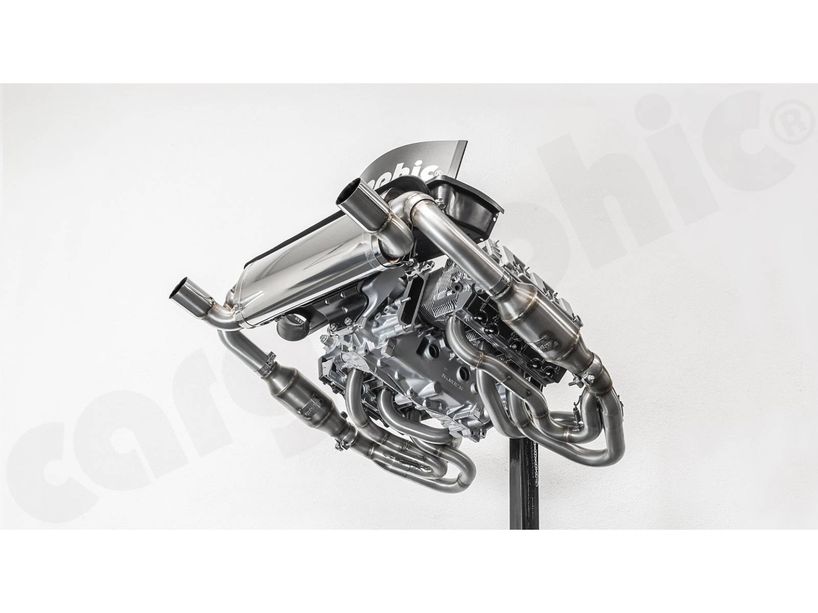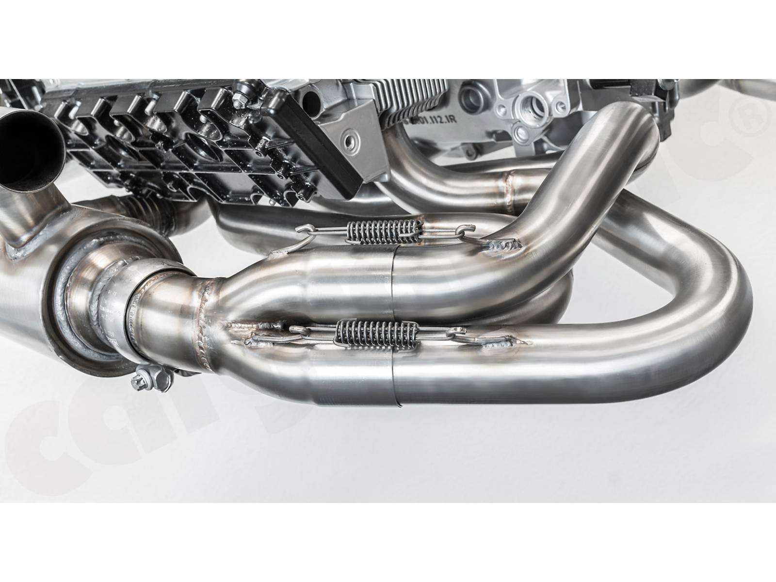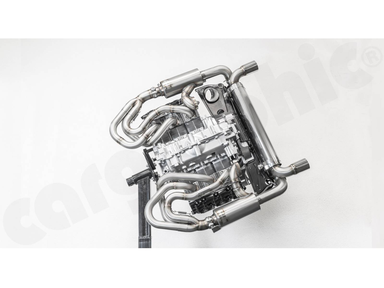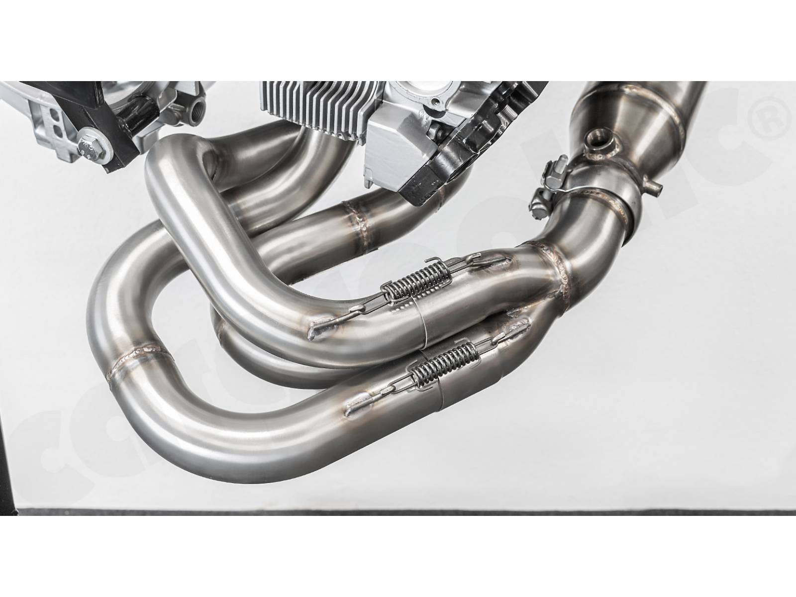 Sistema di scarico sportivo CARGRAPHIC GT con collettori ID45 GT, con/senza catalizzatori da 200 cpsi, con riscaldamento e silenziatore posteriore AQ a doppio flusso con uscita terminale sinistra e destra.
