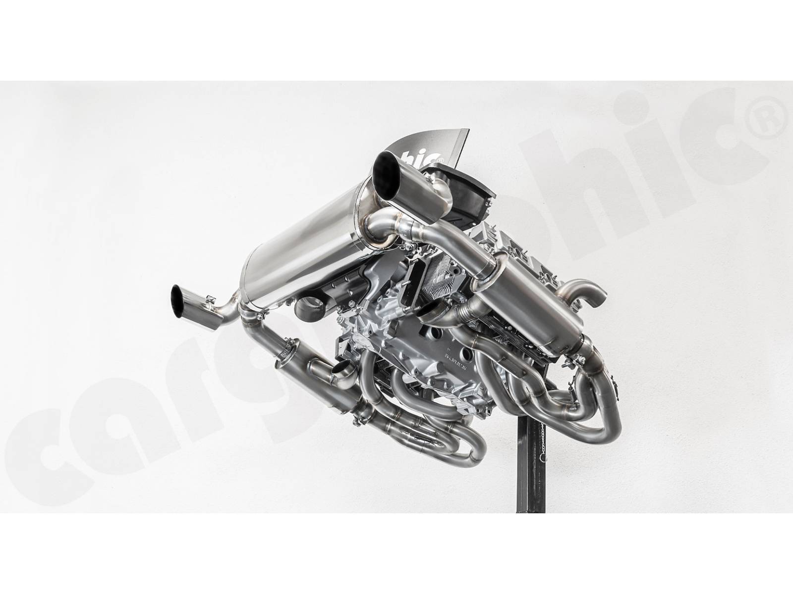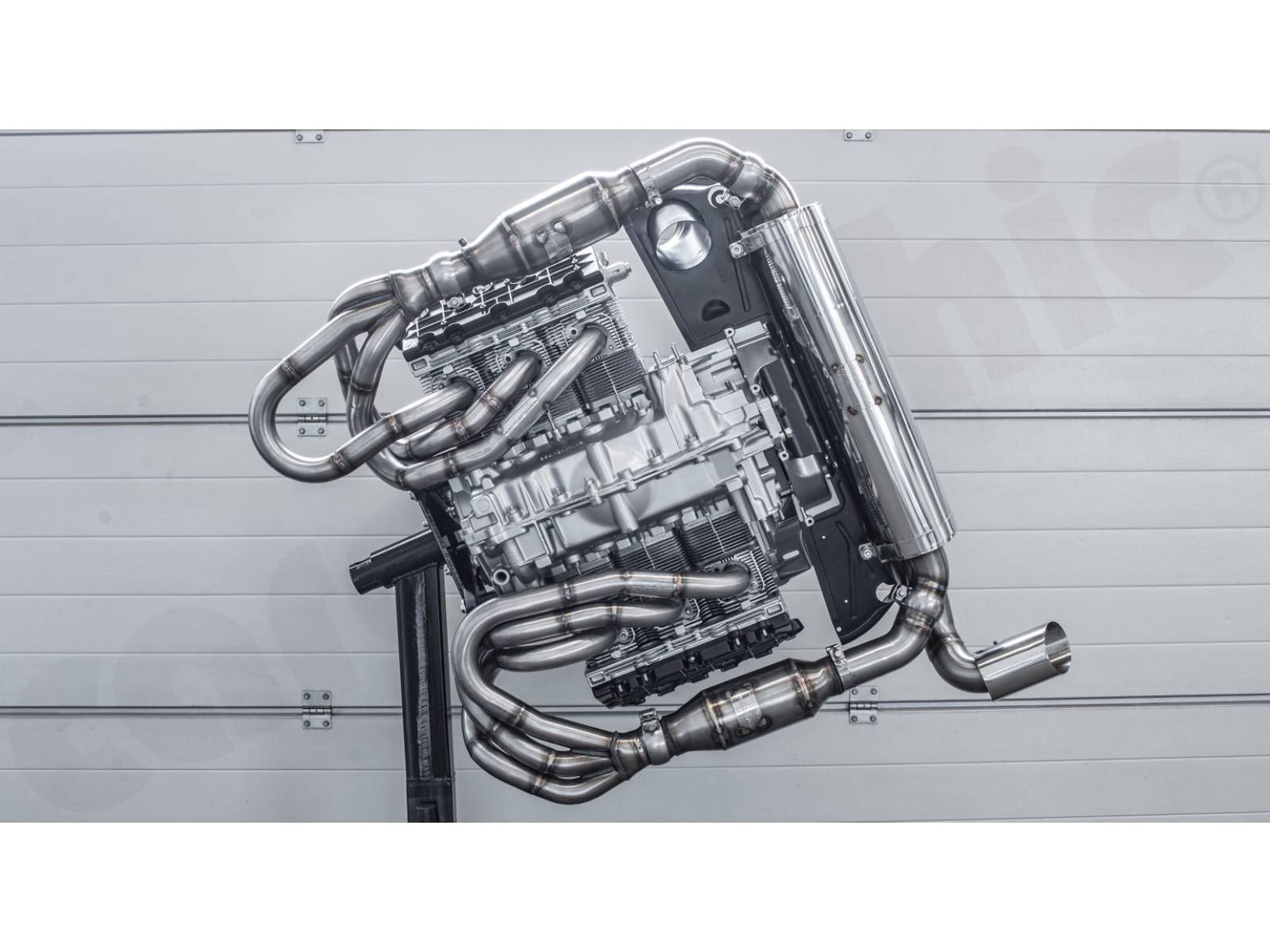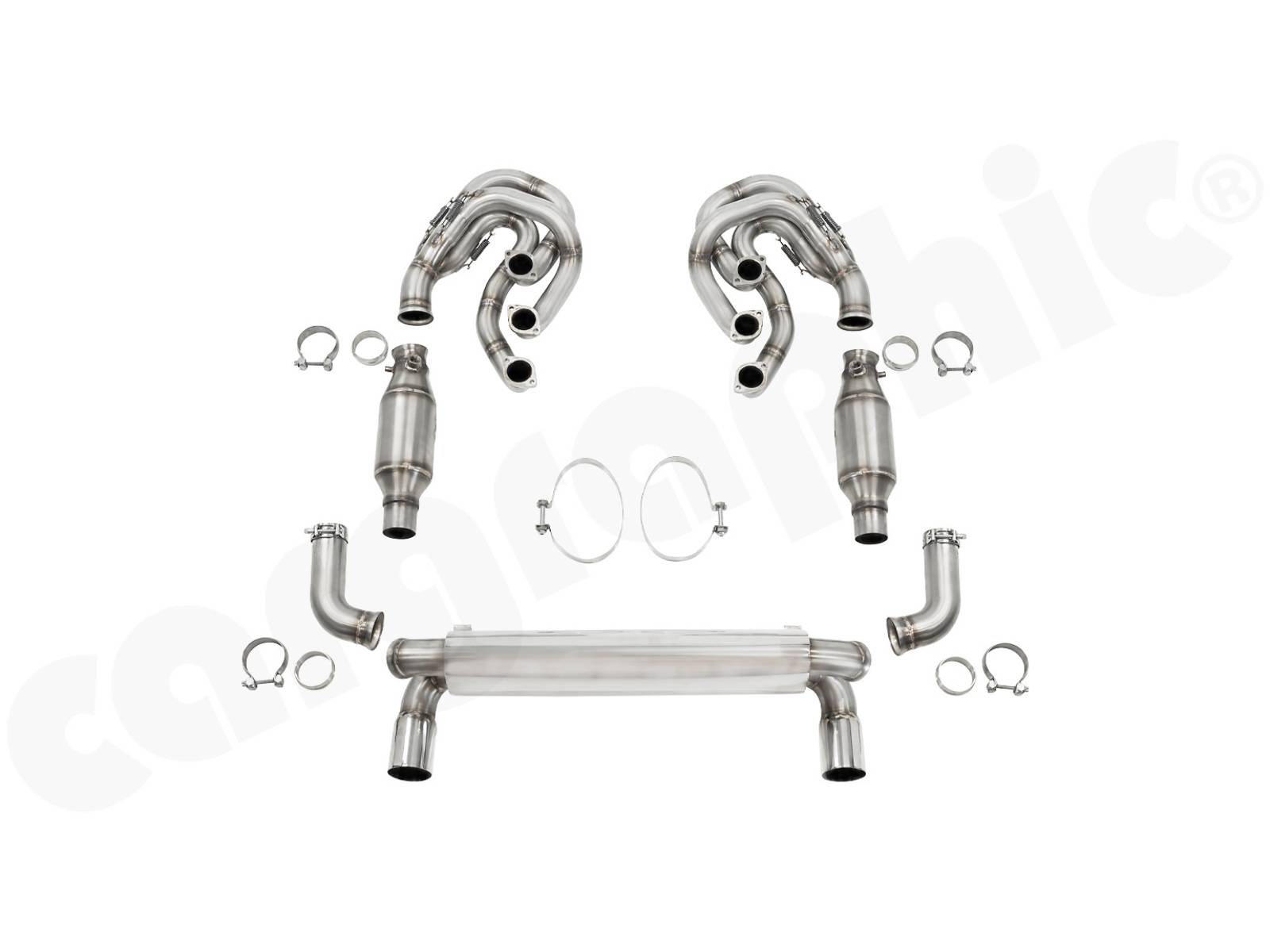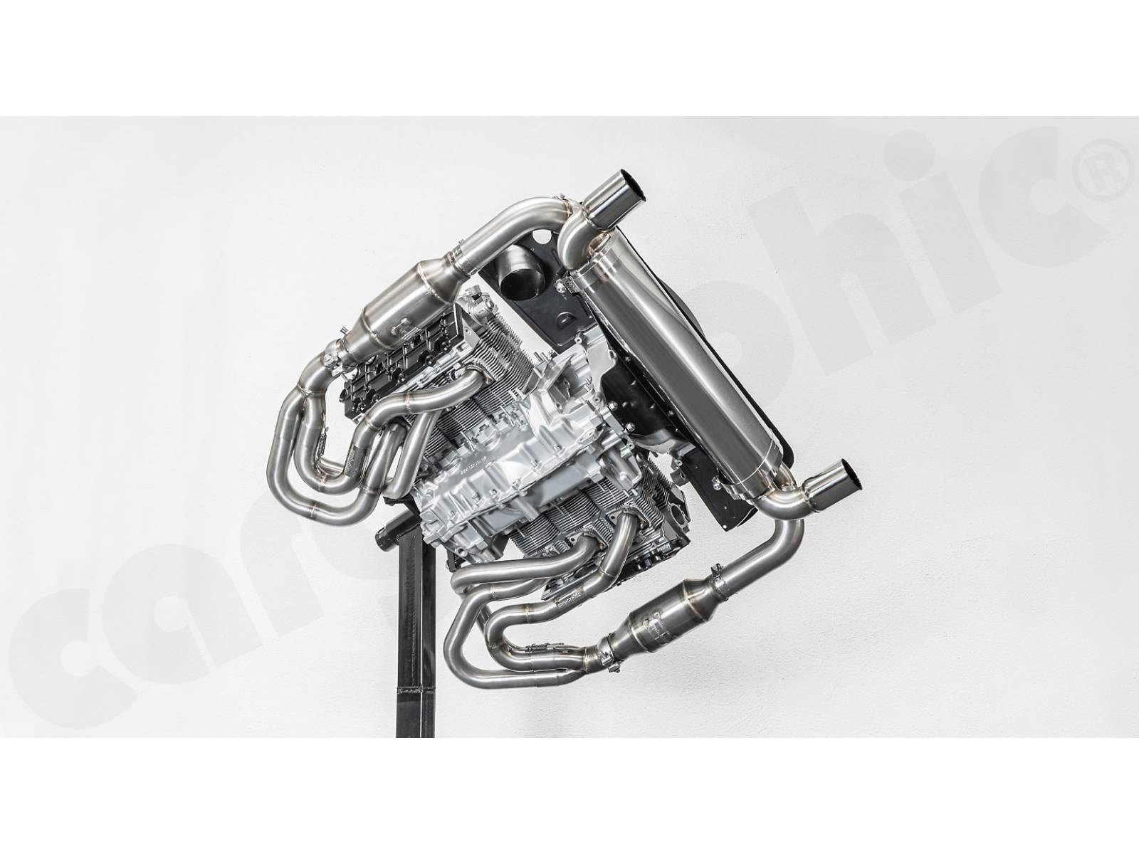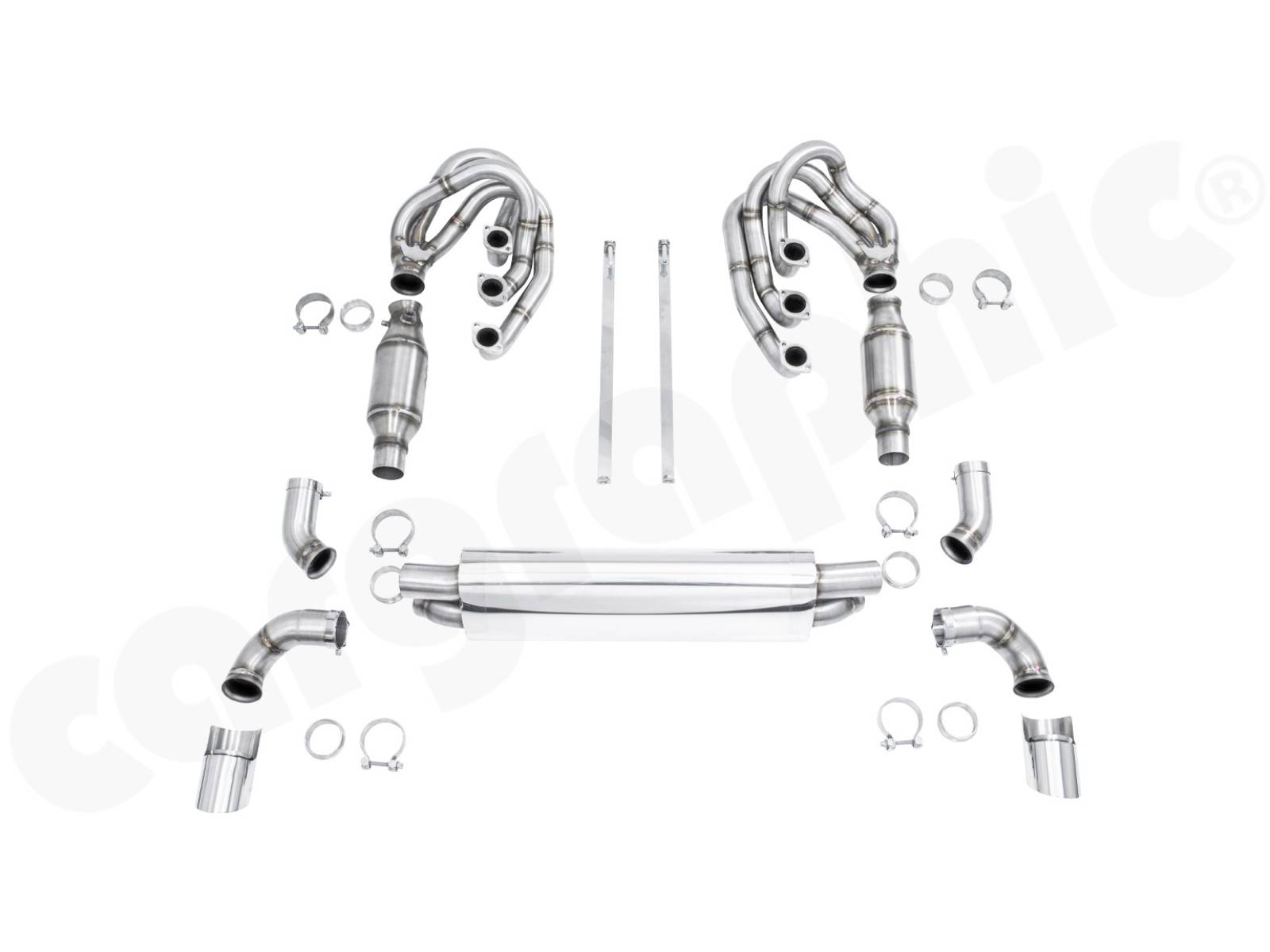 Sistema di scarico sportivo CARGRAPHIC GT con collettori ID45 GT, con/senza catalizzatori da 200 cpsi, con riscaldamento e silenziatore posteriore AQ a doppio flusso con uscita terminale sinistra e destra.
