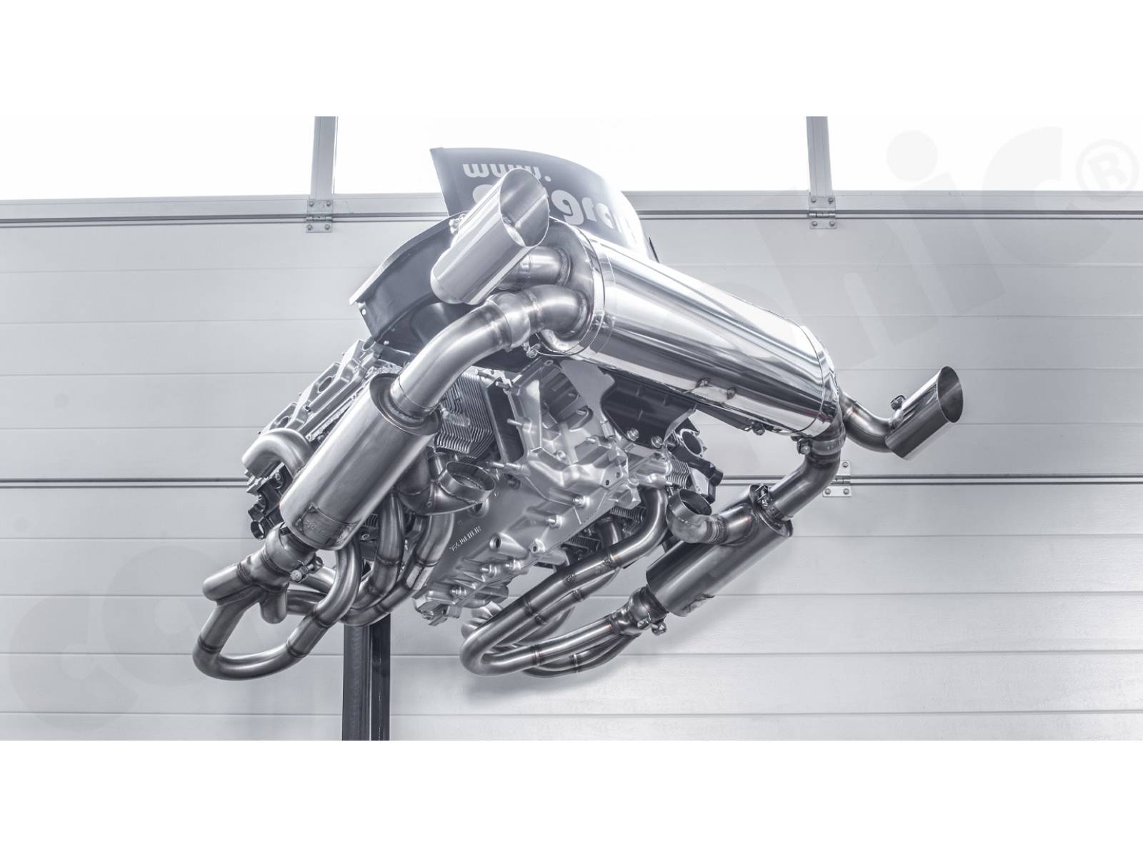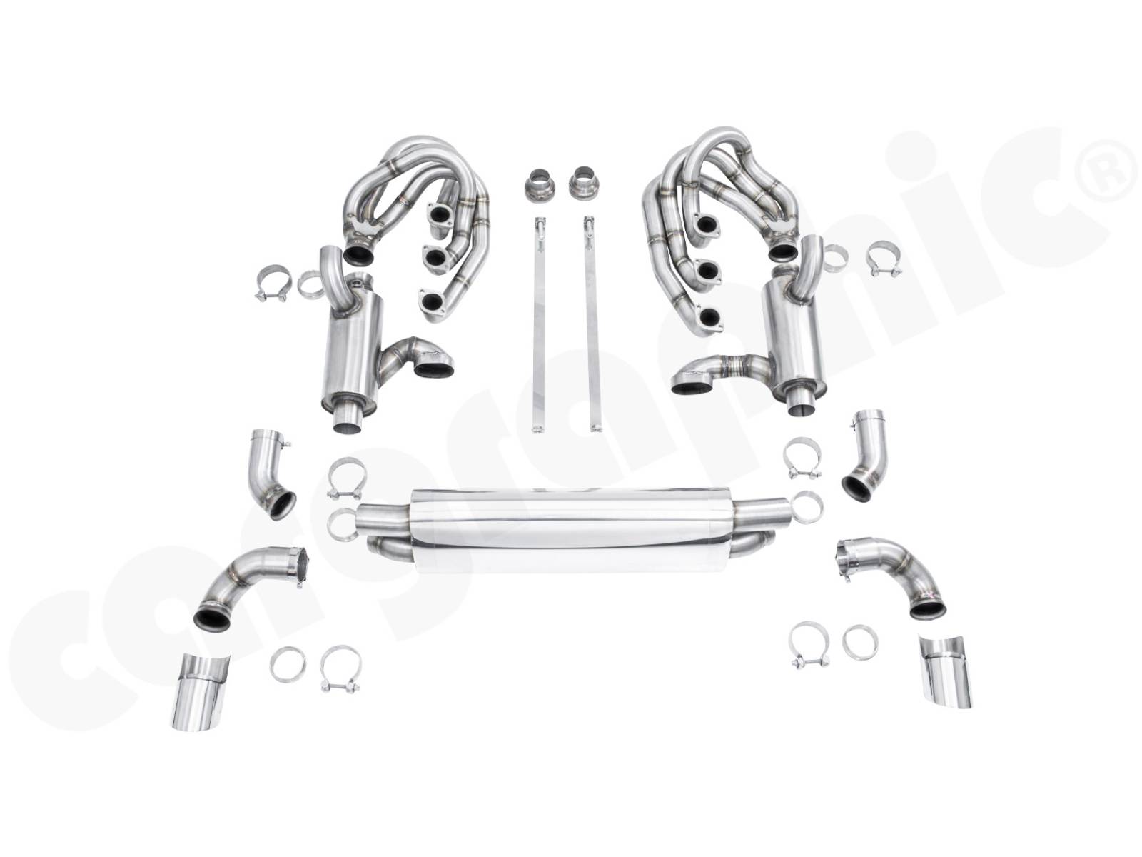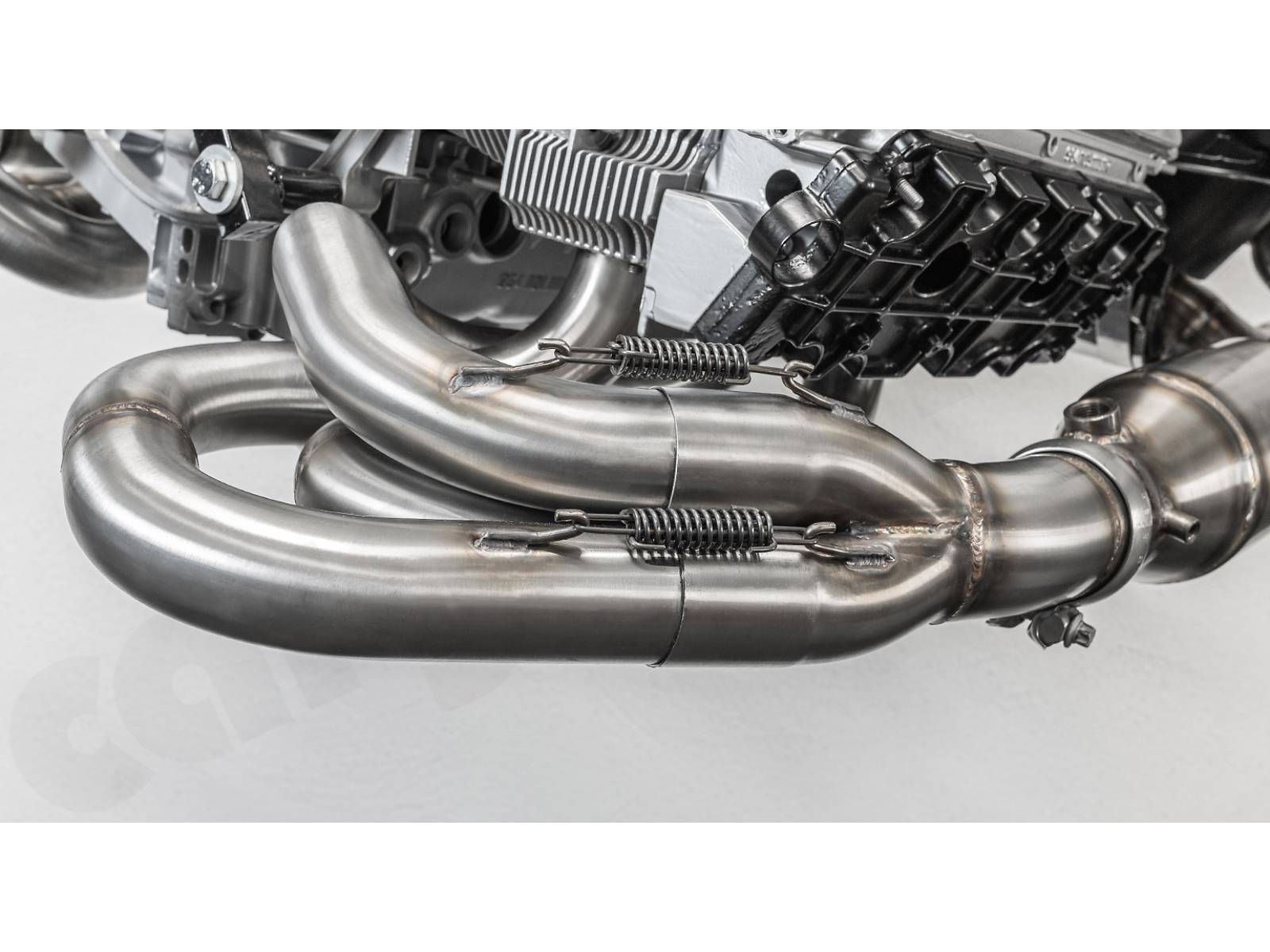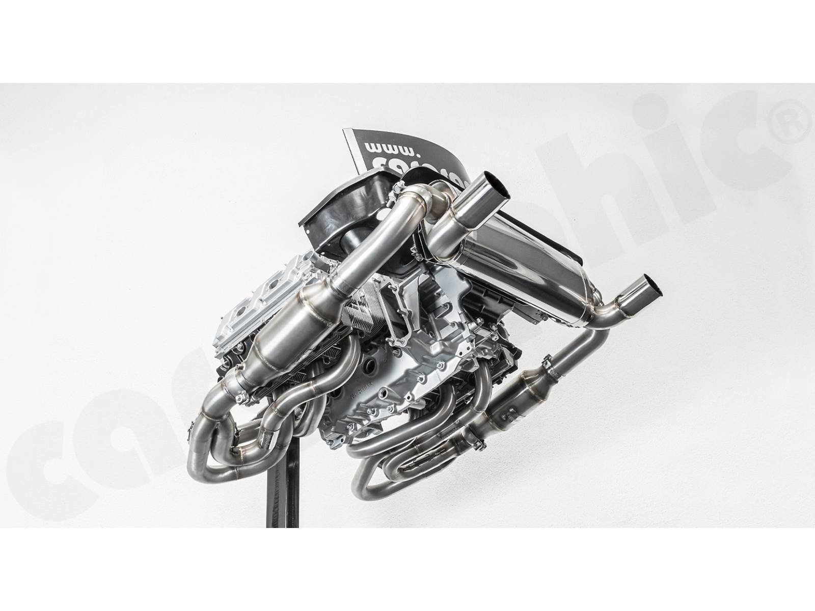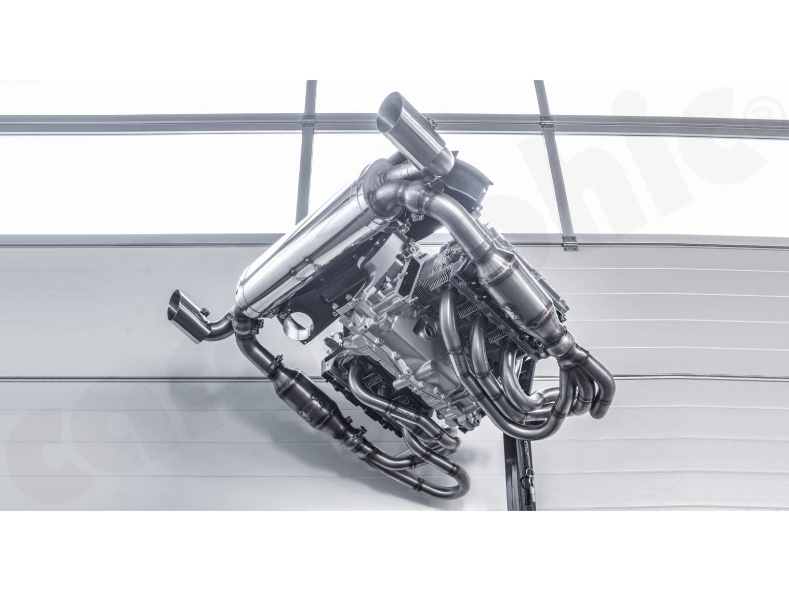 Sistema di scarico sportivo CARGRAPHIC GT con collettori ID45 GT, con/senza catalizzatori da 200 cpsi, con riscaldamento e silenziatore posteriore AQ a doppio flusso con uscita terminale sinistra e destra.