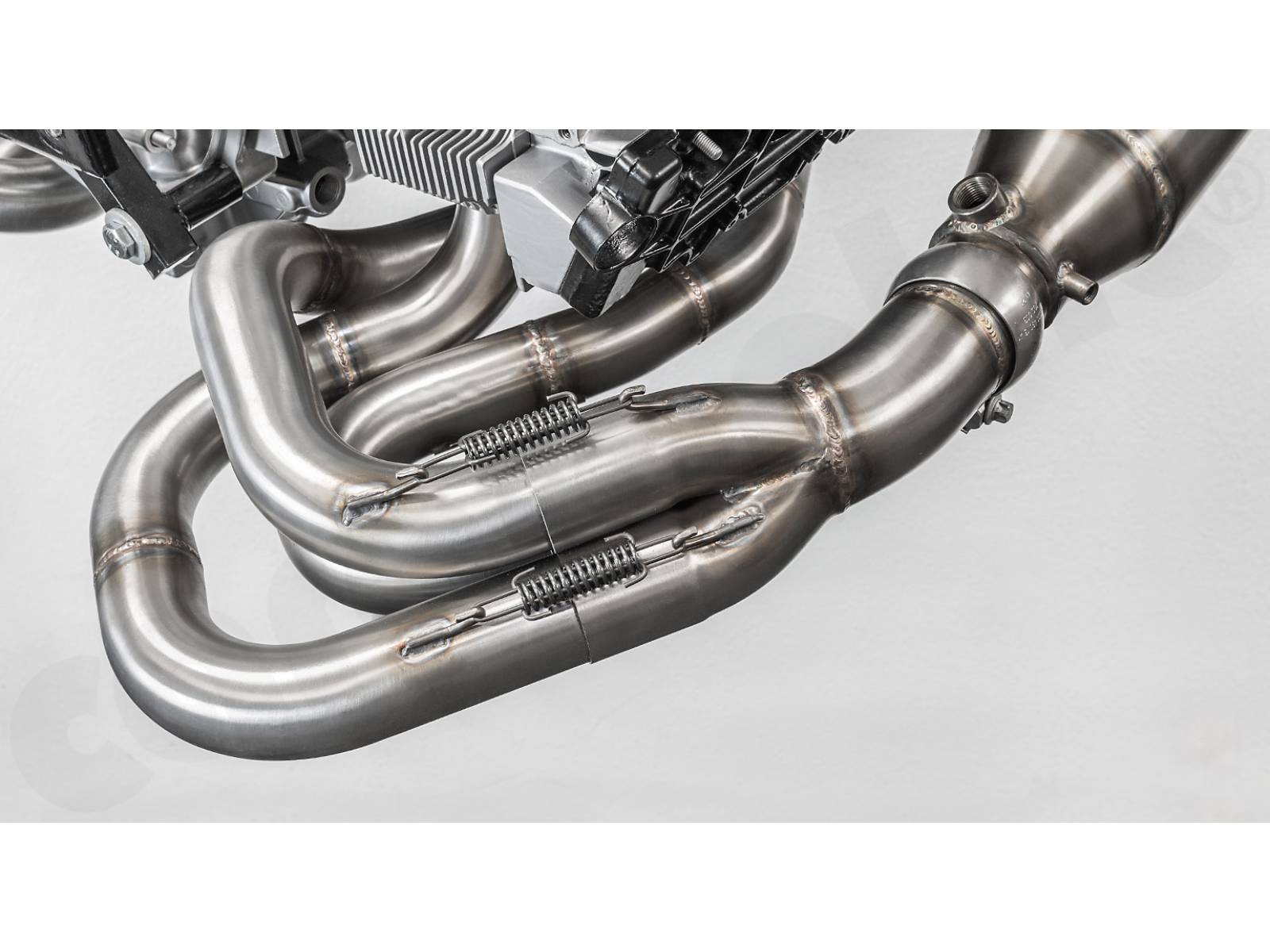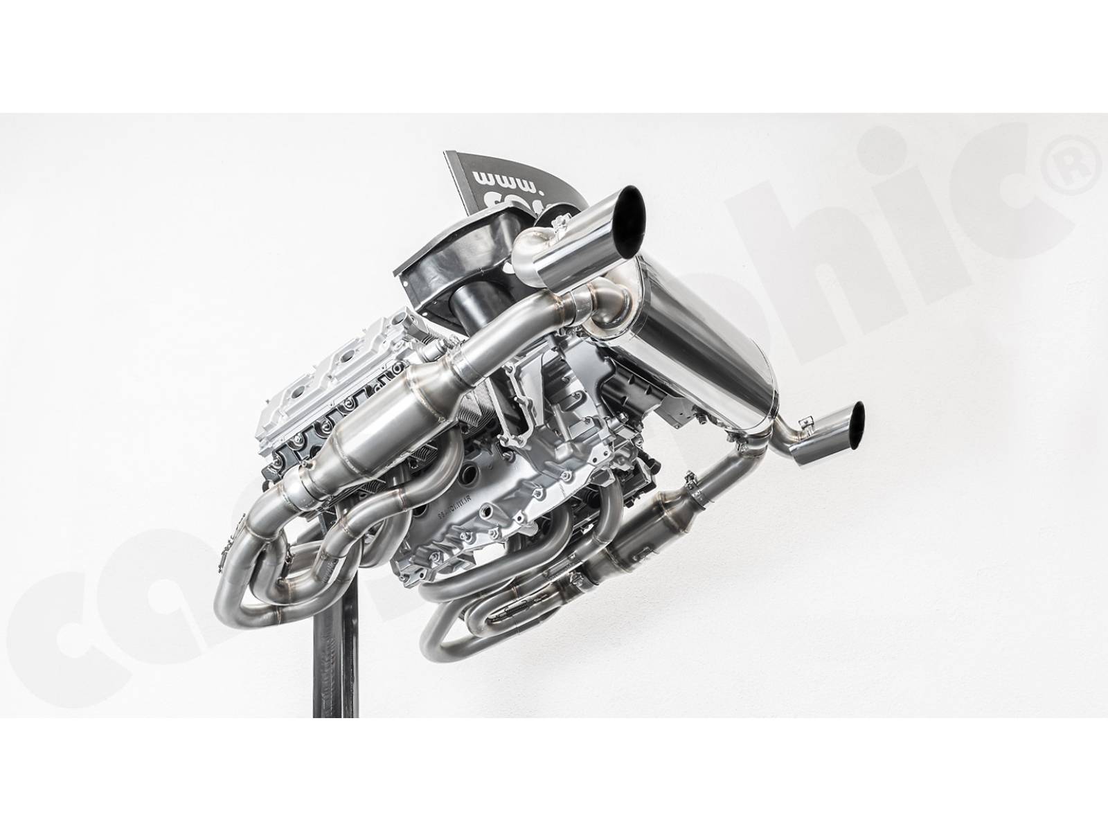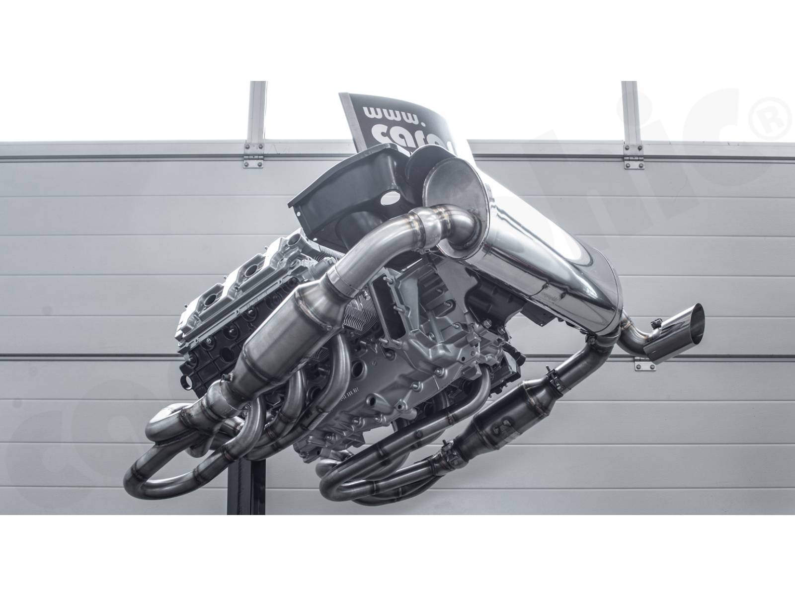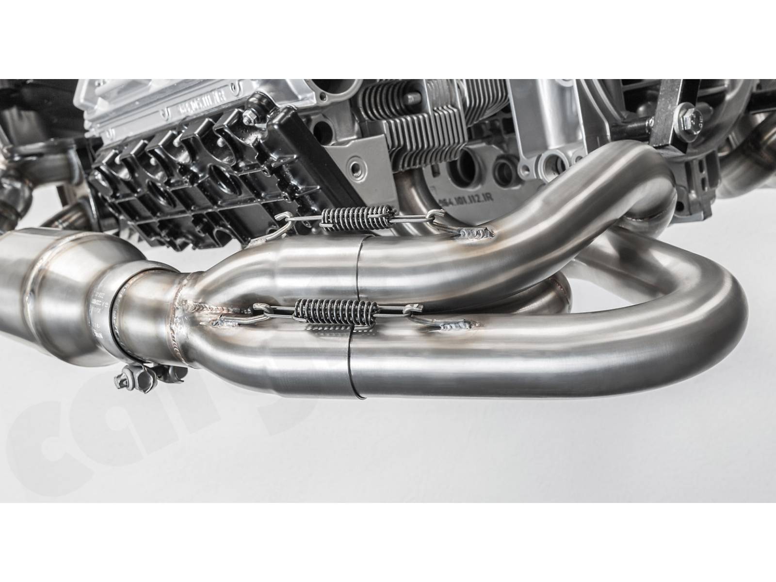 Sistema di scarico sportivo CARGRAPHIC GT con collettori ID45 GT, con/senza catalizzatori da 200 cpsi, con riscaldamento e silenziatore posteriore AQ a doppio flusso con uscita terminale sinistra e destra.