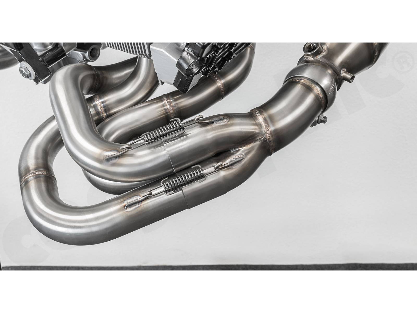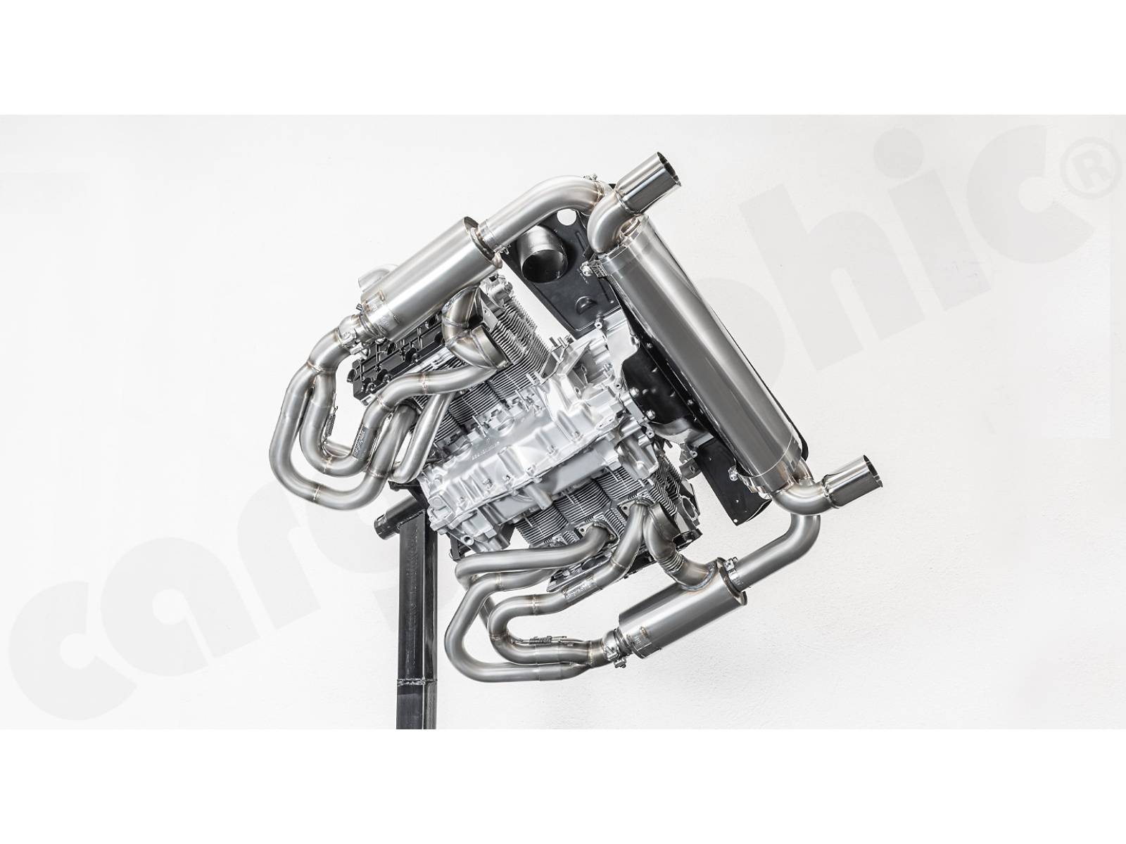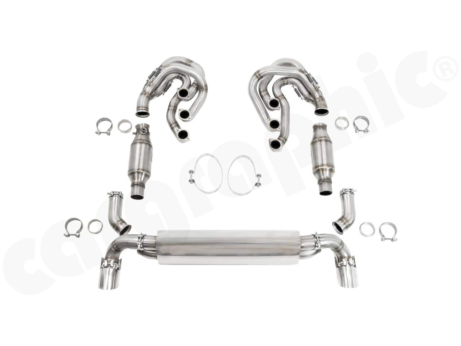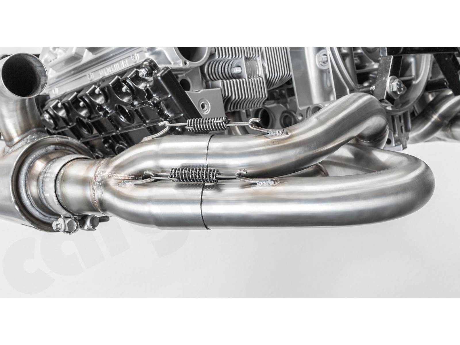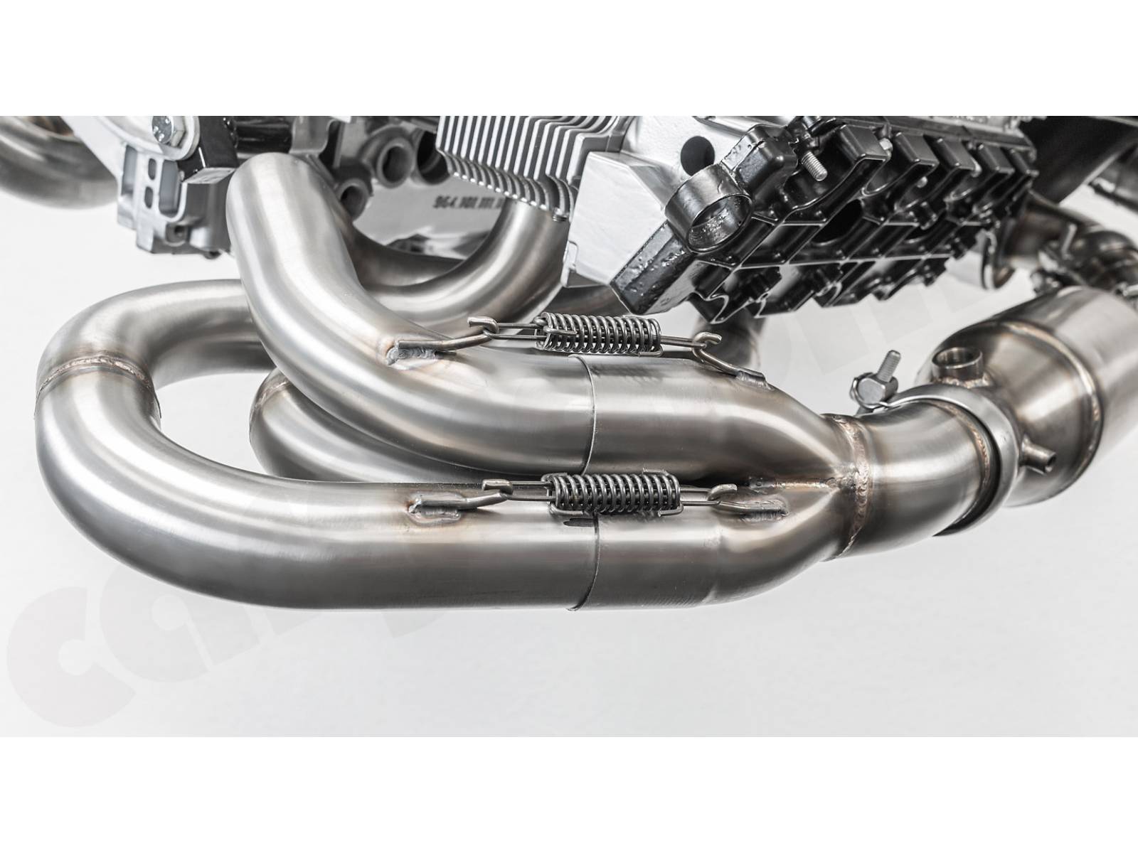 Sistema di scarico sportivo CARGRAPHIC GT con collettori ID45 GT, con/senza catalizzatori da 200 cpsi, con riscaldamento e silenziatore posteriore AQ a doppio flusso con uscita terminale sinistra e destra.
