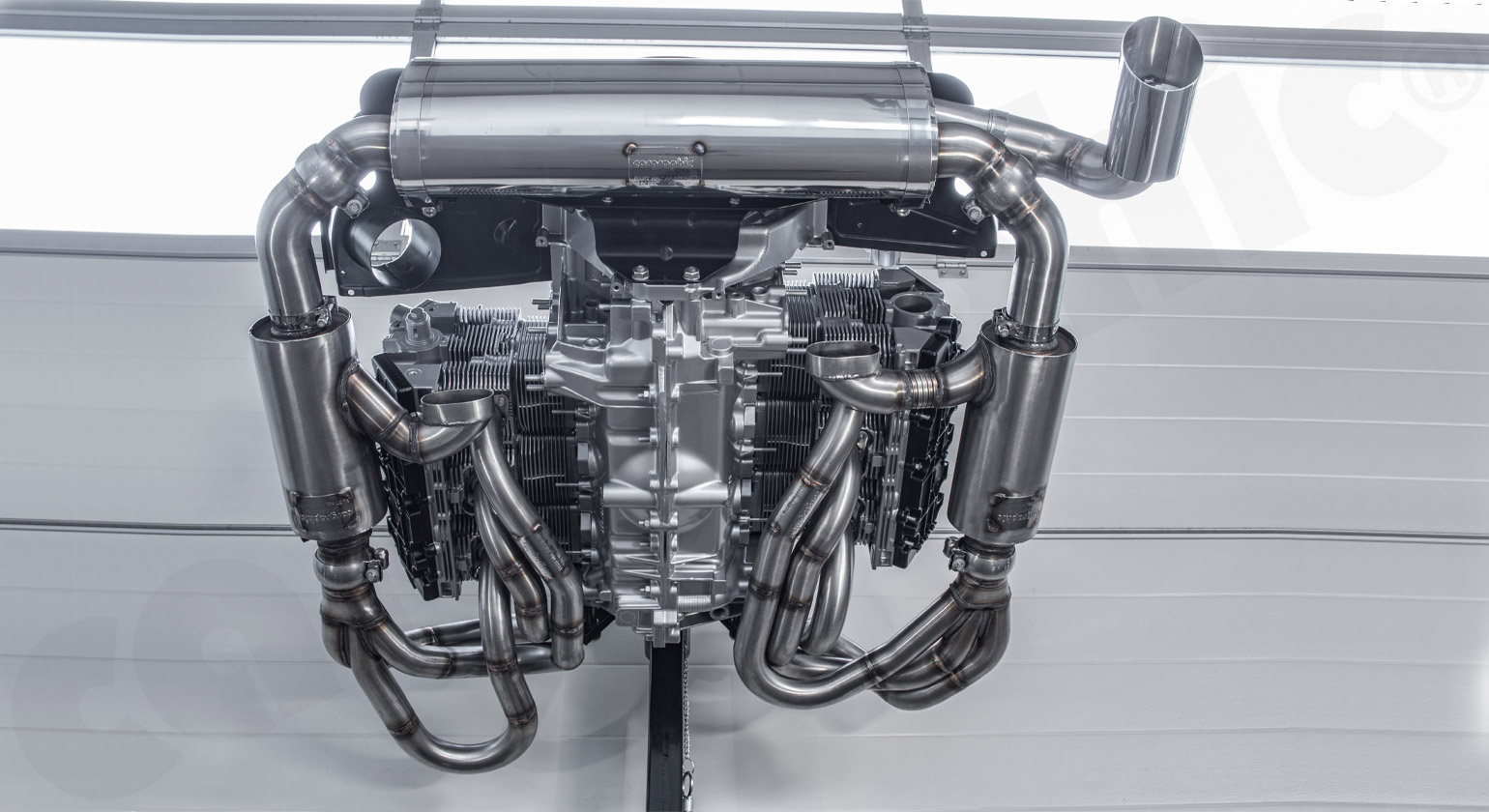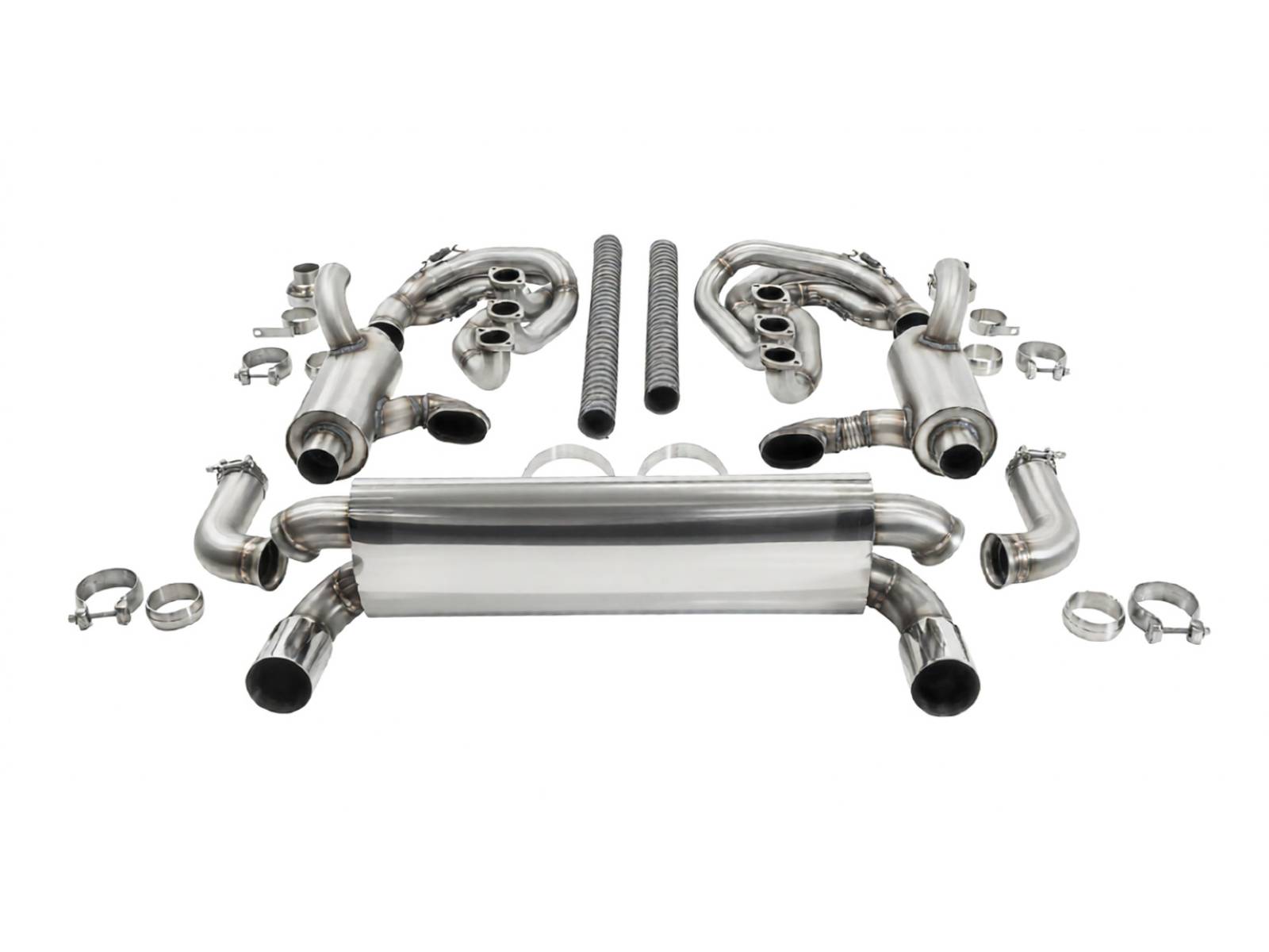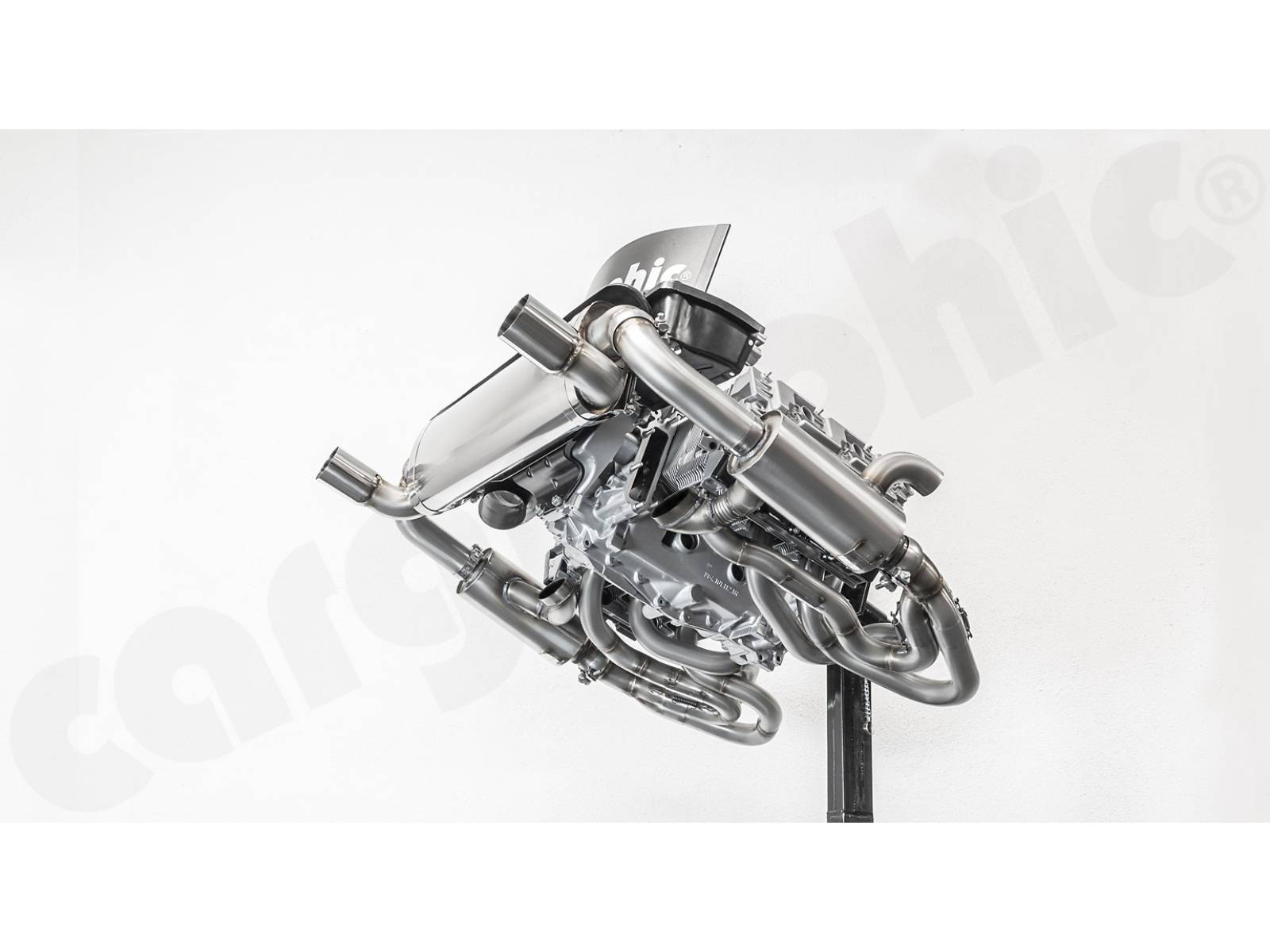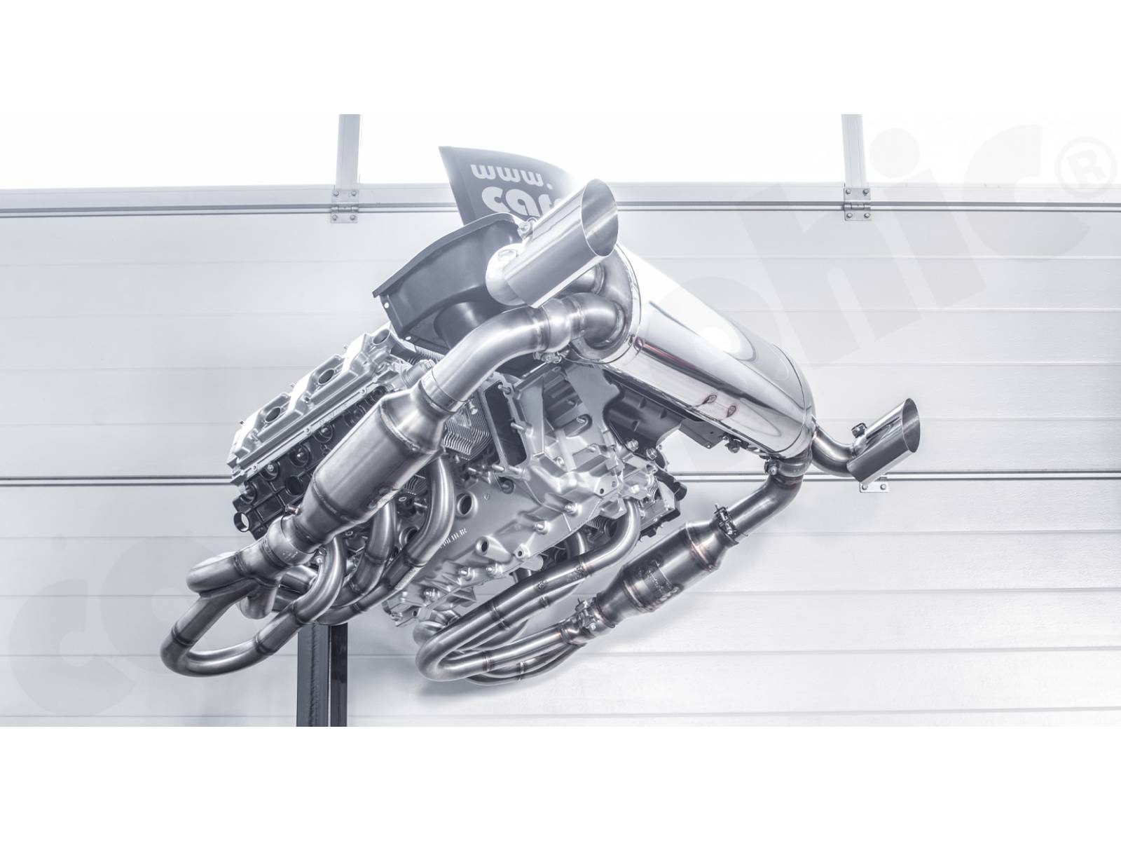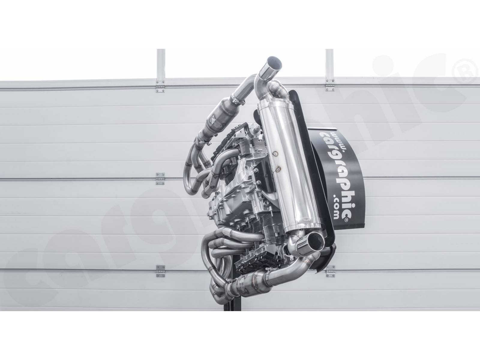Sistema di scarico sportivo CARGRAPHIC GT con collettori ID45 GT, con/senza catalizzatori da 200 cpsi, con riscaldamento e silenziatore posteriore AQ a doppio flusso con uscita terminale sinistra e destra.