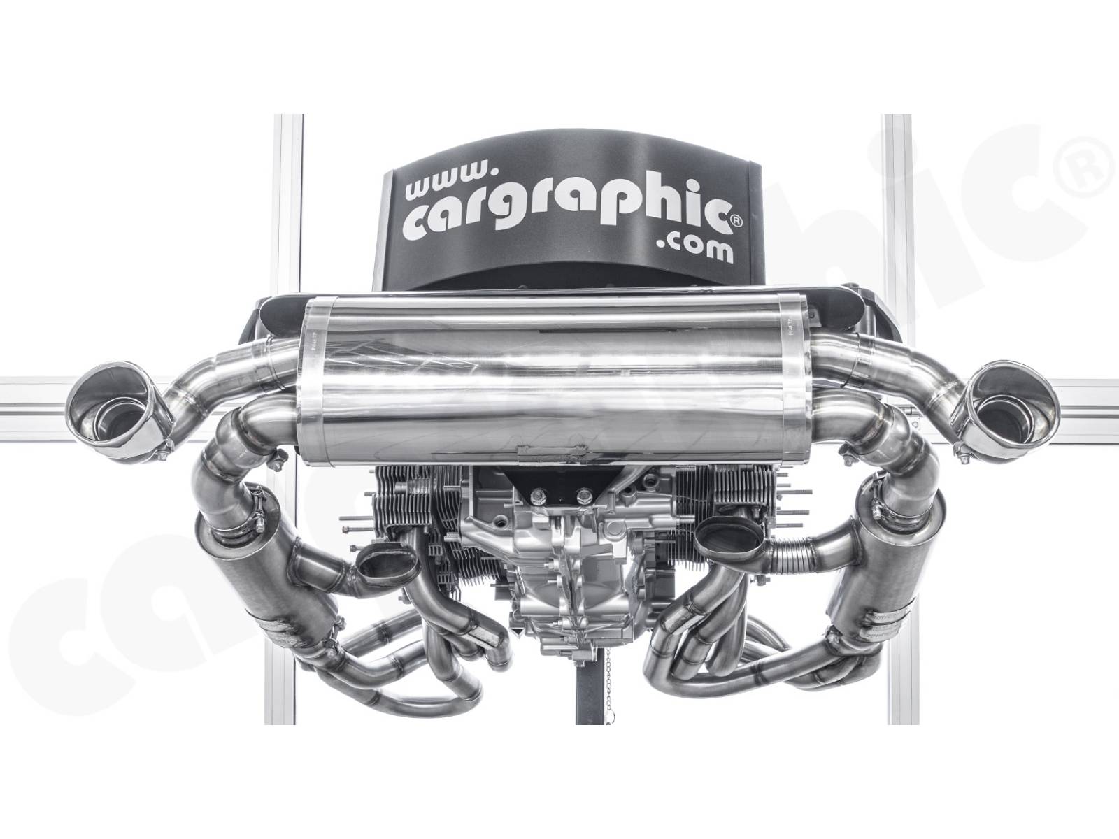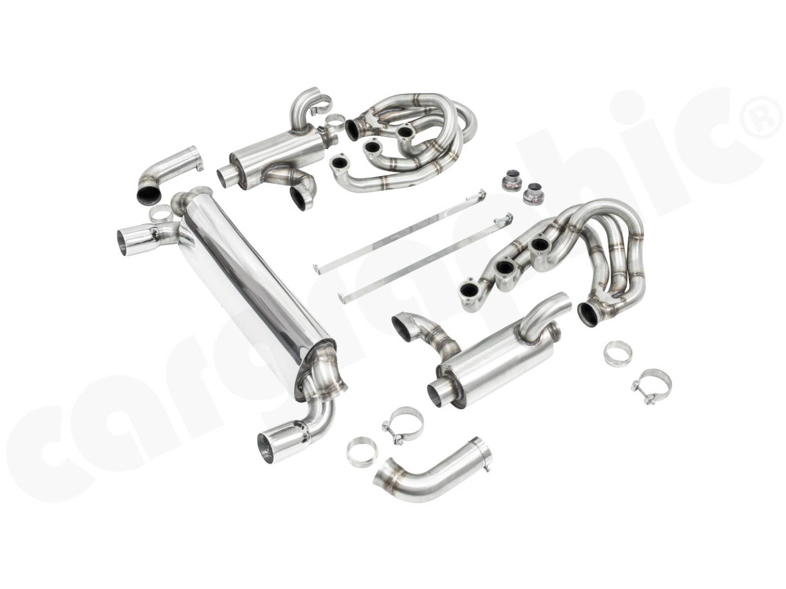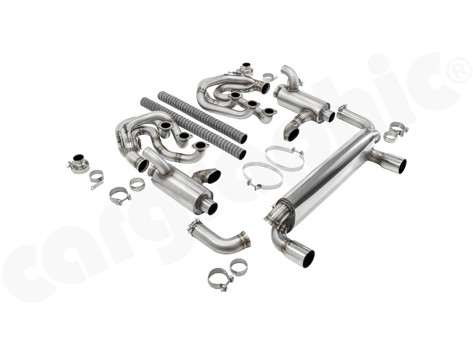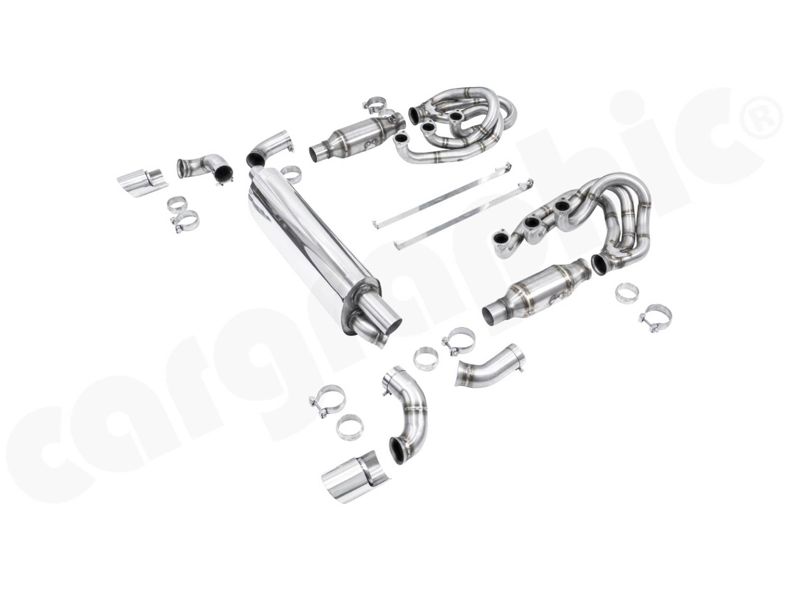 Sistema di scarico sportivo CARGRAPHIC GT Backdate con set collettore ID45 GT, con/senza catalizzatore da 200 cpsi, con riscaldamento e silenziatore posteriore AQ a doppio flusso con uscita terminale sinistra e destra Backdate/RSR-Look.