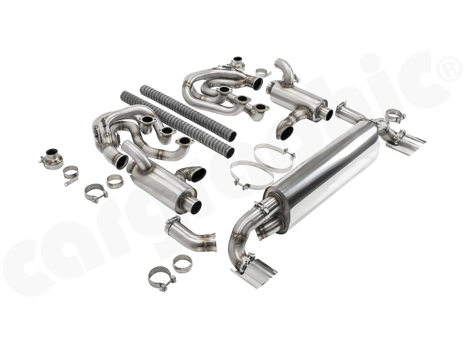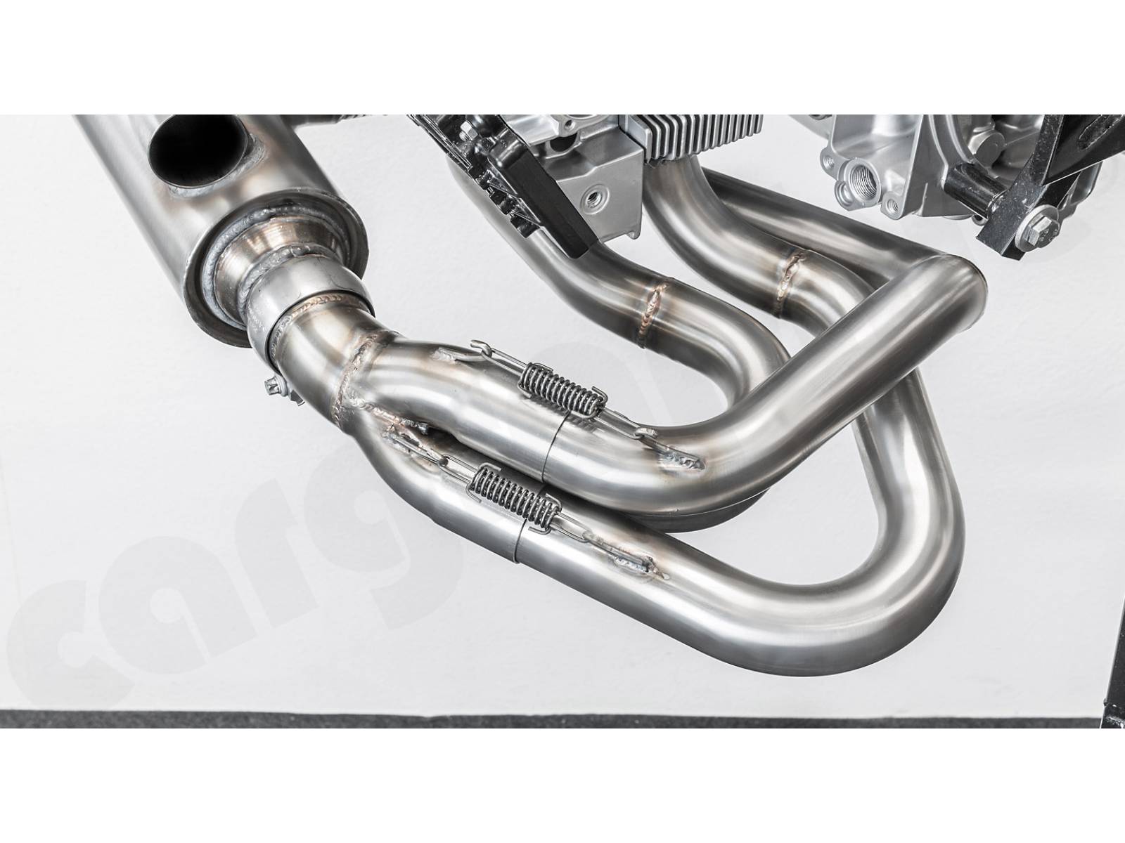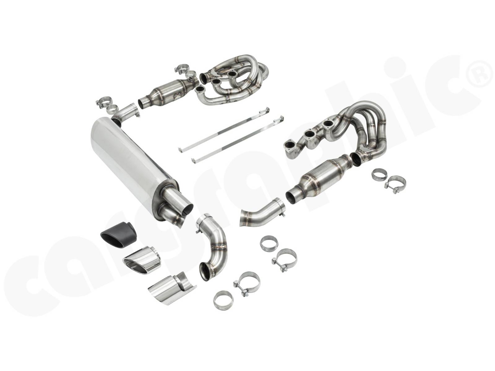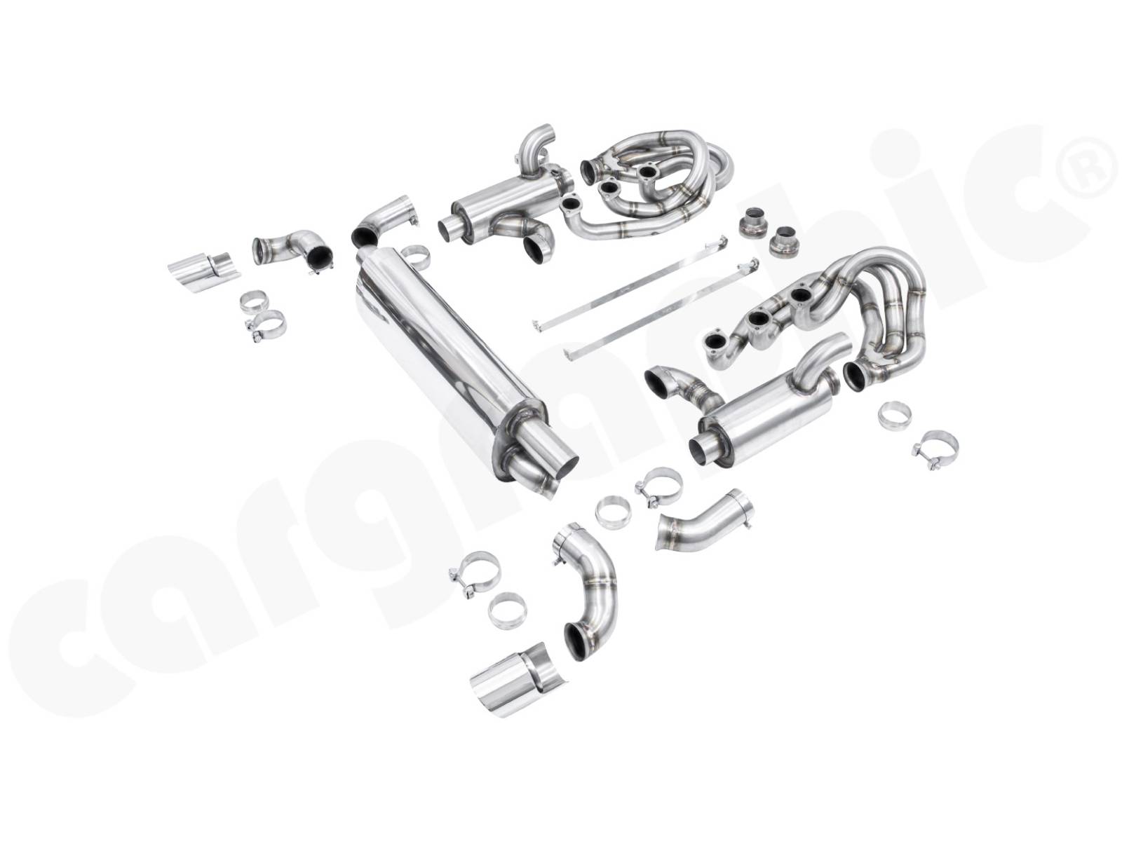 Sistema di scarico sportivo CARGRAPHIC GT Backdate con set collettore ID45 GT, con/senza catalizzatore da 200 cpsi, con riscaldamento e silenziatore posteriore AQ a doppio flusso con uscita terminale sinistra e destra Backdate/RSR-Look.