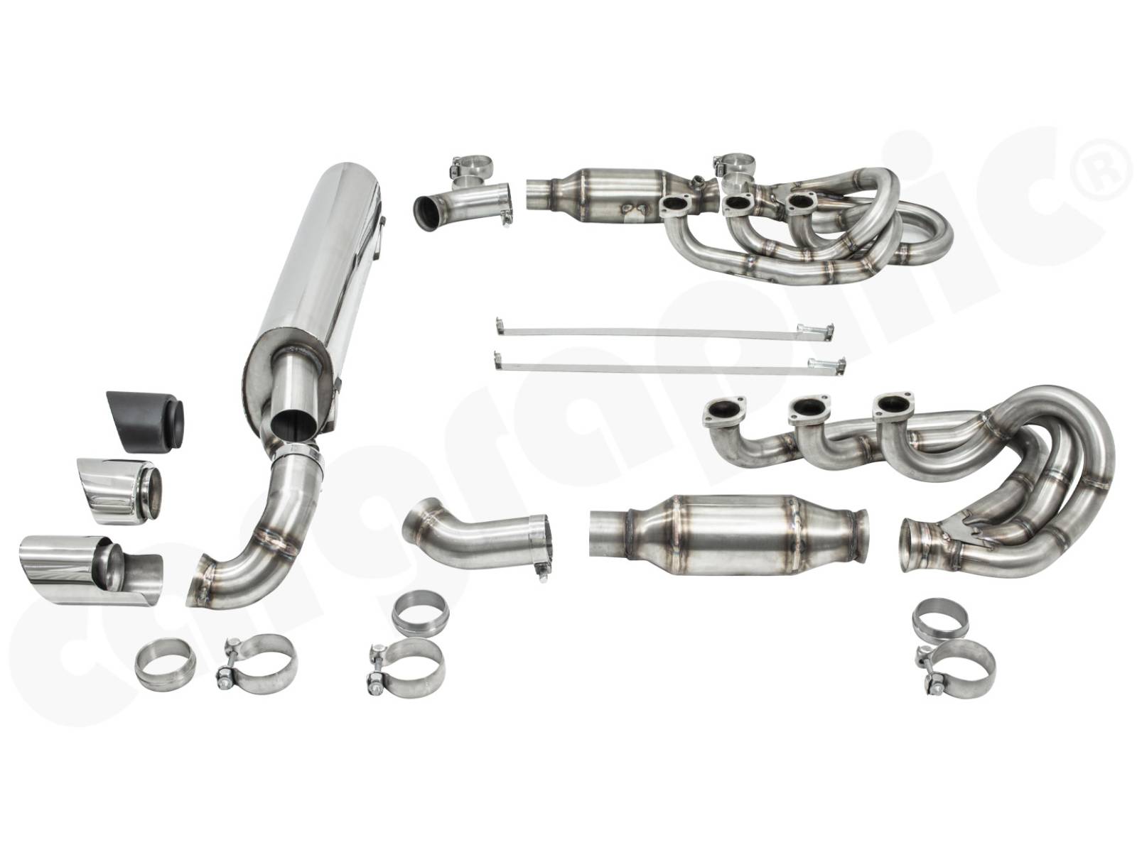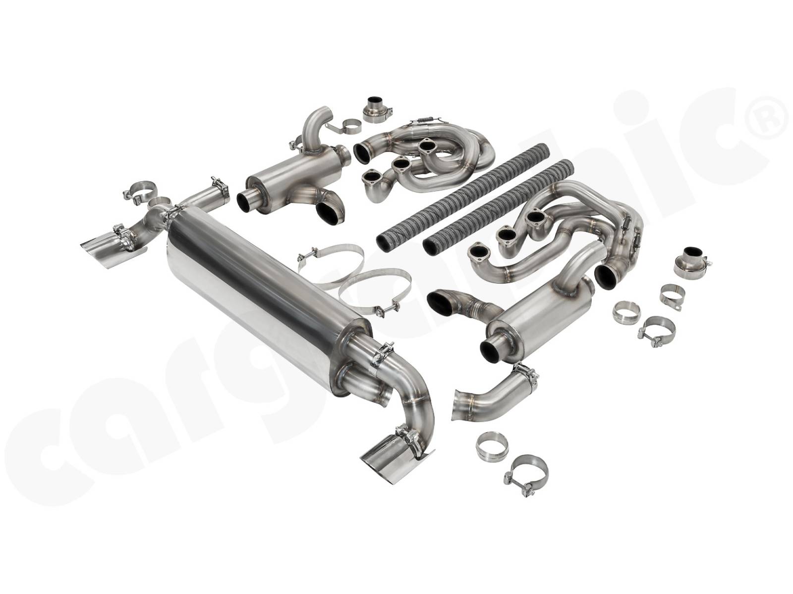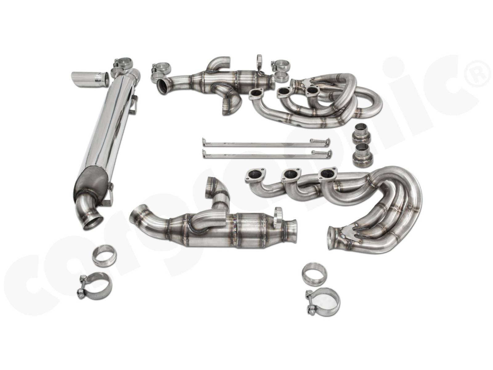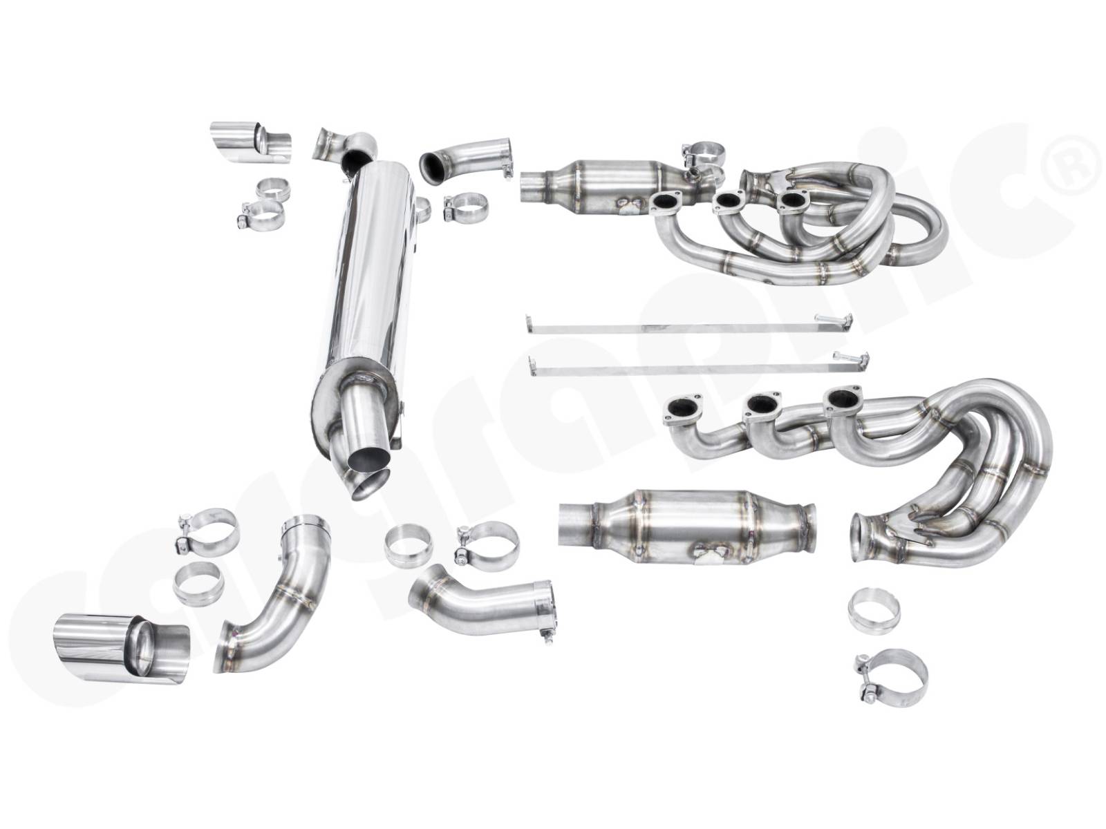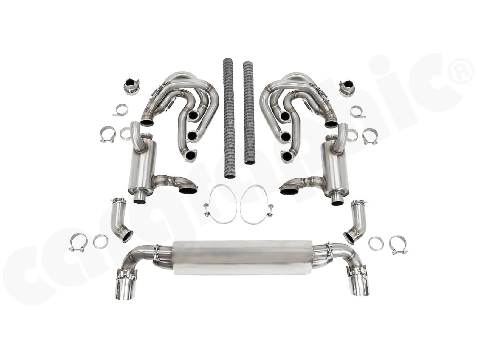 Sistema di scarico sportivo CARGRAPHIC GT Backdate con set collettore ID45 GT, con/senza catalizzatore da 200 cpsi, con riscaldamento e silenziatore posteriore AQ a doppio flusso con uscita terminale sinistra e destra Backdate/RSR-Look.