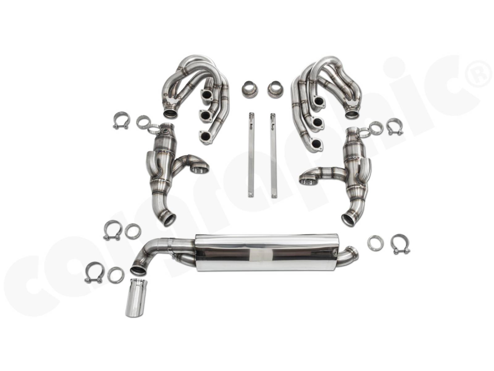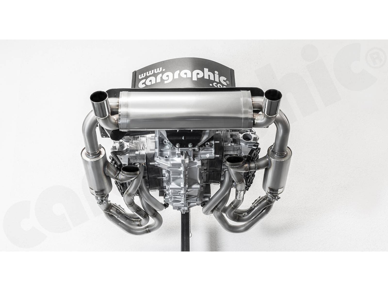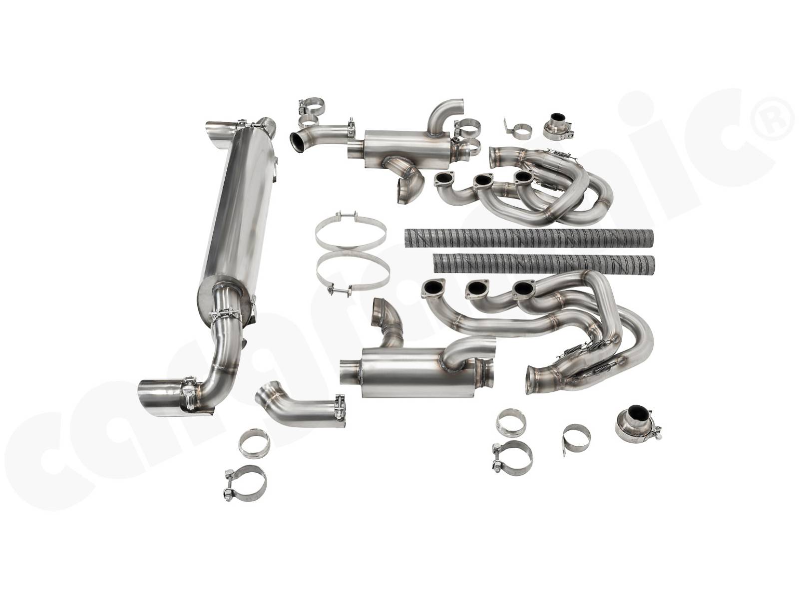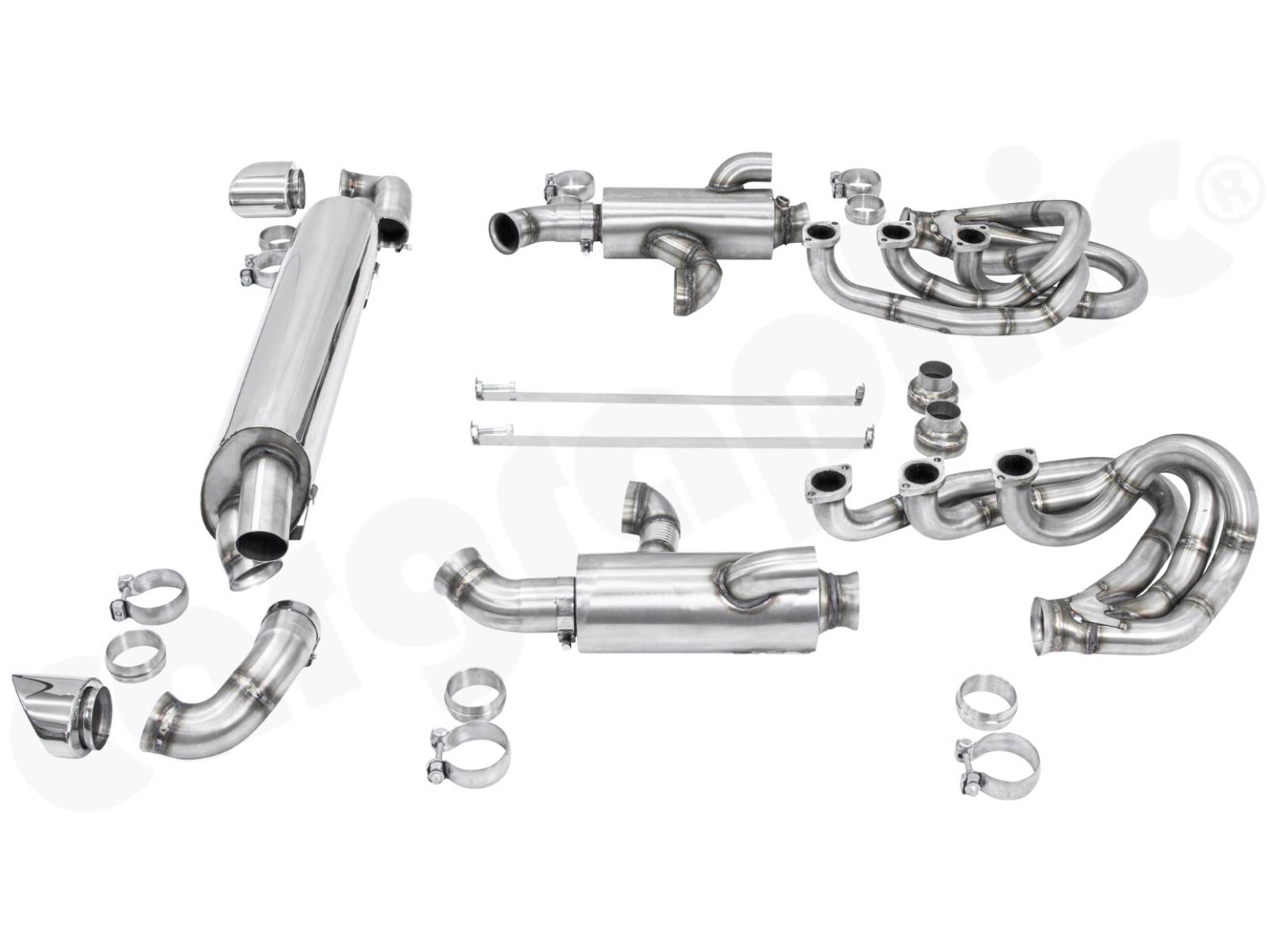 Sistema di scarico sportivo CARGRAPHIC GT Backdate con set collettore ID45 GT, con/senza catalizzatore da 200 cpsi, con riscaldamento e silenziatore posteriore AQ a doppio flusso con uscita terminale sinistra e destra Backdate/RSR-Look.