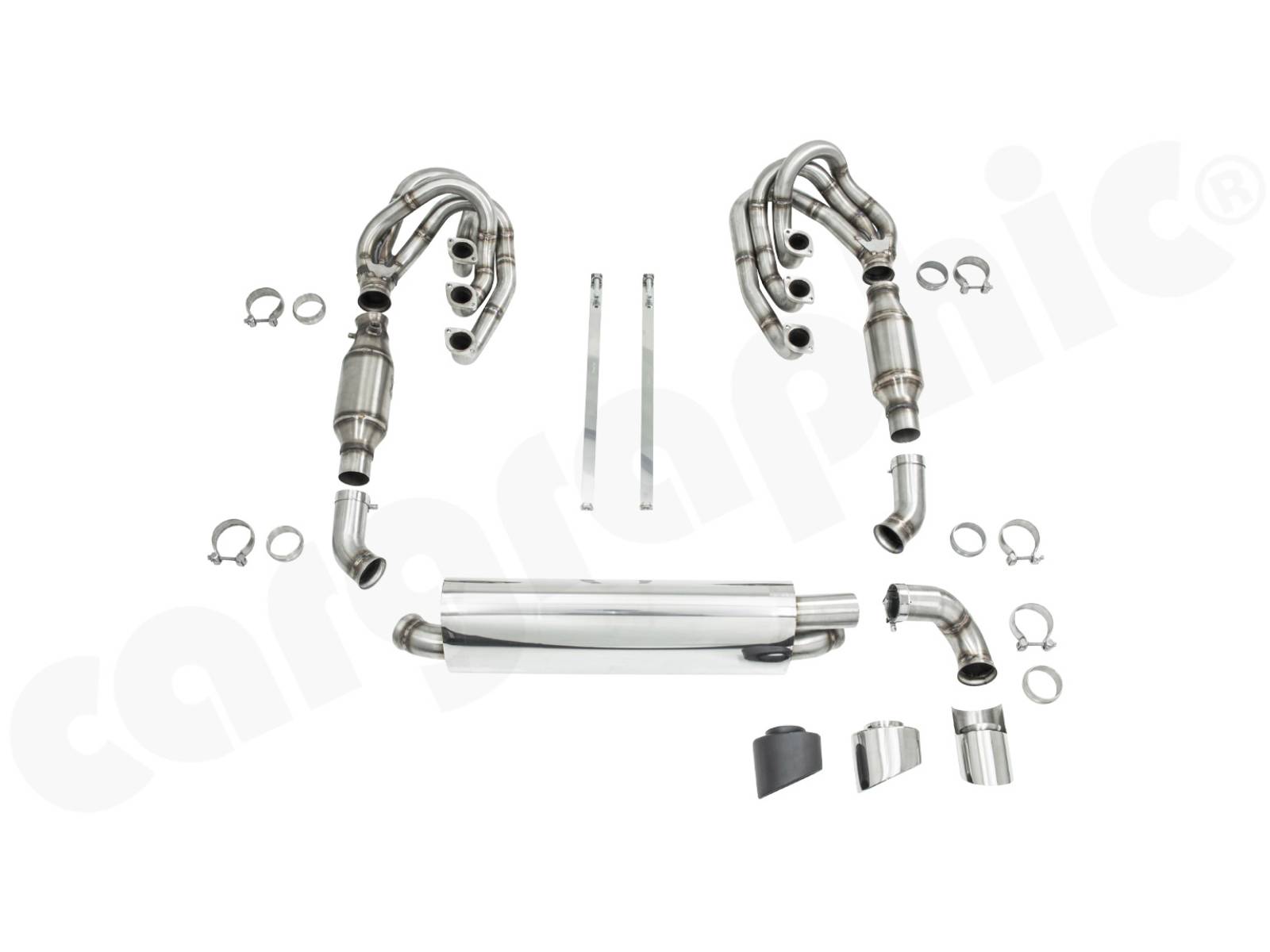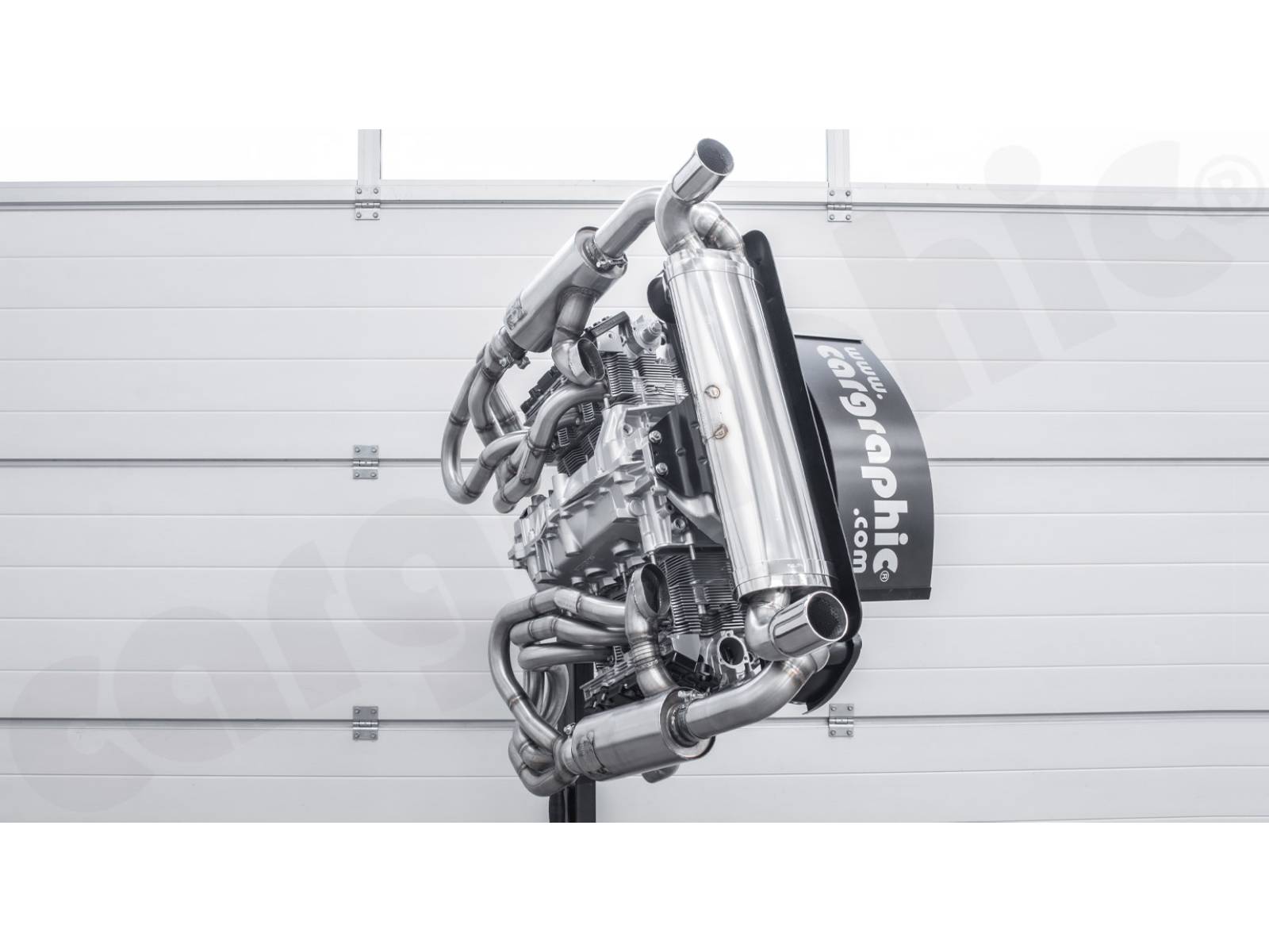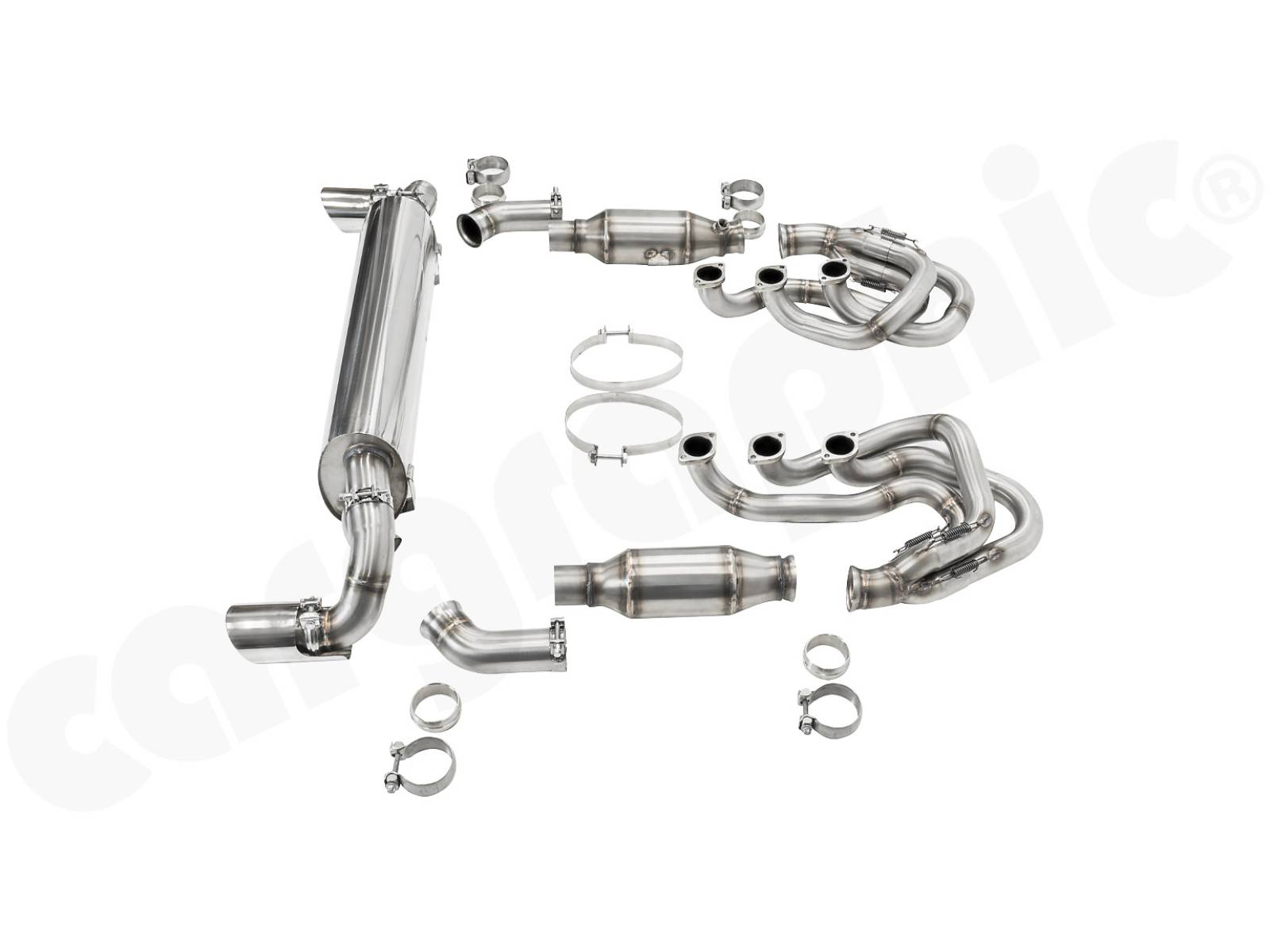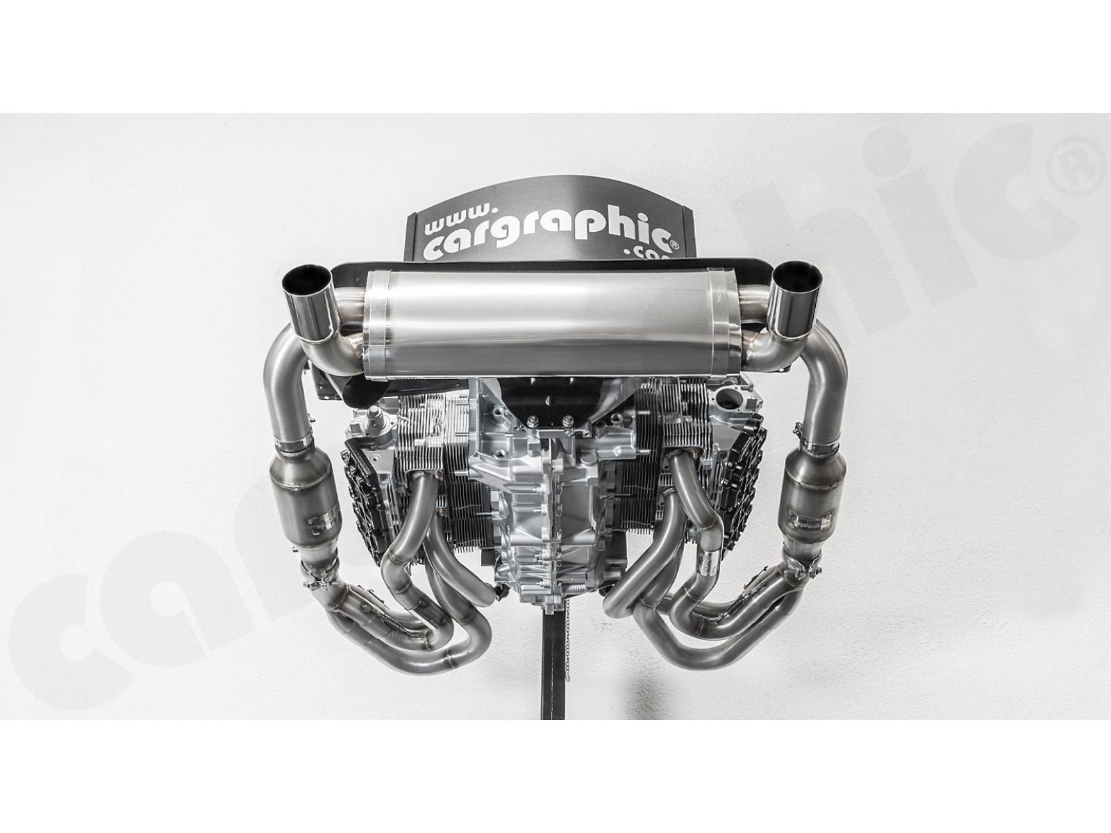 Sistema di scarico sportivo CARGRAPHIC GT Backdate con set collettore ID45 GT, con/senza catalizzatore da 200 cpsi, con riscaldamento e silenziatore posteriore AQ a doppio flusso con uscita terminale sinistra e destra Backdate/RSR-Look.