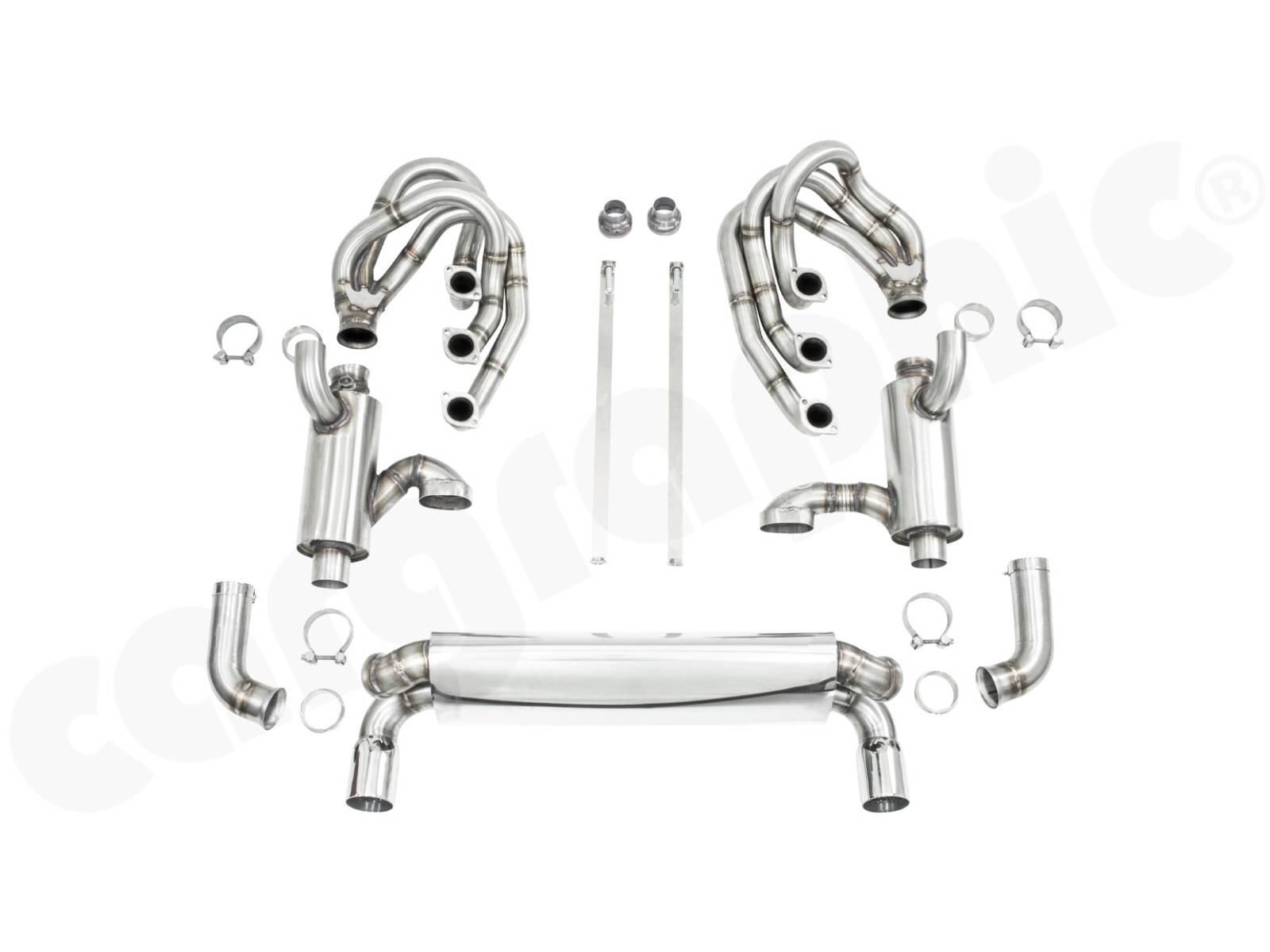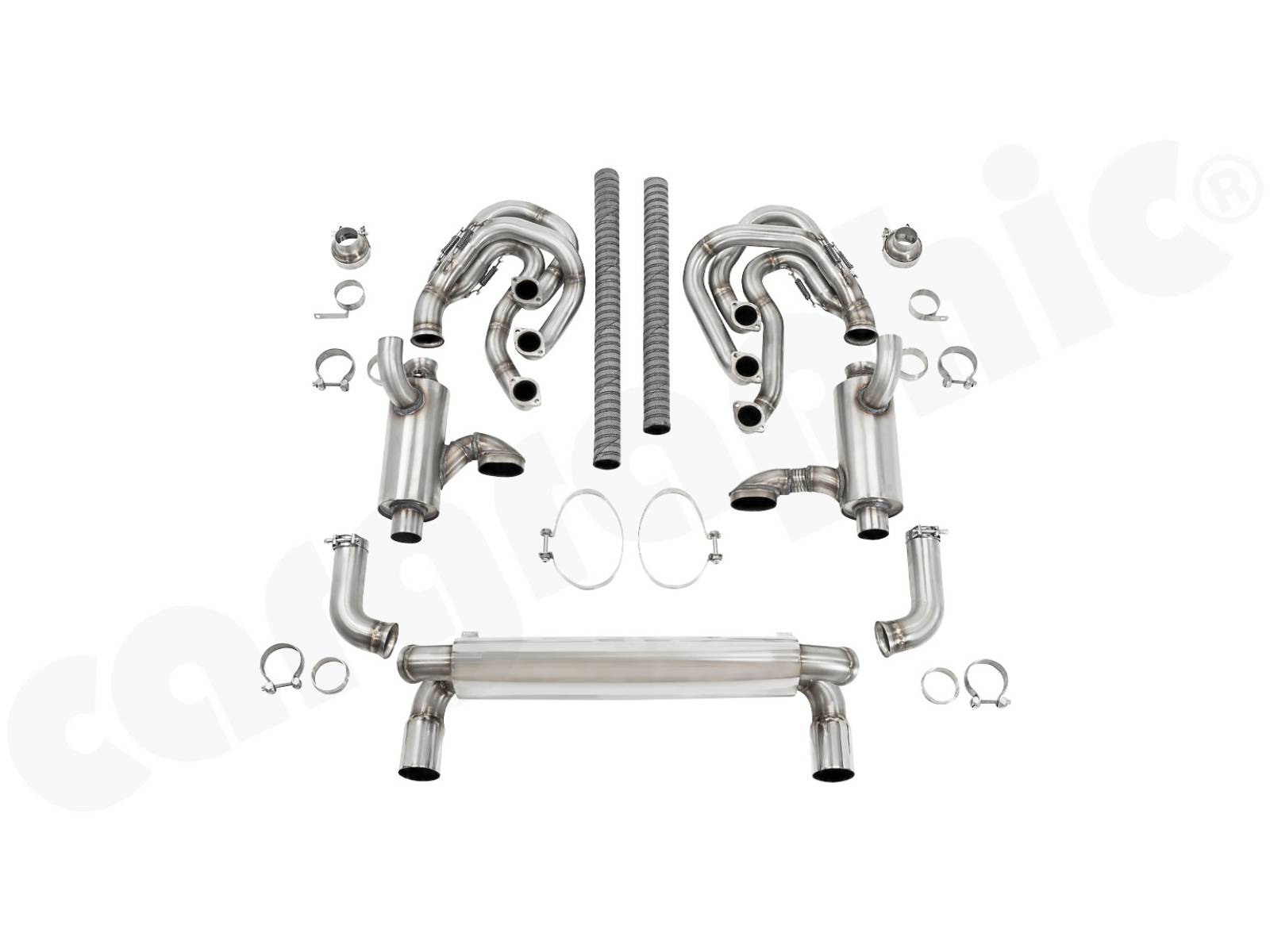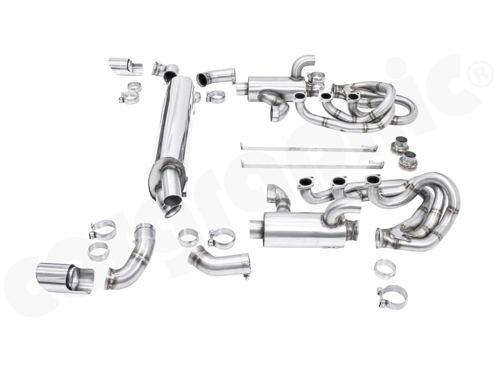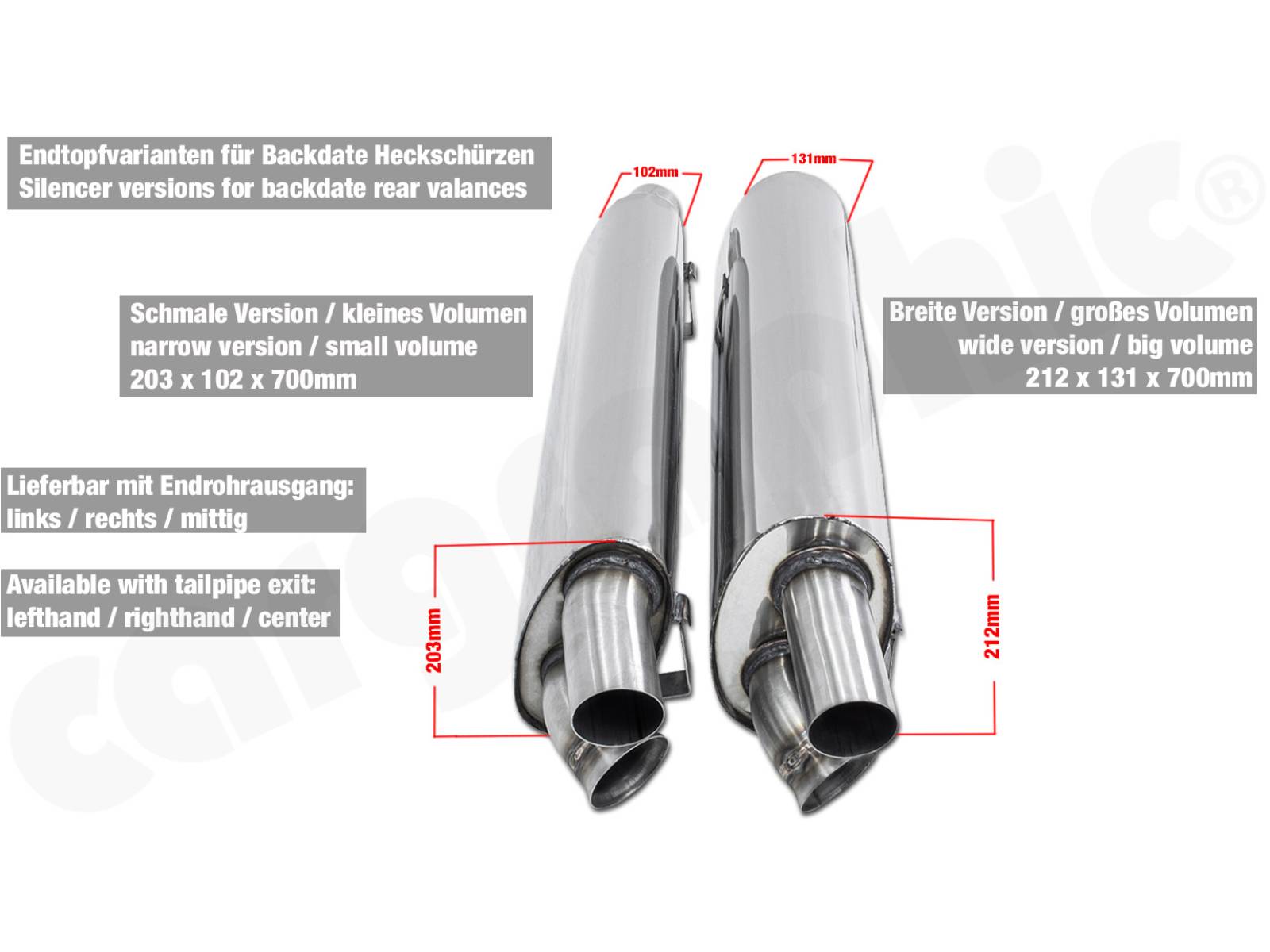 Sistema di scarico sportivo CARGRAPHIC GT Backdate con set collettore ID45 GT, con/senza catalizzatori da 100 cpsi e silenziatore posteriore AQ a doppio flusso con uscita terminale sinistra e destra Backdate/RSR-Look.