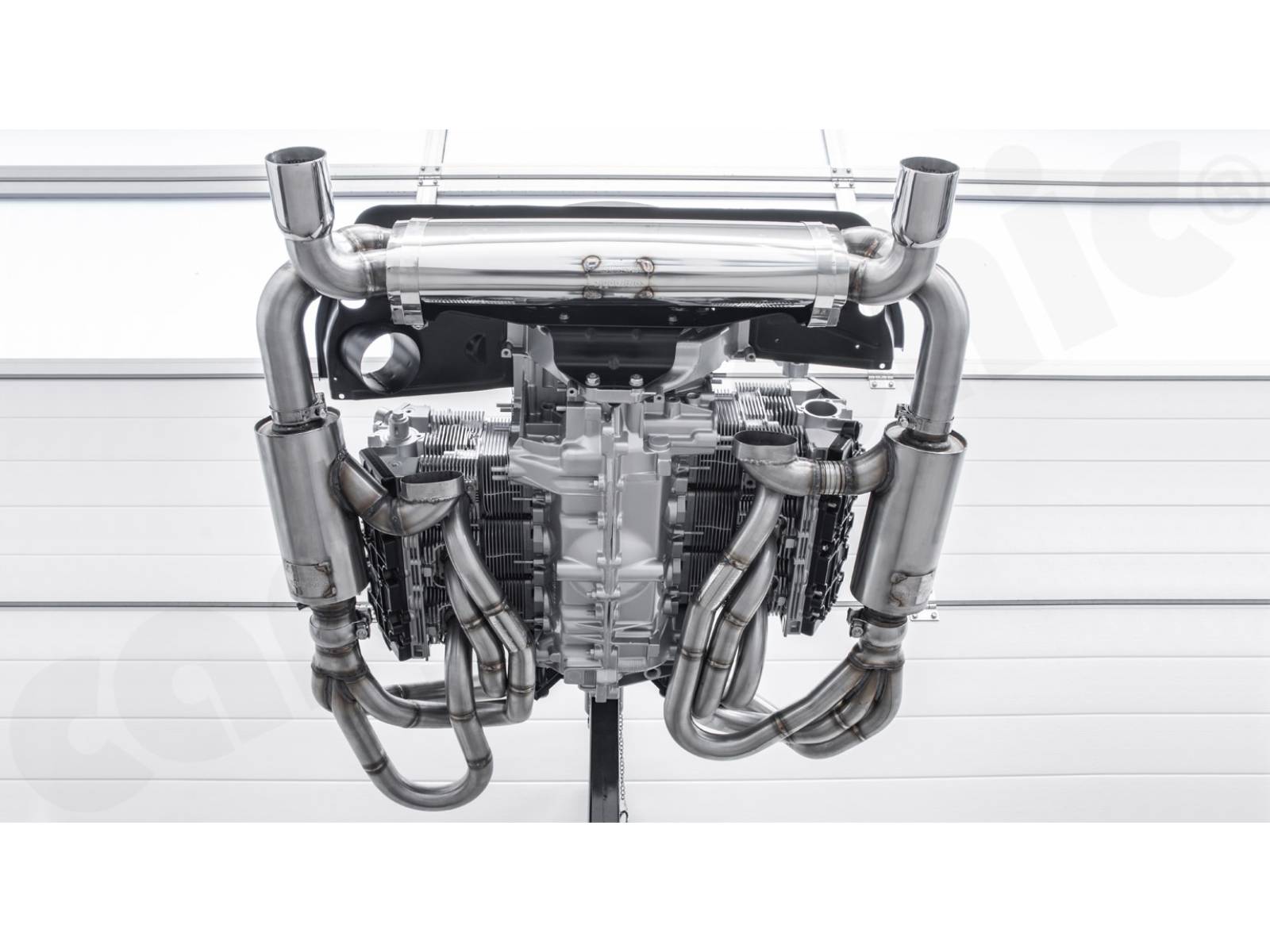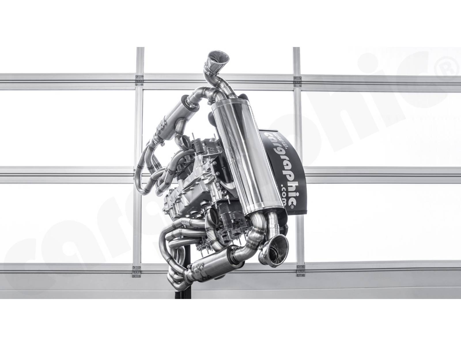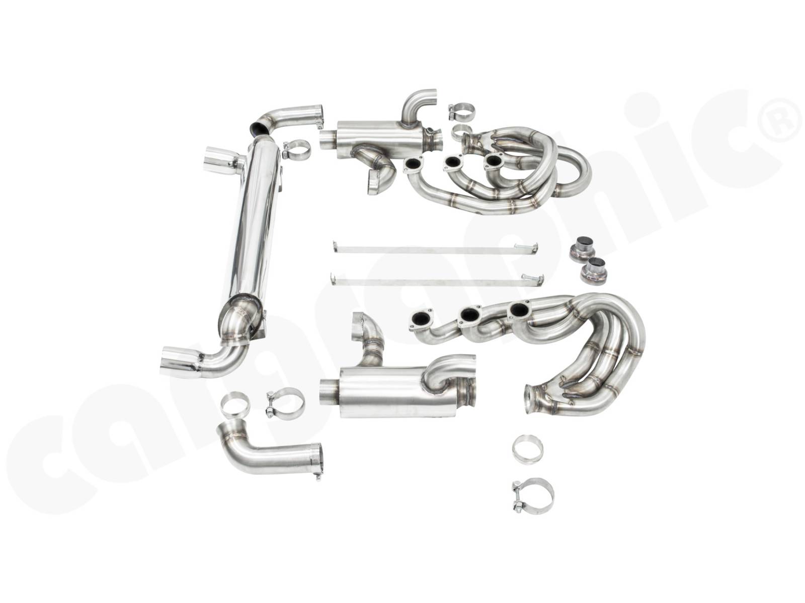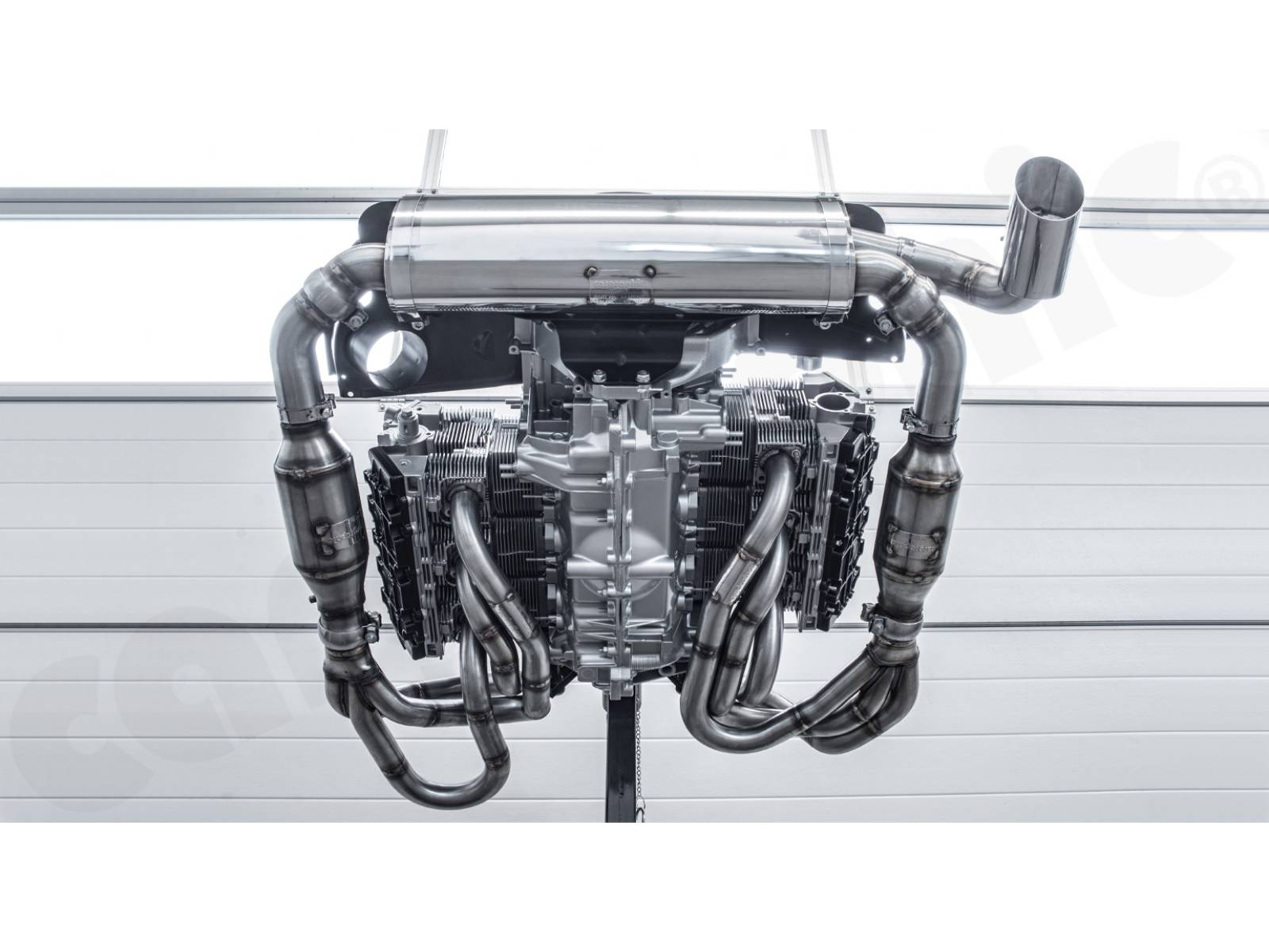 Sistema di scarico sportivo CARGRAPHIC GT Backdate con set collettore ID45 GT, con/senza catalizzatori da 100 cpsi e silenziatore posteriore AQ a doppio flusso con uscita terminale sinistra e destra Backdate/RSR-Look.