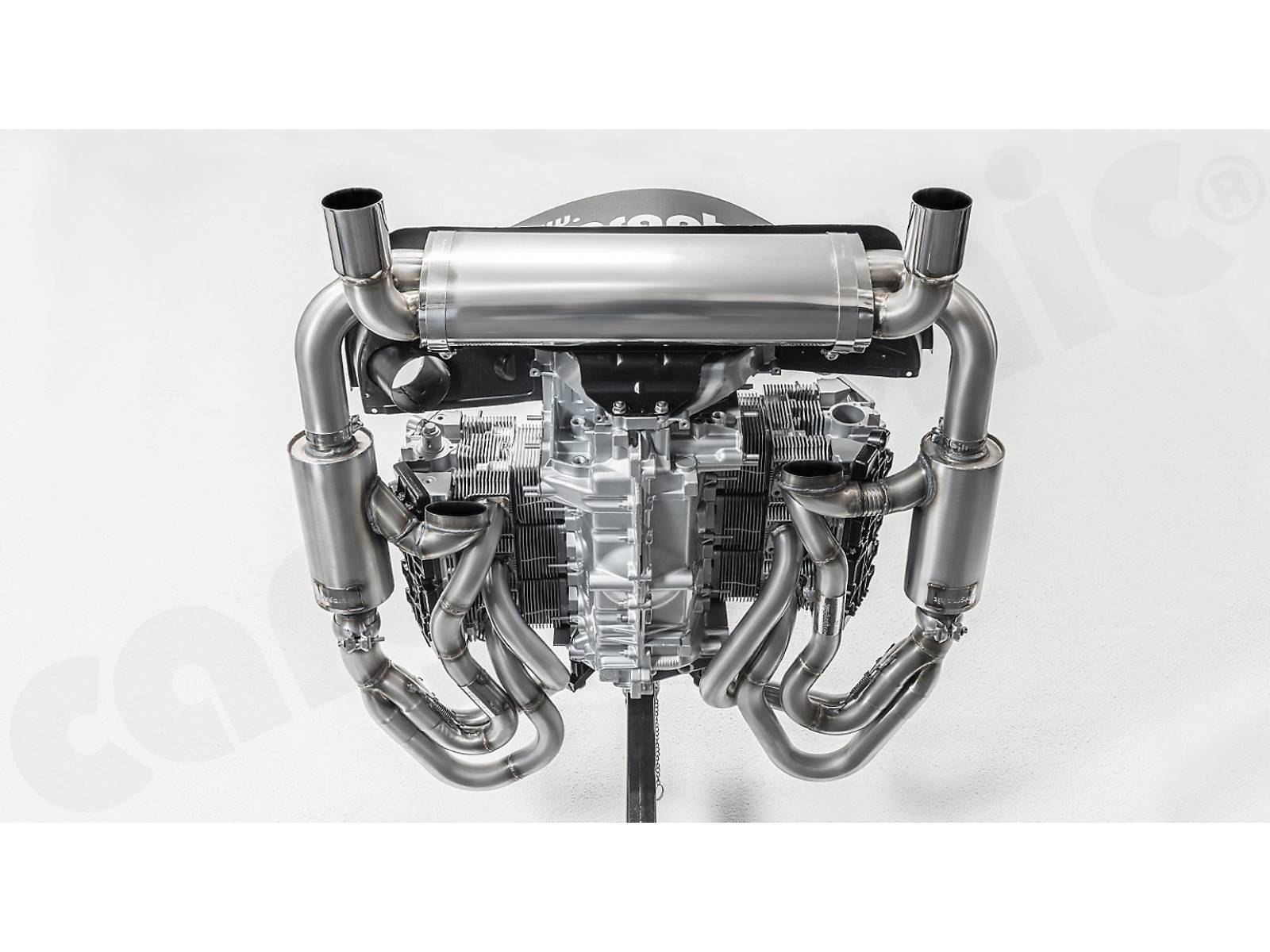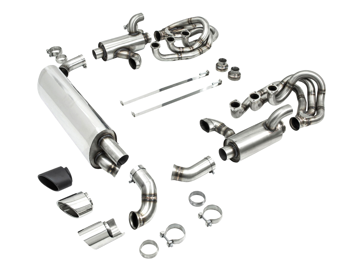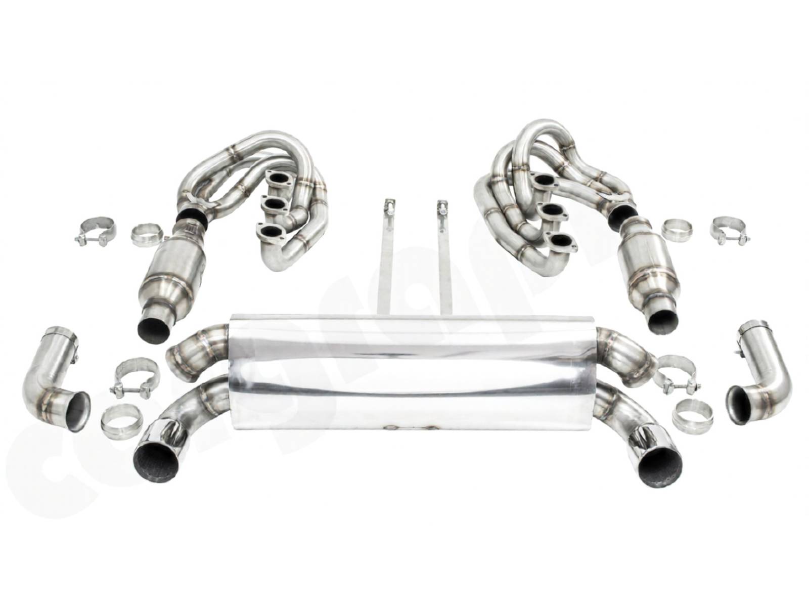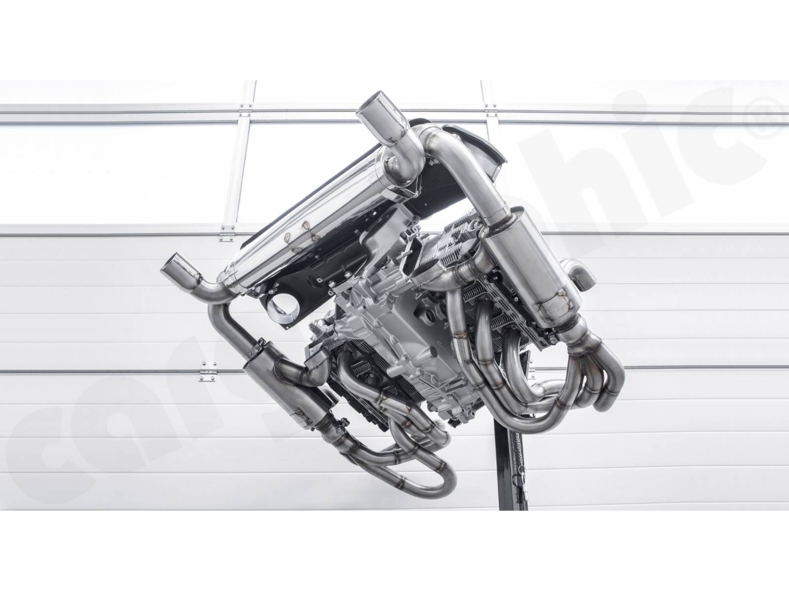 Sistema di scarico sportivo CARGRAPHIC GT Backdate con set collettore ID45 GT, con/senza catalizzatori da 100 cpsi e silenziatore posteriore AQ a doppio flusso con uscita terminale sinistra e destra Backdate/RSR-Look.