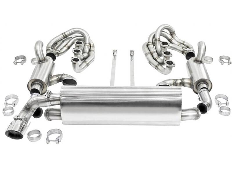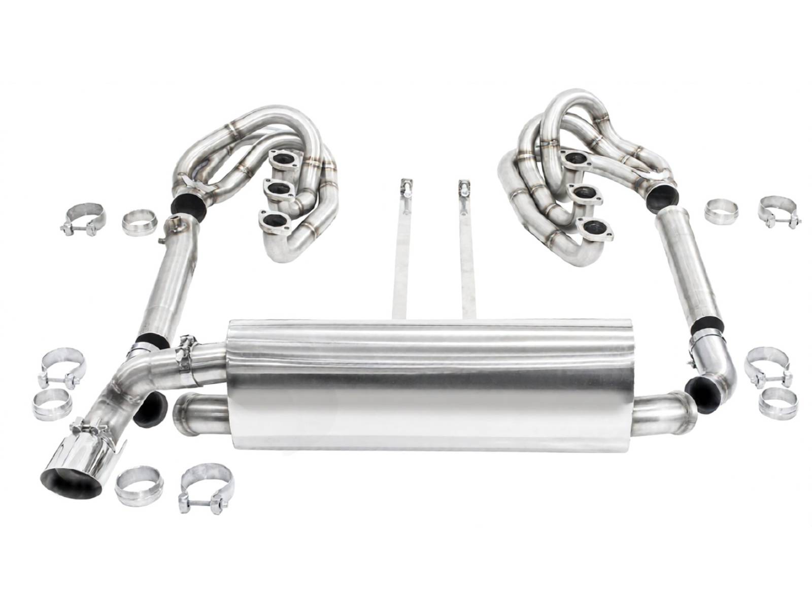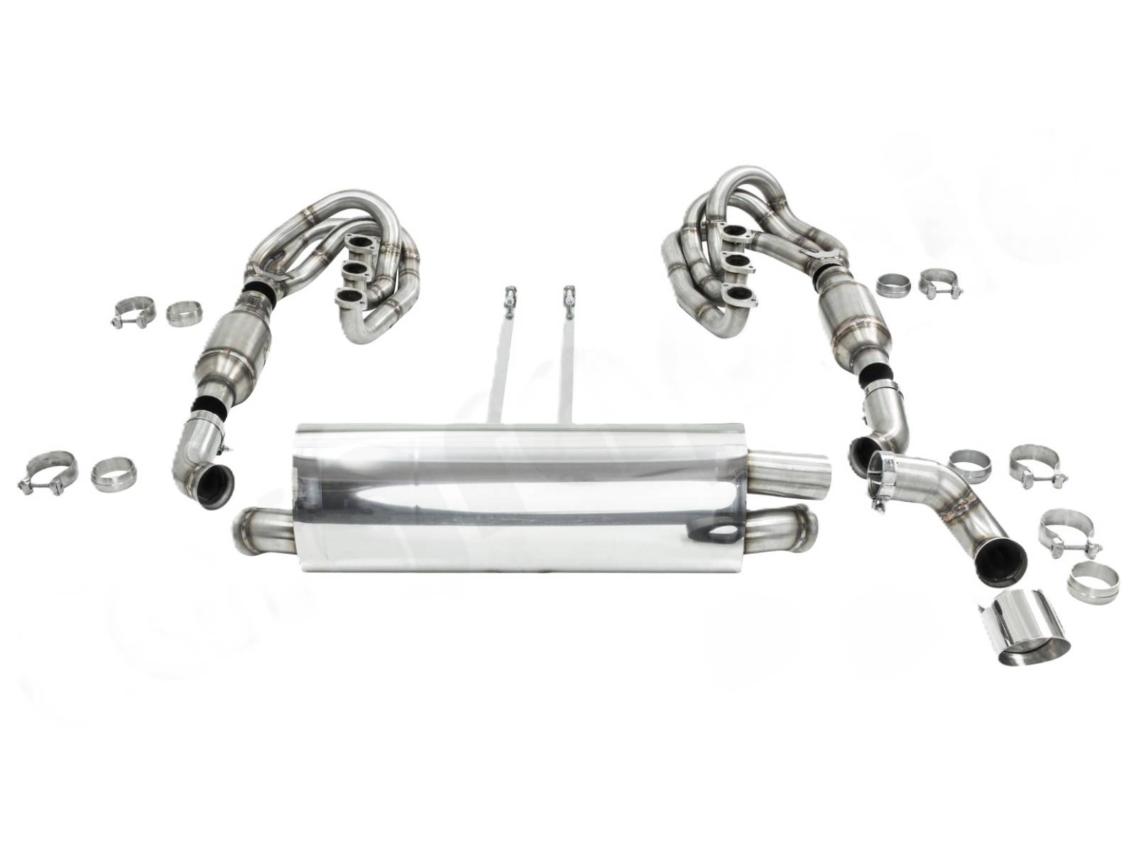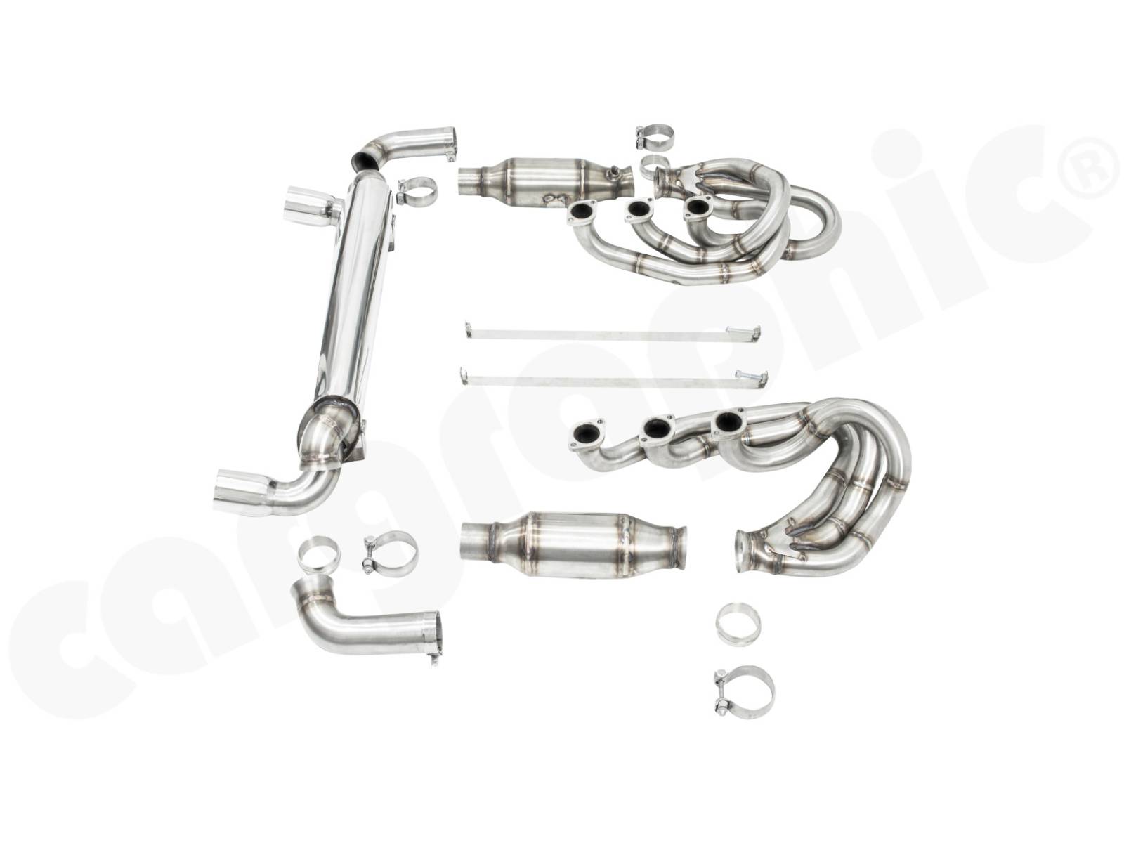 Sistema di scarico sportivo CARGRAPHIC GT Backdate con set collettore ID42 GT, con/senza catalizzatori da 100 cpsi e silenziatore posteriore AQ a doppio flusso con uscita terminale sinistra e destra Backdate/RSR-Look.