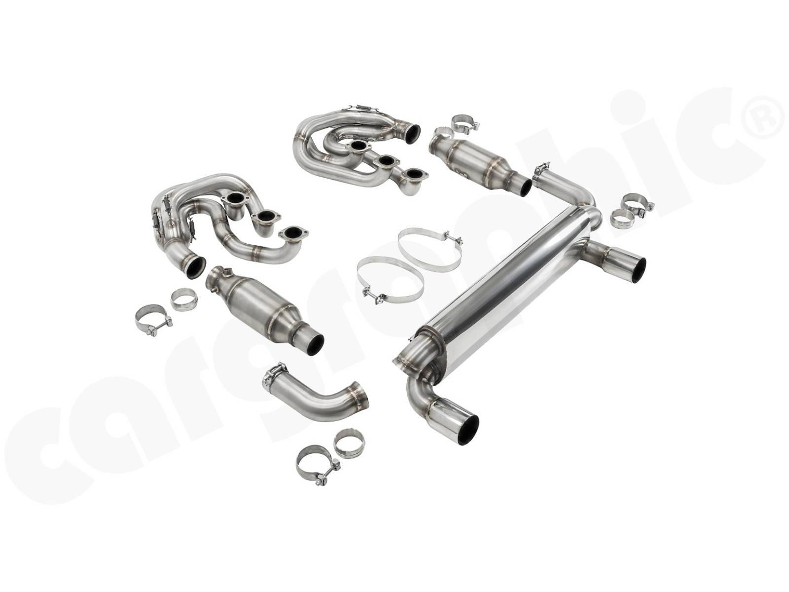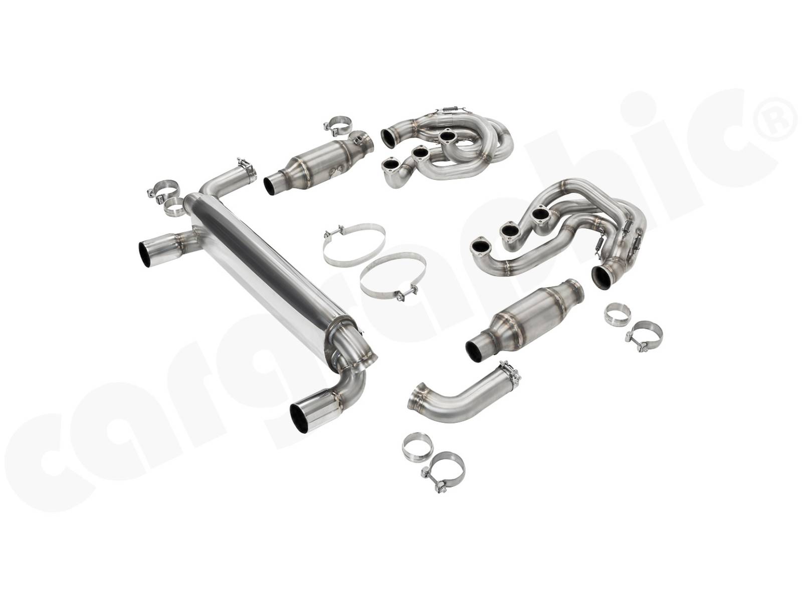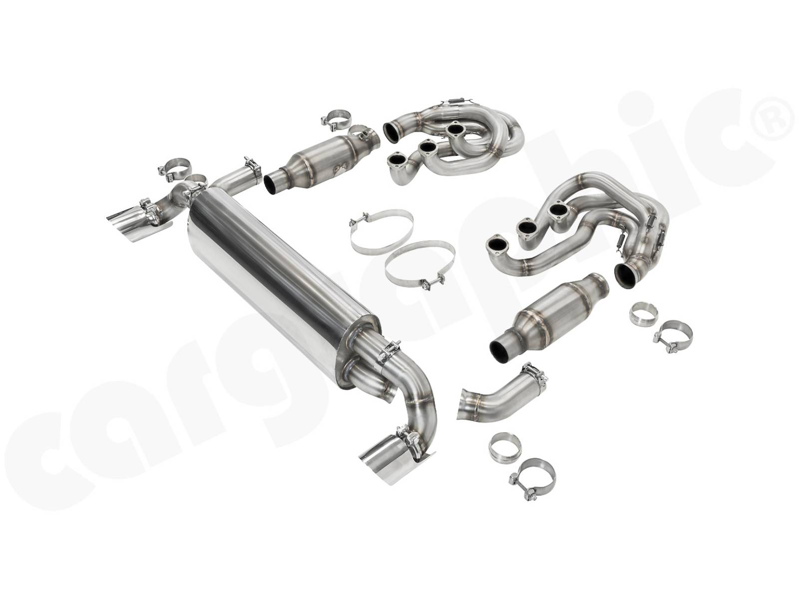 Sistema di scarico sportivo CARGRAPHIC GT Backdate con set collettore ID42 GT, con/senza catalizzatore da 200 cpsi, con riscaldamento e silenziatore posteriore AQ a doppio flusso con uscita terminale sinistra e destra Backdate/RSR-Look.