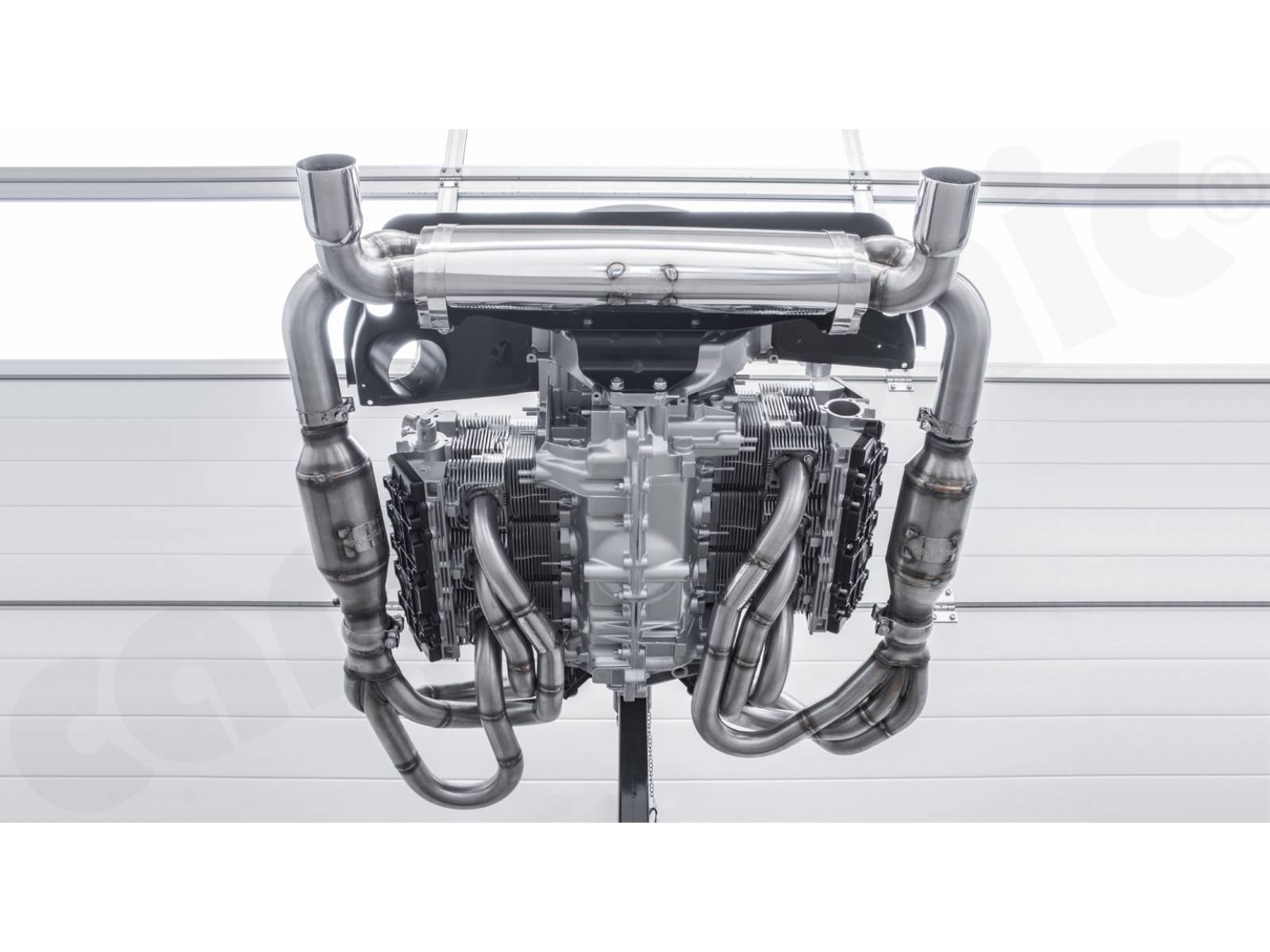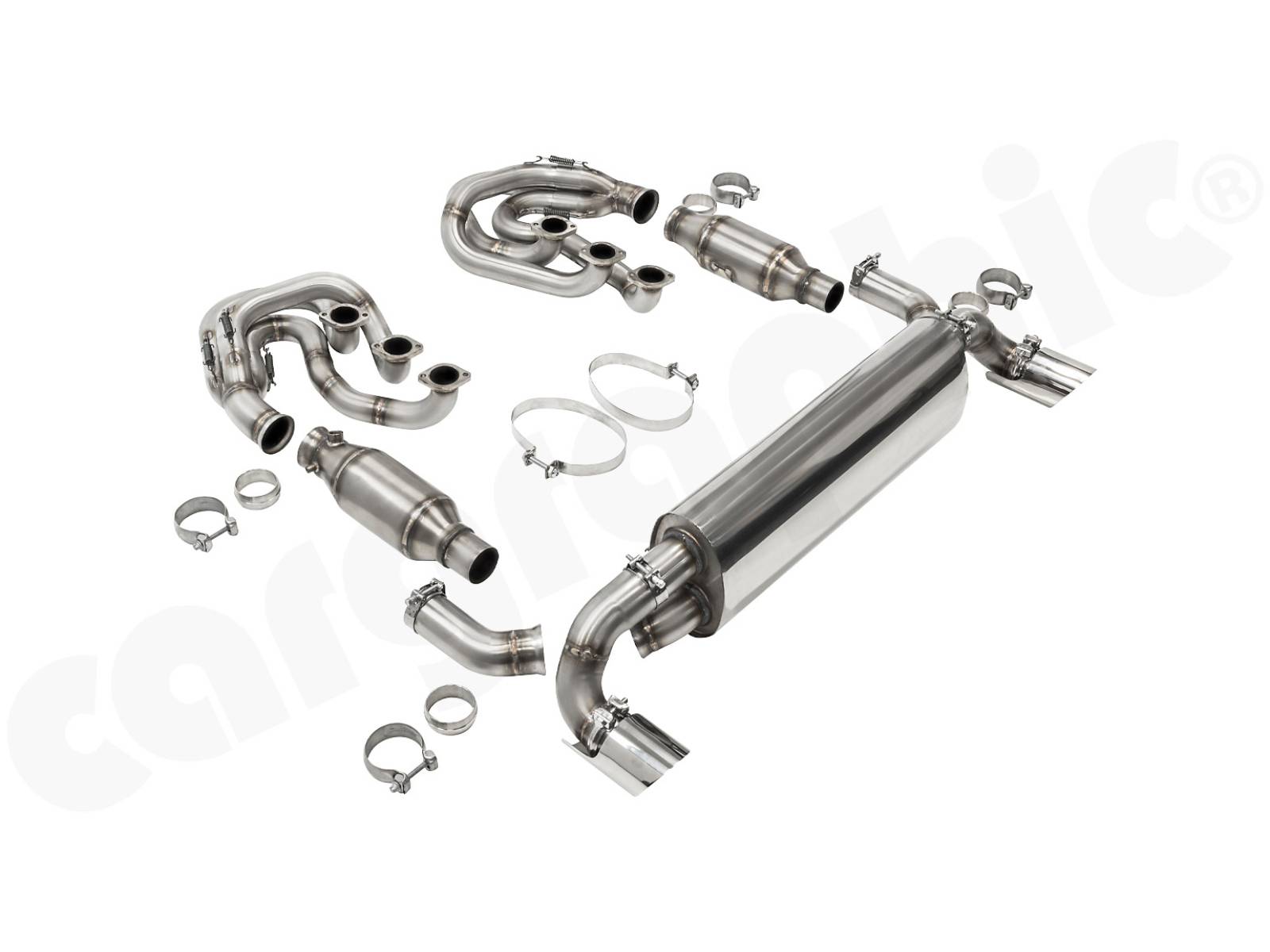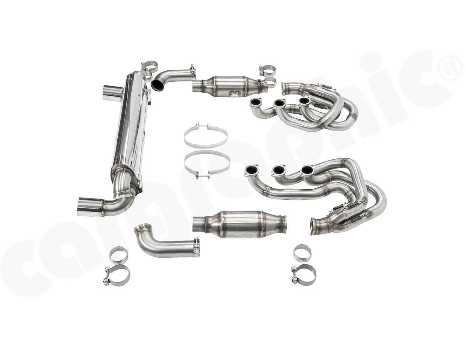 Sistema di scarico sportivo CARGRAPHIC GT Backdate con set collettore ID42 GT, con/senza catalizzatore da 200 cpsi, con riscaldamento e silenziatore posteriore AQ a doppio flusso con uscita terminale sinistra e destra Backdate/RSR-Look.