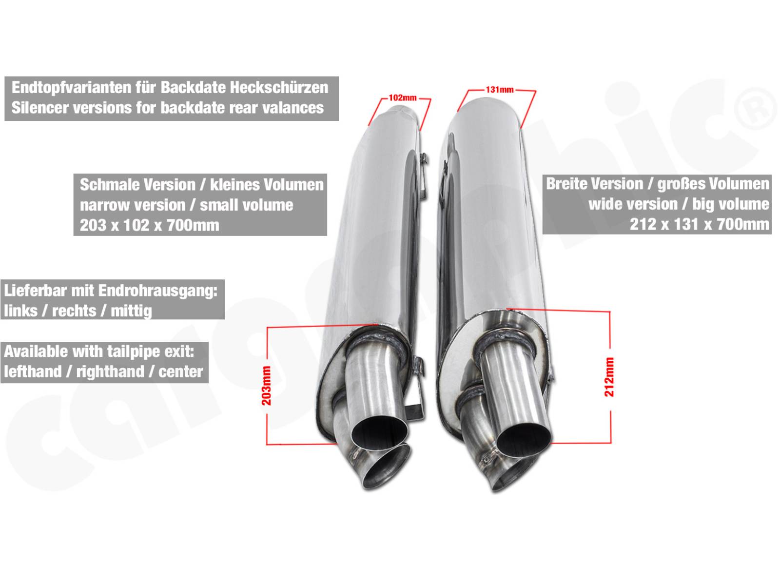 - 2x terminali di scarico sportivi CARGRAPHIC in Ø76mm saldati con uno spazio CTC di 740mm (RSR-Look)