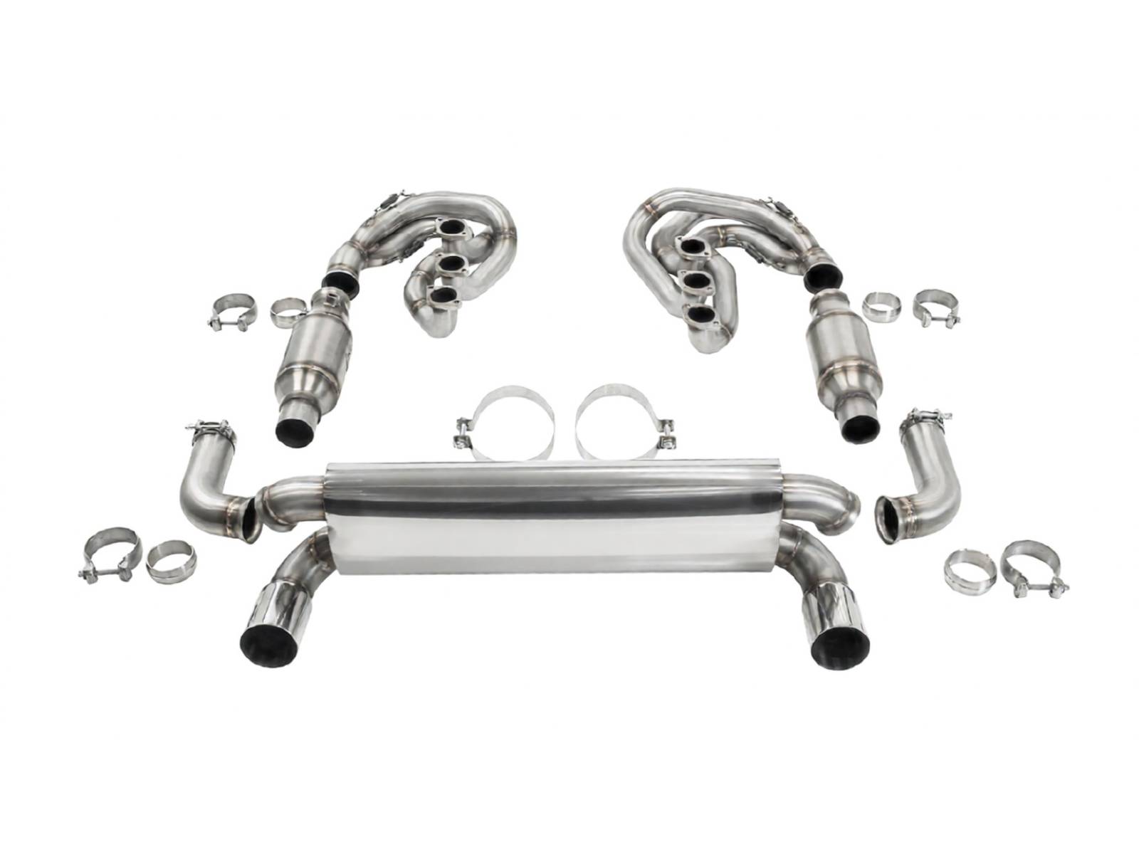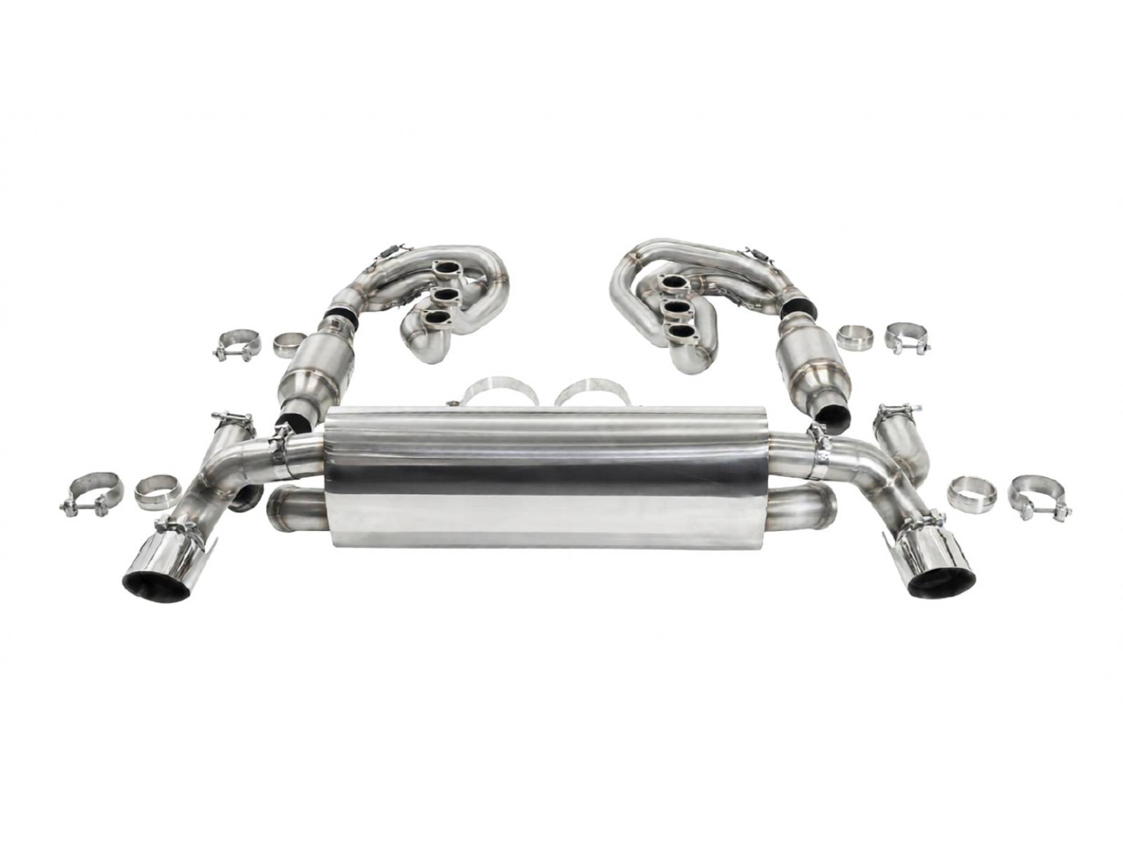 Sistema di scarico sportivo CARGRAPHIC GT con collettori ID42 GT, con/senza catalizzatori da 200 cpsi, con riscaldamento e silenziatore posteriore AQ a doppio flusso con uscita terminale sinistra e destra.