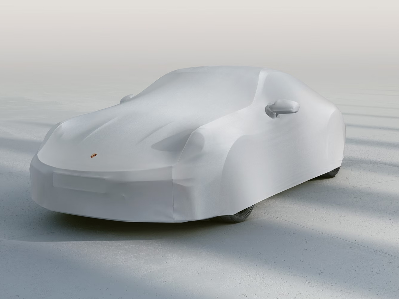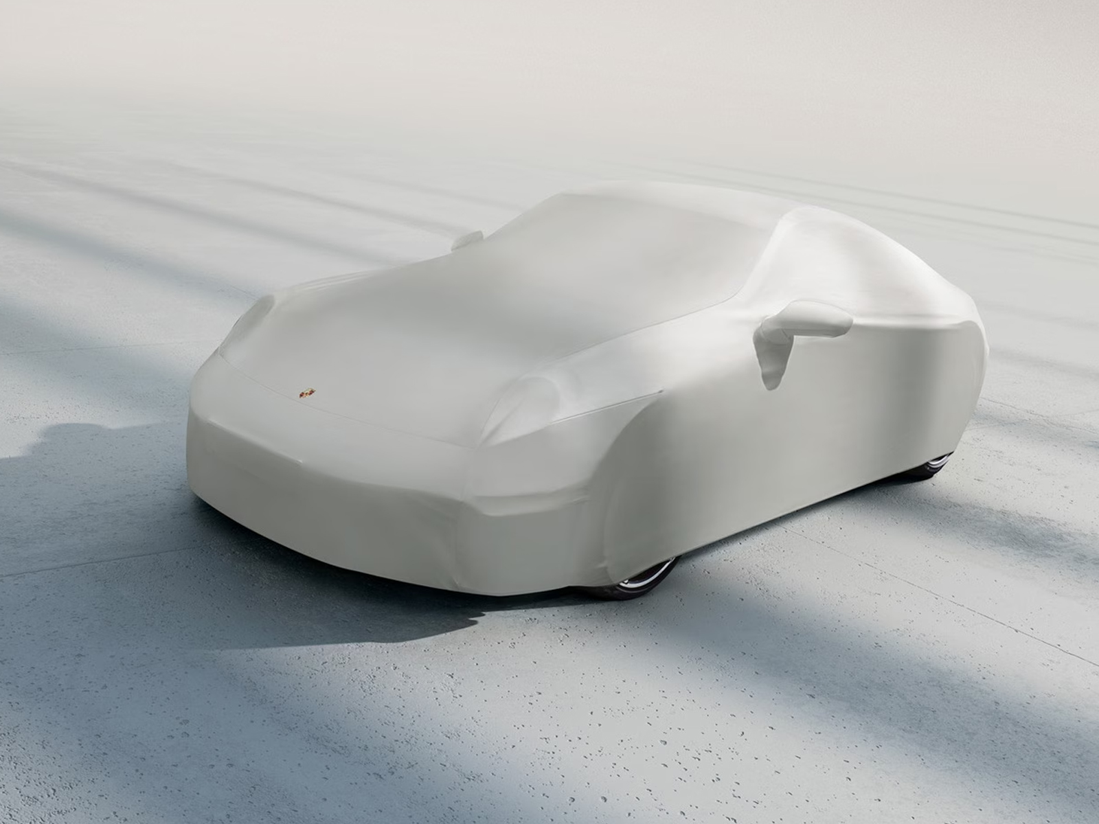 Telo copriauto bianco su misura per interni, realizzato in materiale traspirante, antistatico e resistente allo sporco. Con stemma Porsche colorato e pratica custodia nera per il trasporto.