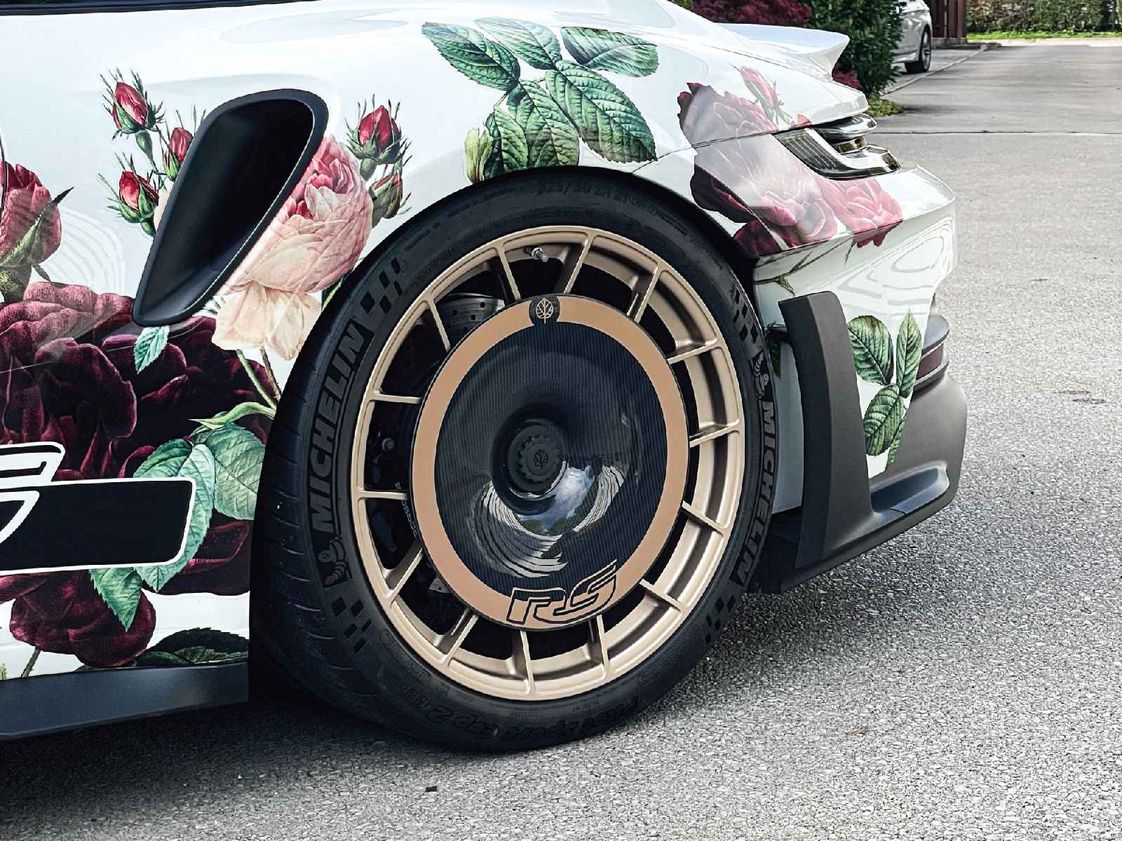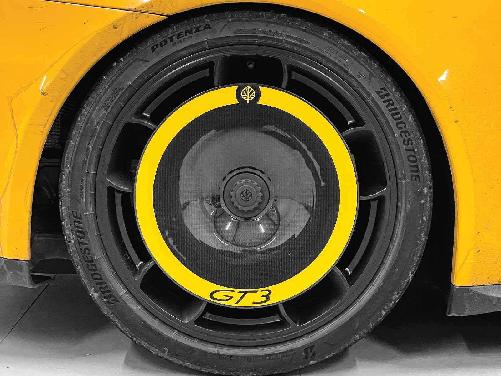 Fibra di carbonio preimpregnata. Polimerizzata in autoclave per la massima rigidità. Leggera ma estremamente durevole. Finitura superficiale resistente ai raggi UV. Progettata specificamente per i cerchi in alluminio della 992.1 GT3 RS. Scelta di finitura opaca o lucida. Decalcomanie opzionali in nero, bianco, argento, oro o colori personalizzati.
