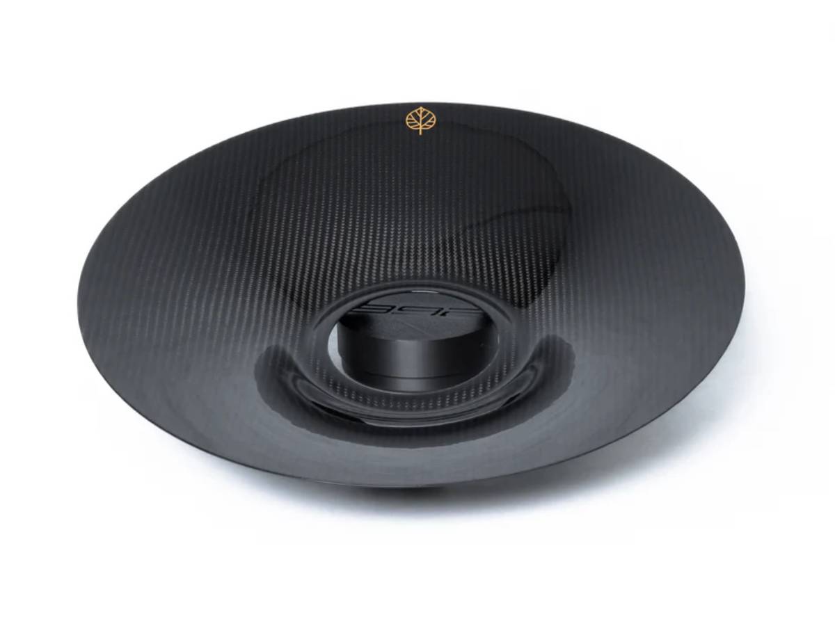 Ogni gruppo Aero Disc è composto da diversi componenti: il disco in fibra di carbonio visibile sulla superficie della ruota e il meccanismo di montaggio nascosto situato tra il disco aerodinamico e il dado di bloccaggio centrale.