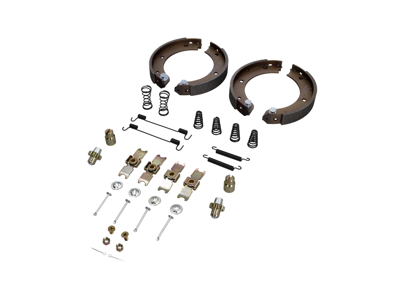 Un set completo di quattro ganasce per il freno di stazionamento a tamburo interno, situato all'interno del disco freno posteriore (sezione a cappello). Queste ganasce si espandono meccanicamente per mantenere ferma l'auto quando si aziona la leva del freno a mano.