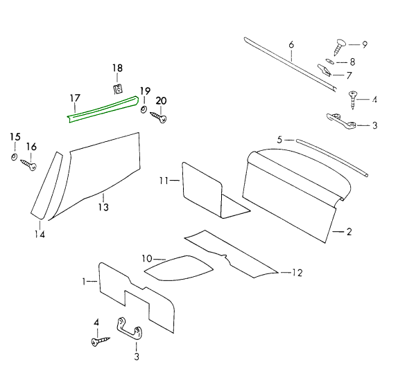 Pannelli porta completi pronti per l'installazione per tutti i modelli Porsche 356 Cabriolet delle serie A, B e C 1956–1965 , disponibili in pelle Nappa Porsche o vinile classico Porsche con tasche per mappe pieghettate originali. Non adatto per i modelli Cabrio D e Roadster.
