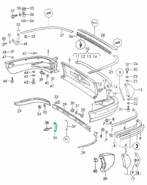 Tutti i dispositivi di fissaggio, le clip e la ferramenta essenziali per un'installazione sicura e corretta in fabbrica delle modanature e delle coperture del paraurti posteriore Porsche.