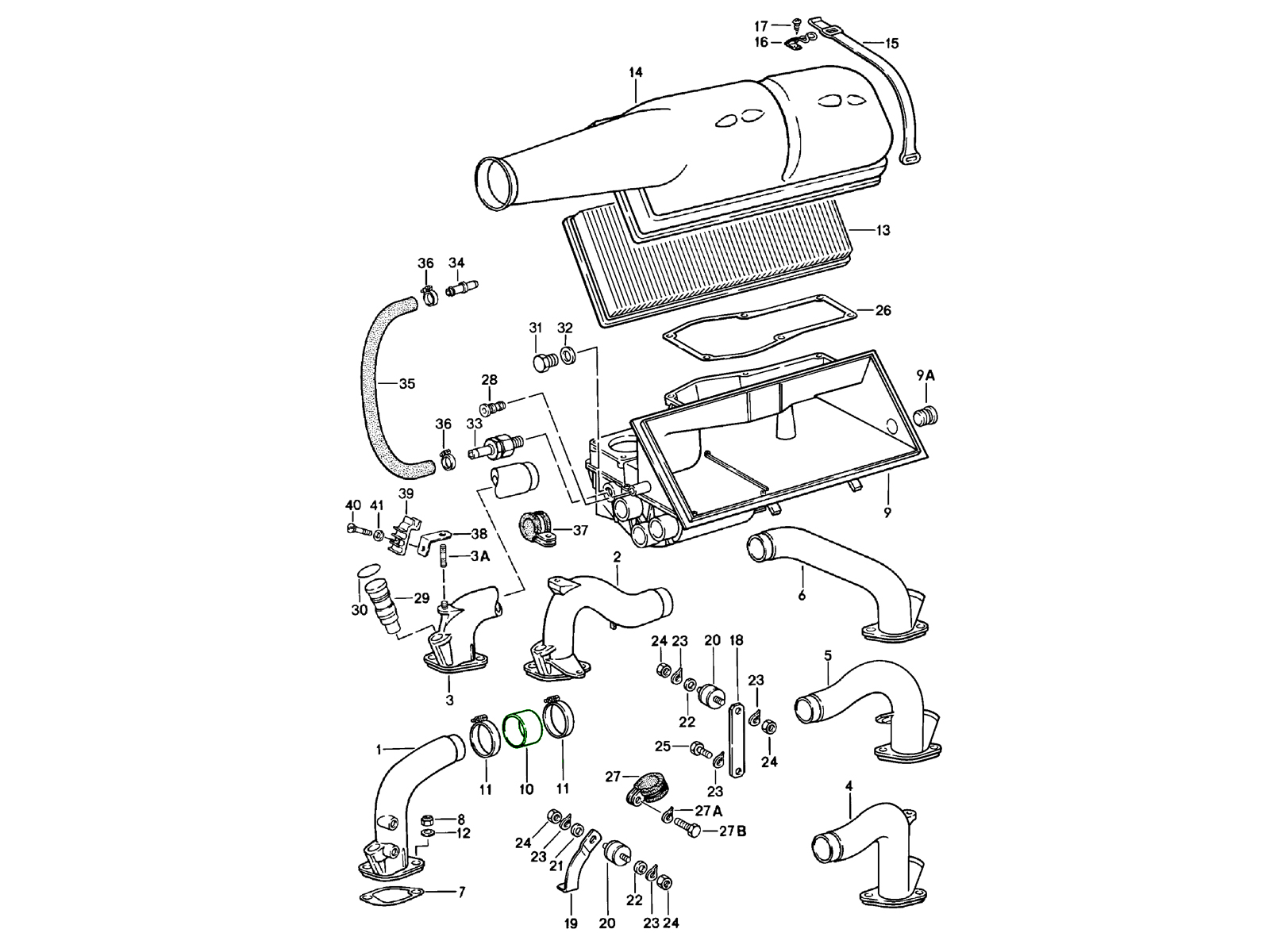 Il manicotto in gomma Porsche per aspirazione aria è un ricambio originale OEM progettato per garantire una connessione sicura e a tenuta stagna all'interno del sistema di aspirazione aria. Utilizzato sui modelli Porsche 928 classici (1978-1984) e su alcuni modelli 911 SC (1978-1979), questo manicotto in gomma collega i componenti rigidi dell'aspirazione, assorbendo al contempo vibrazioni e movimenti.