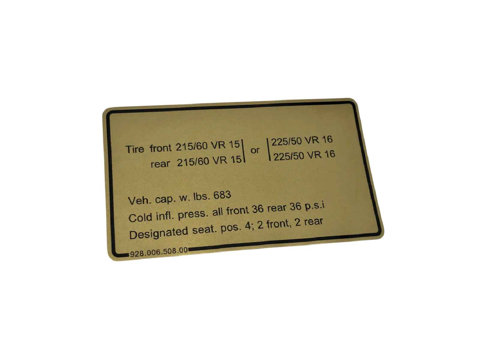 Adesivo di alta qualità per la pressione degli pneumatici, riproduzione fedele, progettato per i modelli Porsche 928 statunitensi, da applicare all'interno del tappo del serbatoio.