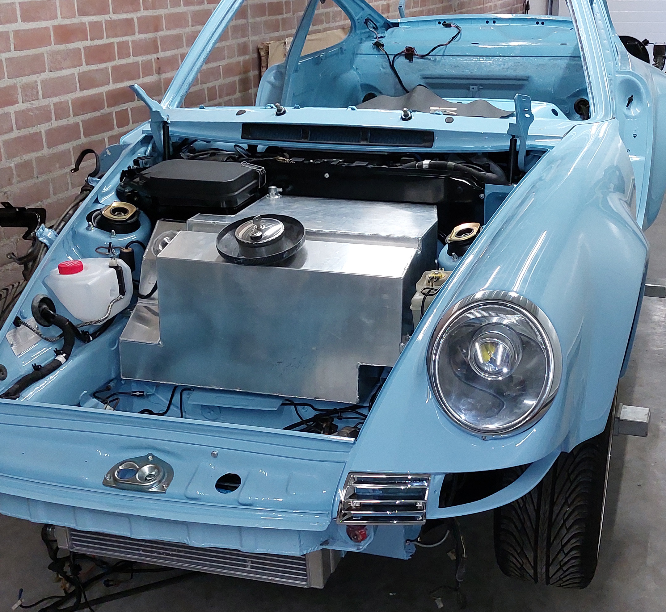 Serbatoio carburante in alluminio da 90 litri fatto a mano per modelli 964 o 993. Look retrò RSR o per dare un tocco retrò alla tua 911. Con bocchettone di rifornimento al centro del cofano, questo serbatoio è compatibile con l'unità di controllo del livello carburante originale. Disponibile per auto con guida a destra .