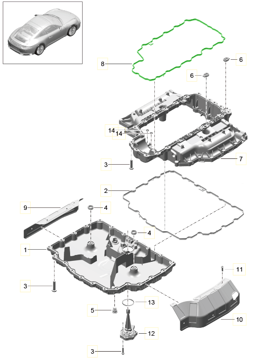 La coppa dell'olio motore, nota anche come coppa dell'olio, è un componente essenziale del sistema di lubrificazione della tua Porsche. Funge da serbatoio principale in cui l'olio motore viene immagazzinato, raccolto e fatto circolare. La coppa garantisce che l'olio venga costantemente fornito a tutti i componenti critici in movimento, mantenendo il raffreddamento, la lubrificazione e la longevità del motore, soprattutto durante la guida ad alte prestazioni.
