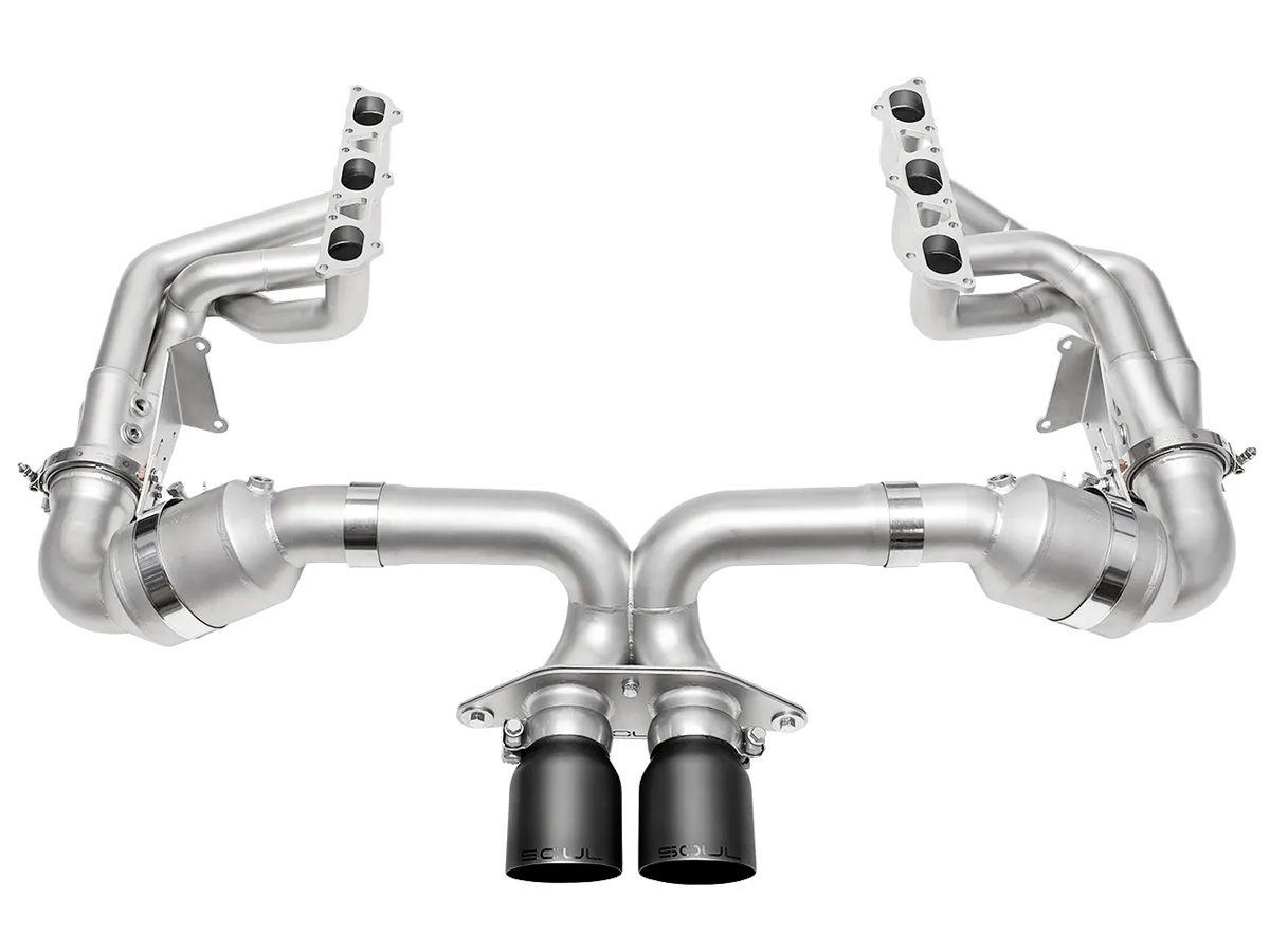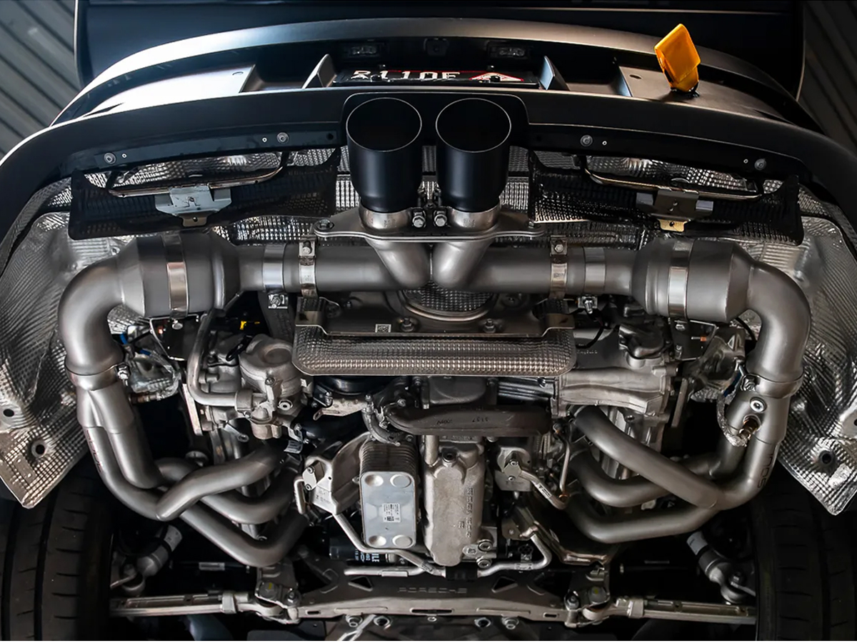 Progettato per la massima potenza e il massimo sound per la 992 GT3 e GT3 RS con sezioni catalizzatrici intercambiabili. I condotti di scarico lunghi e i collettori di scarico lavorati a CNC ottimizzano il flusso attraverso i collettori fino a tubi dritti da 3" con un tubo a X per un sound più acuto e morbido.