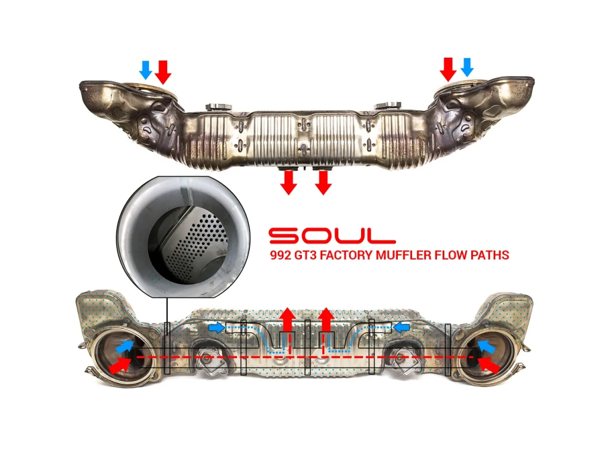 Il sistema di scarico SOUL Race trasforma il sound della 992 GT3 in un'autentica esperienza Cup Car. Il sistema di scarico X-pipe produce un suono acuto, in stile motorsport, offrendo un volume e un timbro da gara estremi per l'uso su strada, ma perfettamente adatti alla guida in pista. Il risultato è una nota di scarico autorevole e da brivido, degna della tradizione Porsche nelle competizioni GT.