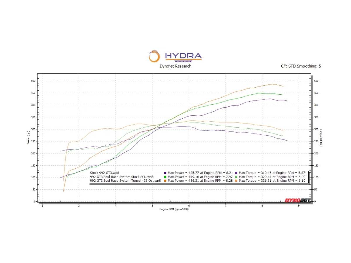 • +60 whp / +26 ft-lbs di coppia massima guadagnata con l'aggiunta di una messa a punto della centralina Hydra Stage 2