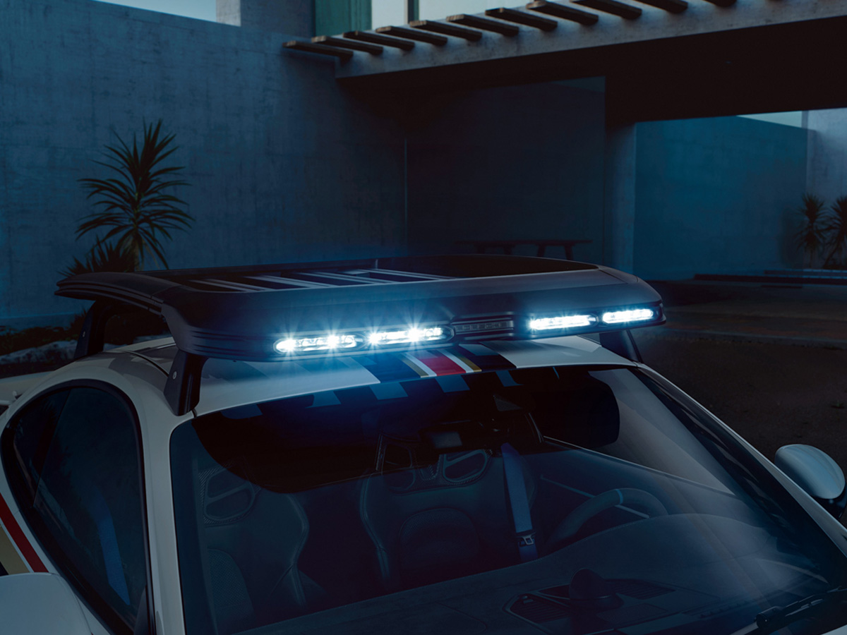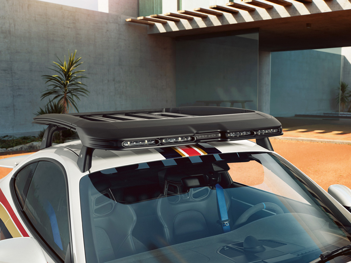 La struttura del telaio in alluminio leggera ma estremamente stabile è verniciata a polvere in nero opaco e presenta un rivestimento anteriore verniciato nero opaco. Il fondo del cestino da tetto è composto da 5 profili longitudinali. I carichi trasportati possono essere fissati individualmente ad essi, ad esempio utilizzando le 2 cinture di ancoraggio e i 4 supporti per cinture in dotazione. Progettato e testato nel centro di sviluppo di Weissach, il cestino da tetto può trasportare 42 kg: spazio ideale per l'attrezzatura da rally più importante.