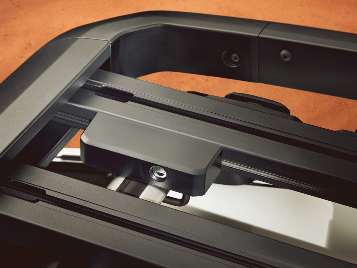 Installare il cestino sul tetto è molto semplice. Innanzitutto viene fissato saldamente alle traverse del supporto base del sistema di trasporto sul tetto. Successivamente è sufficiente collegare la spina magnetica alla presa di serie sul tetto: i fari supplementari a LED sono alimentati e pronti all'uso.