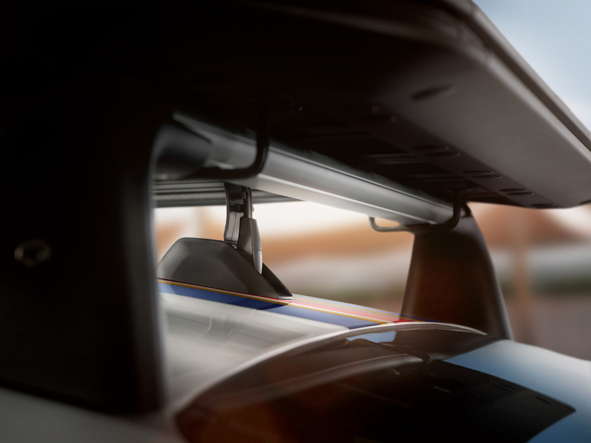Per il cestino sul tetto è disponibile un'ampia gamma di Porsche Tequipment e accessori lifestyle. Questi includono una tanica per benzina e acqua, supporti per taniche, tavole di recupero e supporti per tavole, una borsa da viaggio per esterni idrorepellente, supporti per cinture e cinghie di ancoraggio aggiuntive.