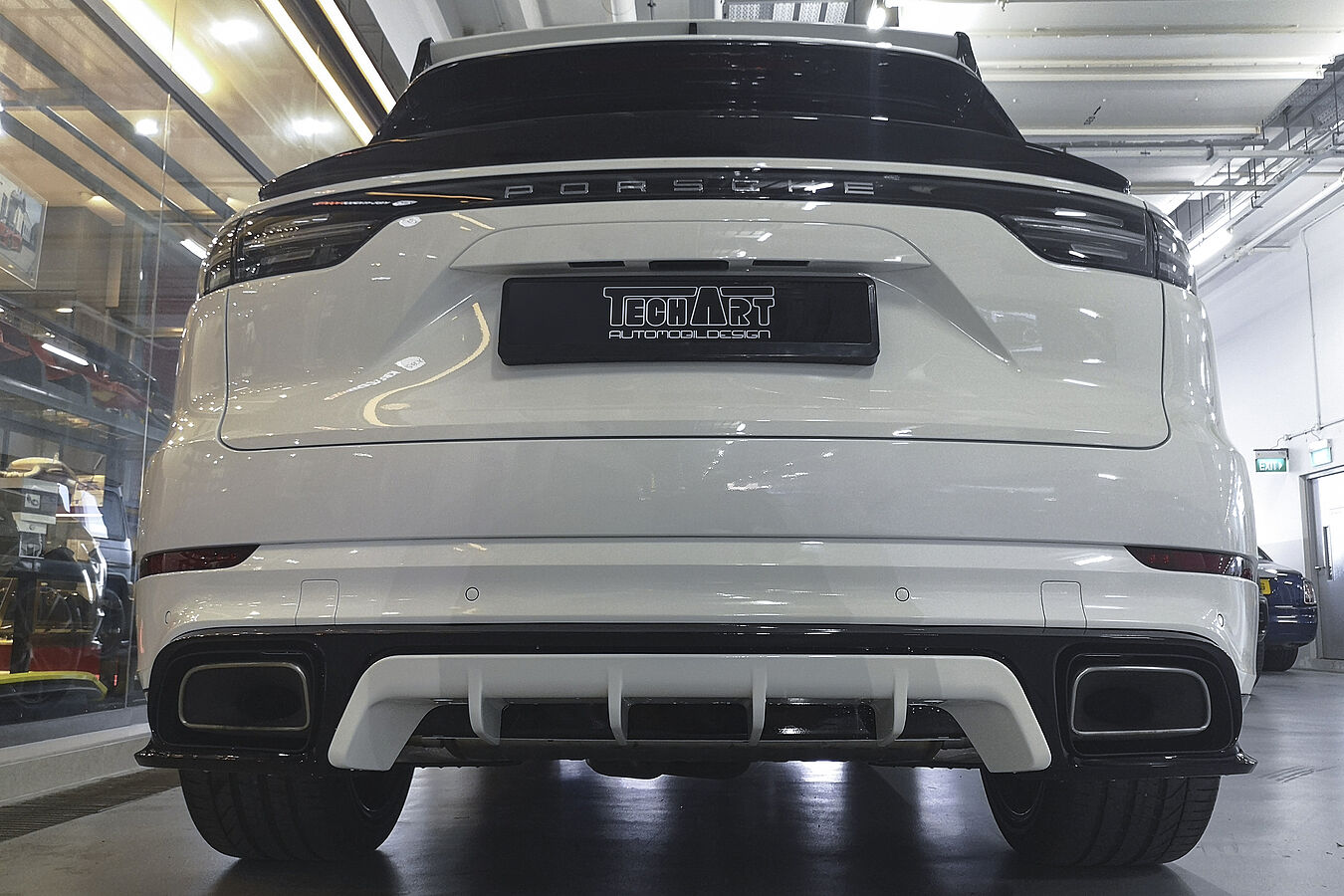 Lo spoiler anteriore TechArt I è un'aggiunta sorprendente che aggiunge contrasto ed esclusività ai modelli Cayenne e Cayenne Coupé. Lo spoiler aggiunge una doppia dose di aggressività con doppie prese d'aria aggiuntive che mettono ulteriormente in risalto la sezione centrale del paraurti anteriore e si estende verso l'esterno per aumentare la deportanza e ridurre il sollevamento dell'asse anteriore.