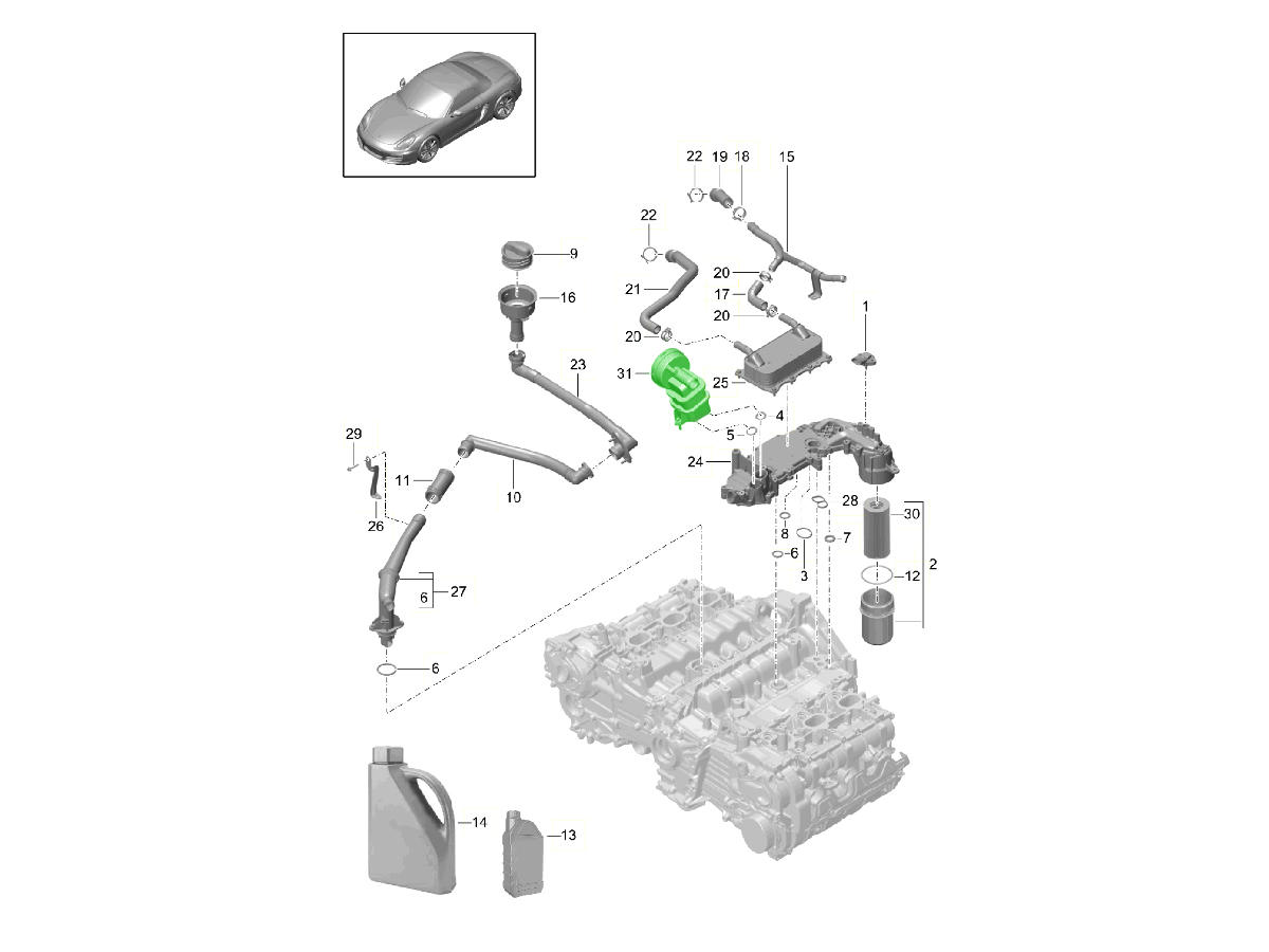 Il separatore aria-olio originale Porsche è l'unità specificata in fabbrica, responsabile della separazione della nebbia d'olio dai gas di blow-by del basamento nei moderni motori Porsche boxer a 6 cilindri. Come parte del sistema PCV, garantisce una ventilazione pulita, una pressione stabile nel basamento e un corretto controllo dell'olio, fondamentali per proteggere il sistema di aspirazione e mantenere prestazioni ottimali del motore.
