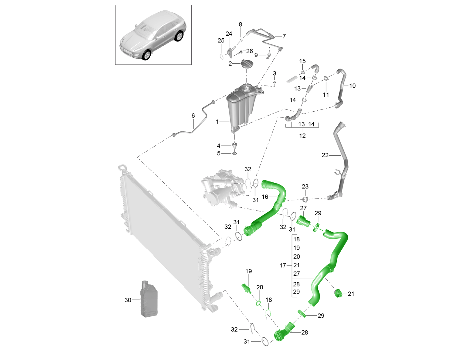 Sistema di raffreddamento del liquido di raffreddamento/vaso di espansione del liquido di raffreddamento (modello: CTMA,CTM, CTLA,CTL, DCNA,DCN, DHKA,DHK) 95B.1 Macan 3.0L / 3.6L 2014-18 105-040
