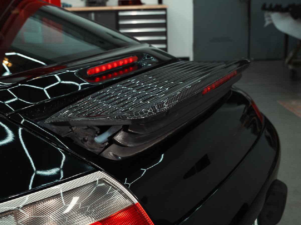 - Vervang de standaard achterspoiler door een exemplaar met lamellen van koolstofvezel.