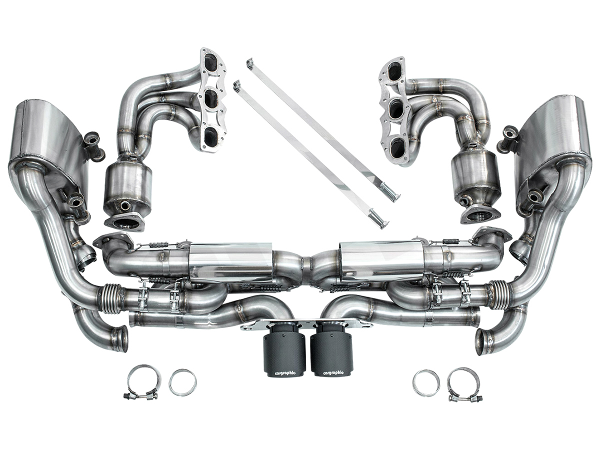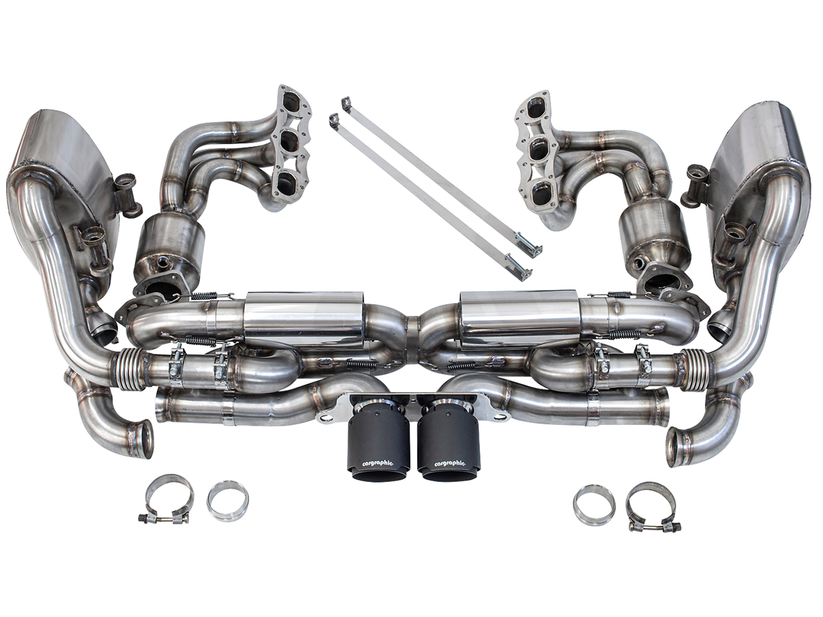 CARGRAPHIC Sportuitlaatsysteem met GT3-look uitlaatpijp in het midden, cilinderkop achter met uitlaatkleppen.
