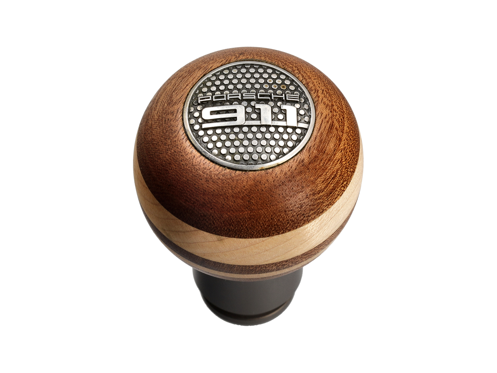 Het kroonjuweel van deze pookknop is de zilveren bovenkant met patroon, met Porsche 911 erin gestempeld.