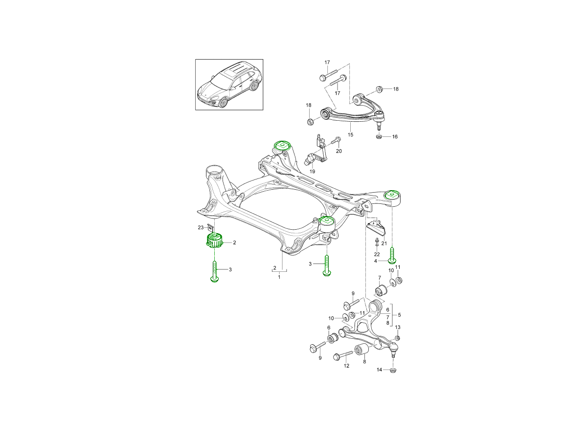 Deze complete montageset voor het achterste subframe is ontworpen voor de Porsche Cayenne 955, 957 en 958 modellen.