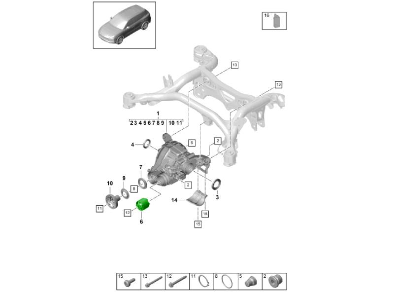 Deze rubberen bus voor het achterasdifferentieel is een origineel Porsche 9YA / 9YA.2 Cayenne-onderdeel dat is ontworpen om het achterdifferentieel stevig te ondersteunen en tegelijkertijd trillingen en geluid te isoleren. Deze rubberen bus, geplaatst tussen het differentieel en het subframe, absorbeert bewegingen van de aandrijflijn en helpt de juiste uitlijning onder belasting te behouden.