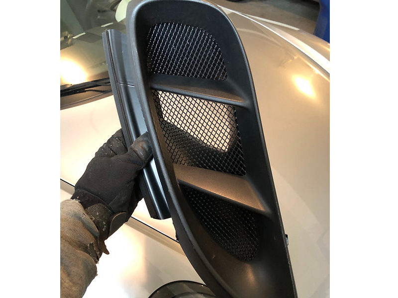 With the current design, the radiators are completely exposed and become magnets for road debris, leaves, and rocks. The fins on the radiator or condenser will quickly become damaged or plugged translating into big dollar repairs. The only way to stop the inevitable damage to the radiators and condensers on your Porsche and avoid replacement costs is to install a Rennline Radiator Protection Grill Kit.