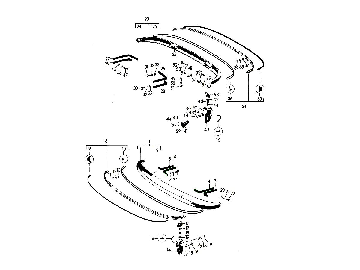 This set is manufactured replacement kit designed for the front bumper mounting of Porsche 356 (mid 1952-55) and Porsche 356A (1955-59) vehicles. These brackets replicate the original geometry, drilling, and mounting hardware specification so your bumper aligns perfectly, sits securely, and retains classic appearance.