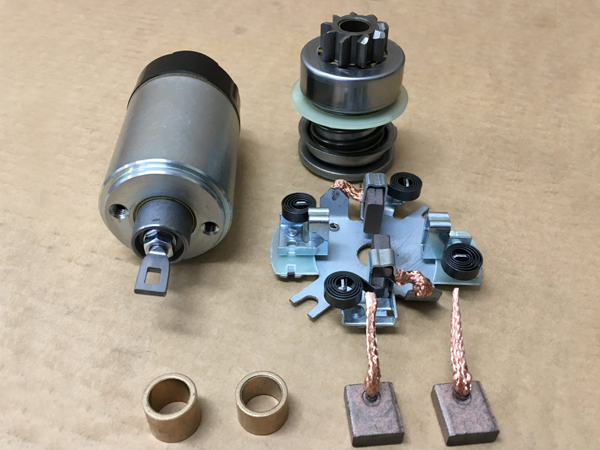 Kit contains: 1 Brush set (4 pieces), 1 solenoid cap, 2 bushings and 1 drive. Set fits on all 6 volt starters with the round solenoid.